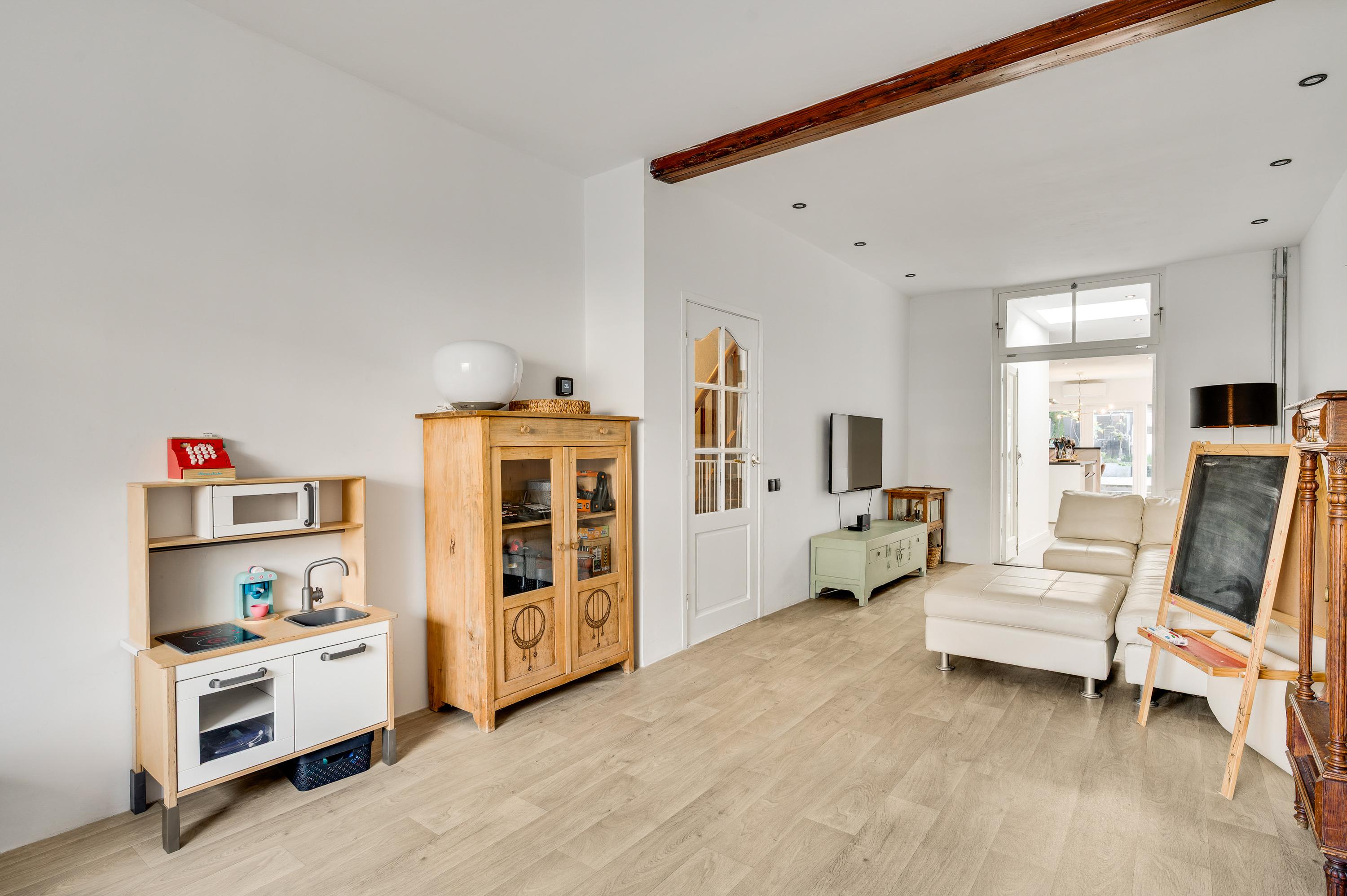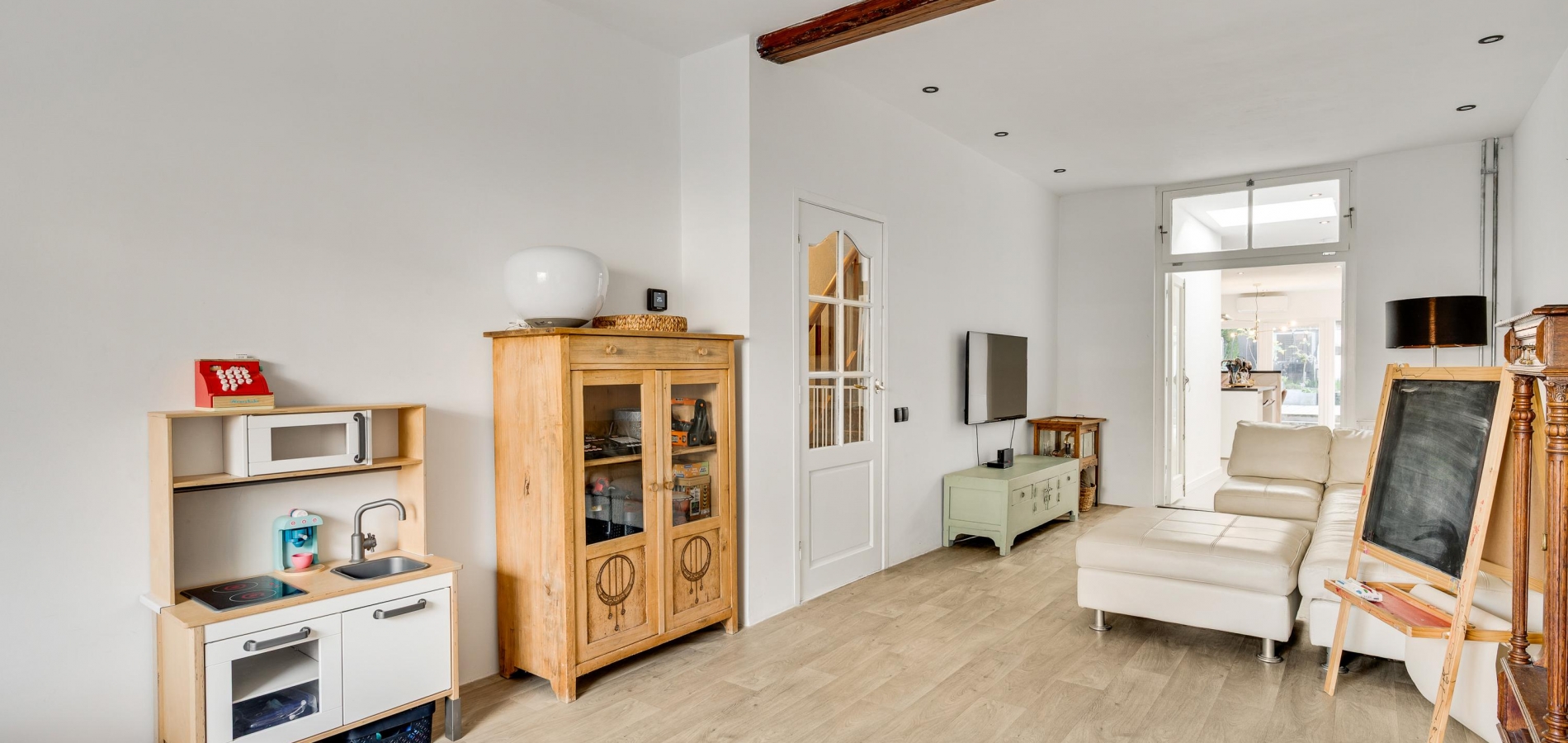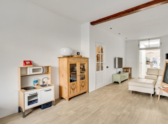 Vanuit de hal heeft u toegang tot de woonkamer (circa 26,3 m2) met een open haard (niet in gebruik), inbouwverlichting en een lichte vinylvloer. Omdat de eettafel in de keuken staat, kan de woonkamer geheel als zitkamer worden ingedeeld. Het voorste deel is nu in gebruik als speelplek van de jongste bewoners.