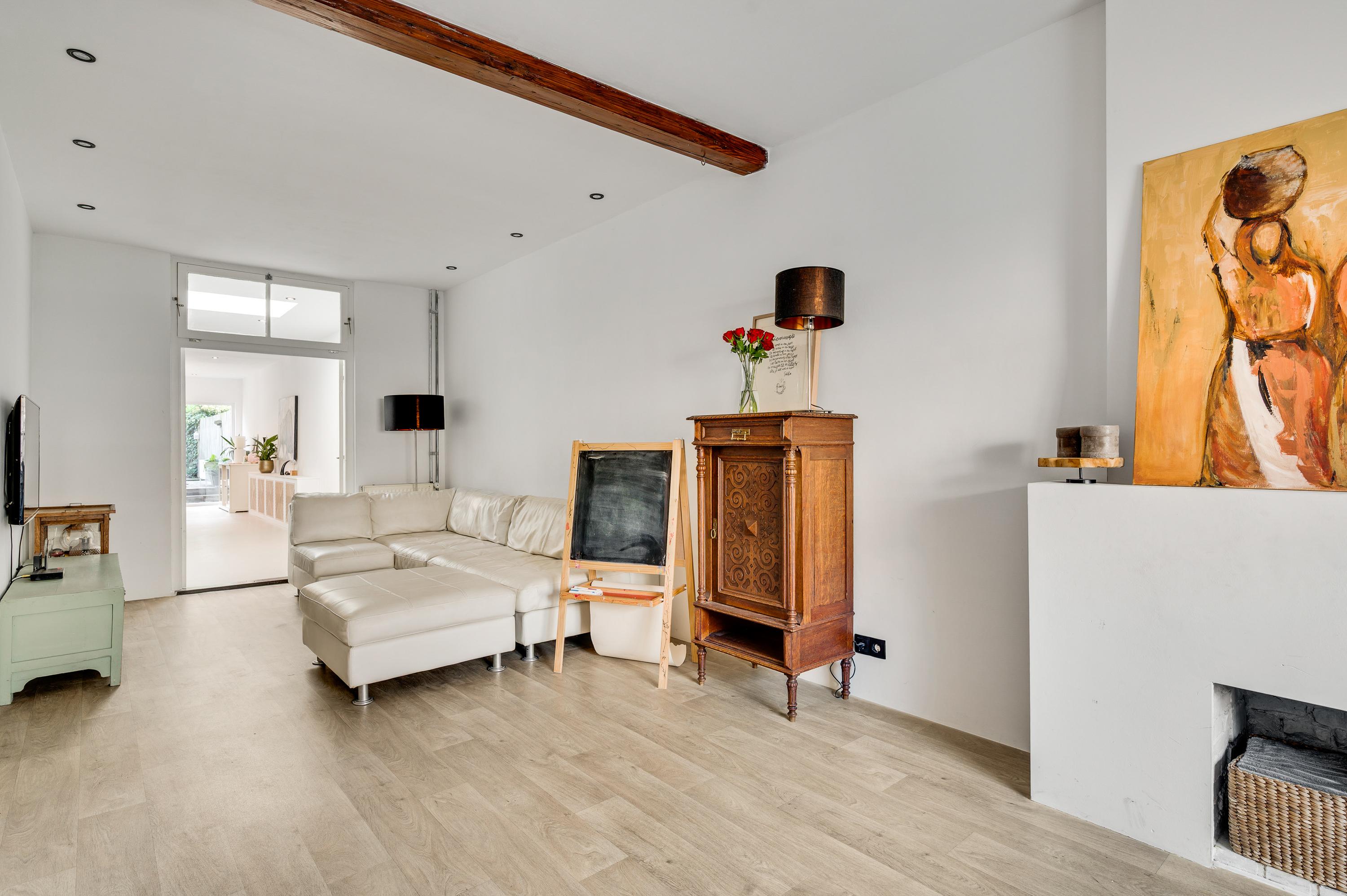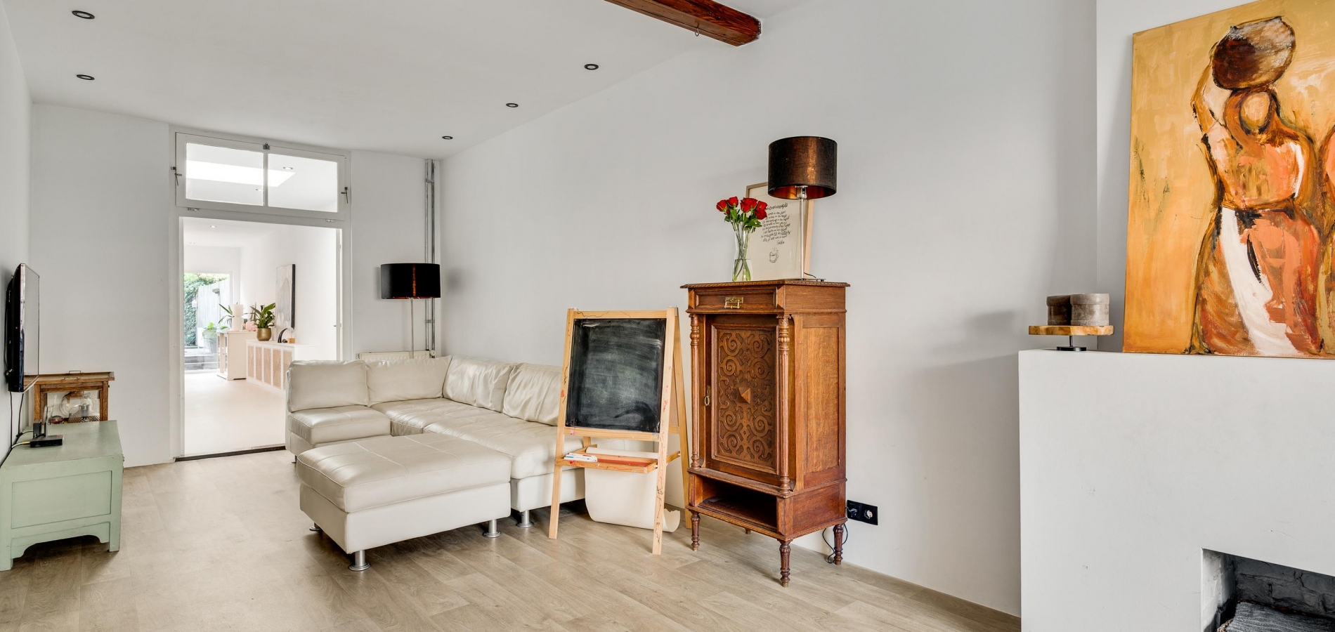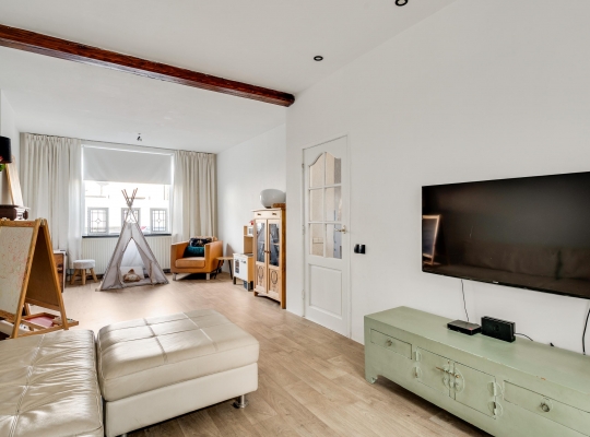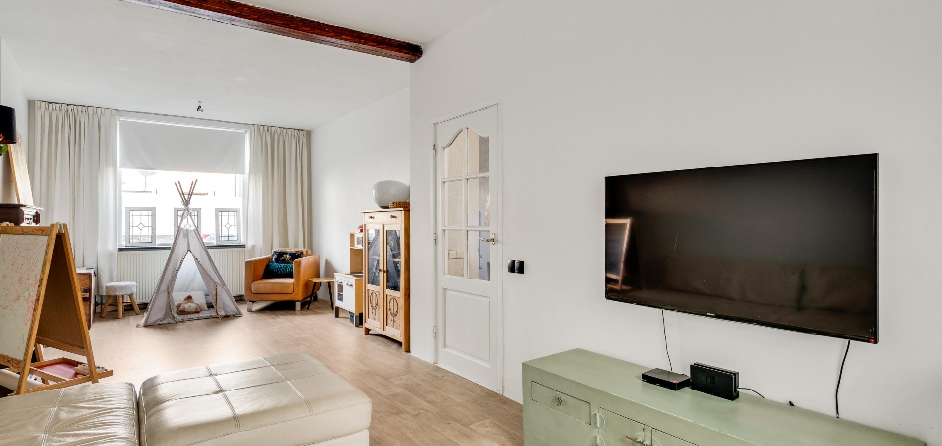Vanuit de hal heeft u toegang tot de woonkamer (circa 26,3 m2) met een open haard (niet in gebruik), inbouwverlichting en een lichte vinylvloer. Omdat de eettafel in de keuken staat, kan de woonkamer geheel als zitkamer worden ingedeeld. Het voorste deel is nu in gebruik als speelplek van de jongste bewoners.