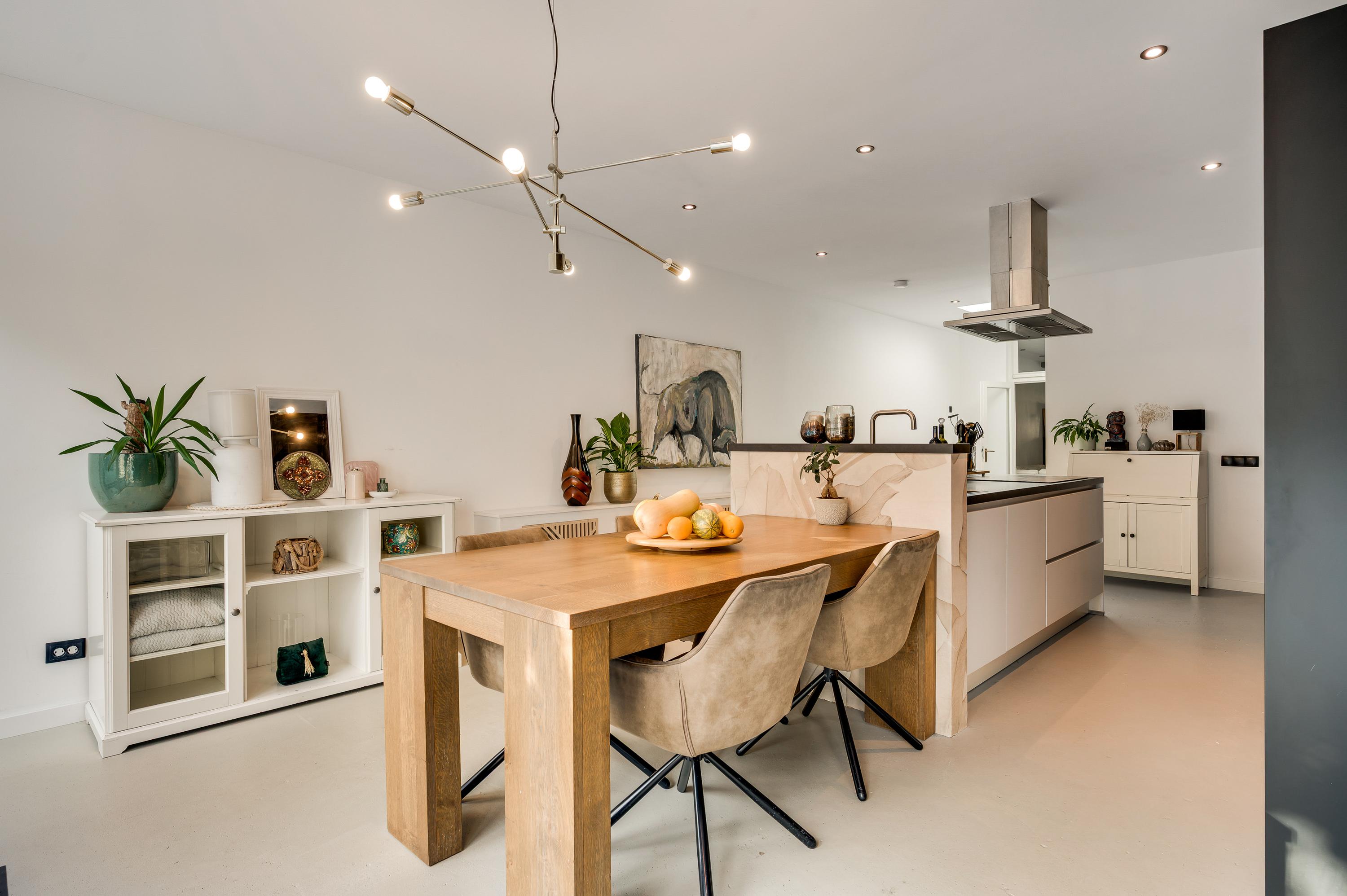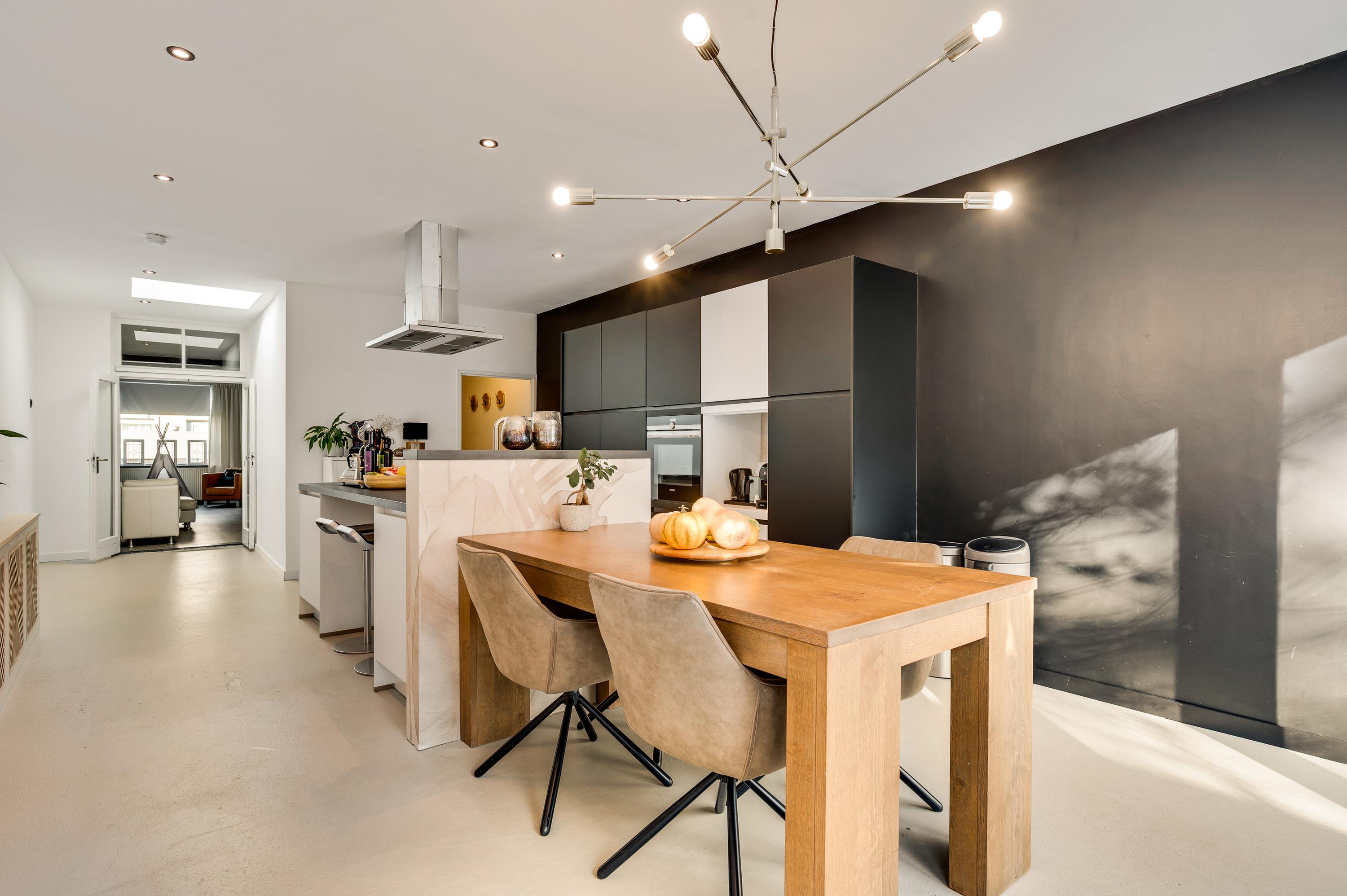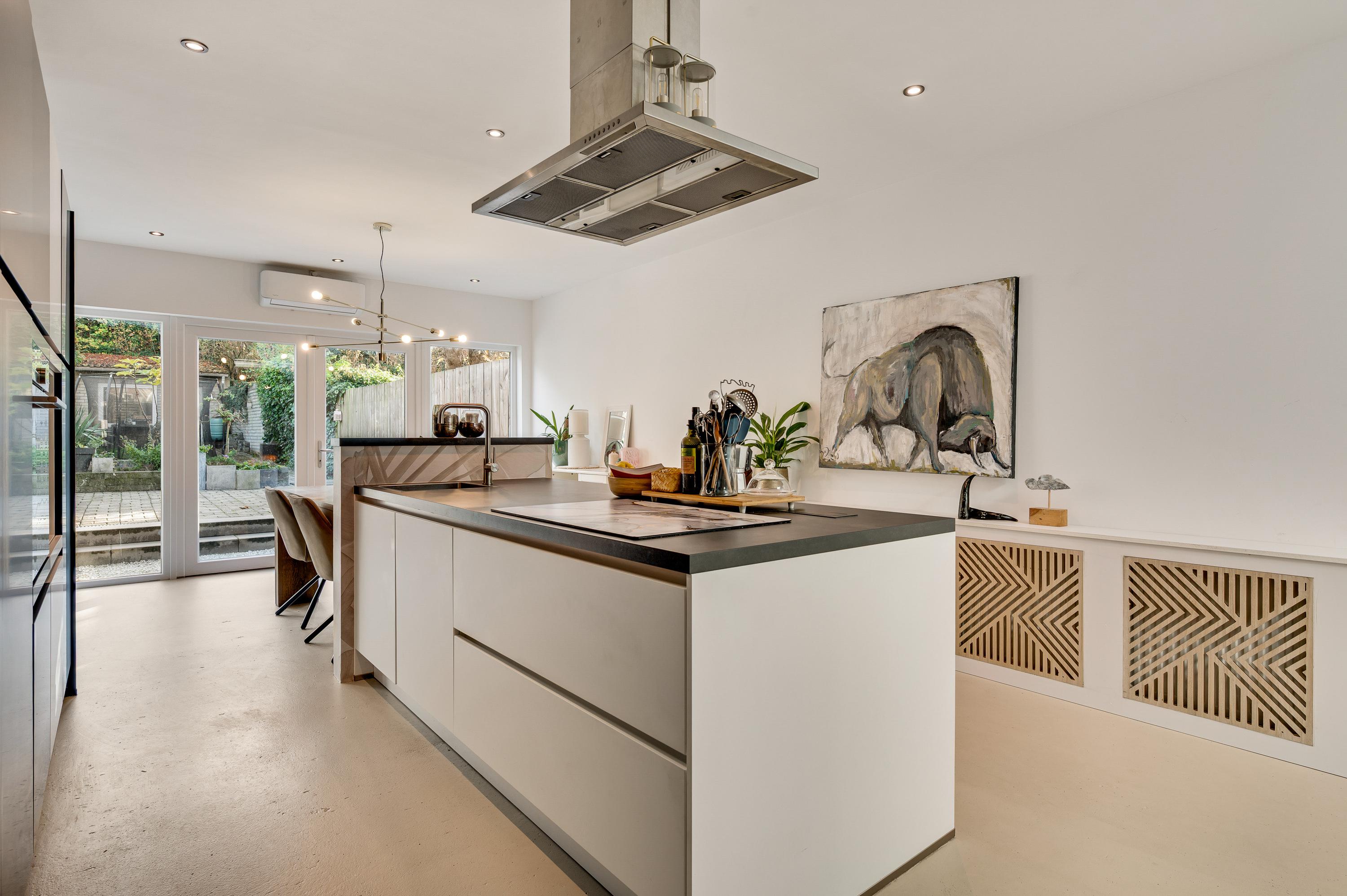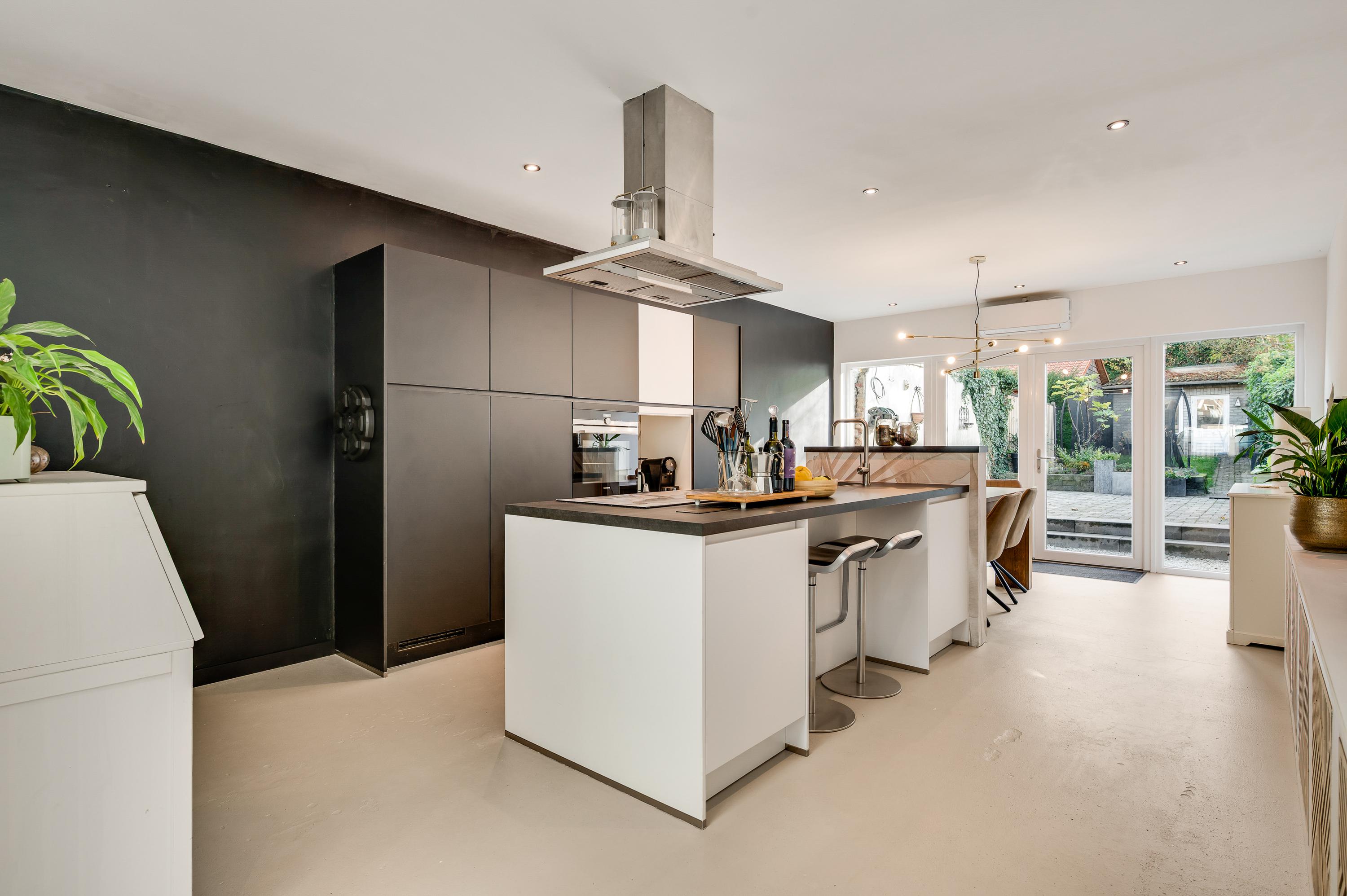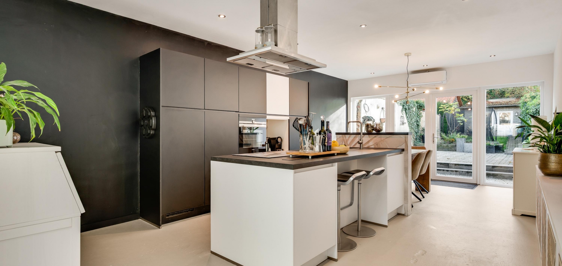 Het hart van de begane grond is de leefkeuken (circa 35,5 m2), met ramen tot vloerhoogte en openslaande deuren naar de tuin. Boven de tuindeuren hangt een airco-unit, die kan koelen en verwarmen. In 2022 is de fraaie keukenopstelling met eiland geplaatst, uitgevoerd in wit en zwart. De inductie kookplaat, afzuigkap, oven, vaatwasser en koelkast zijn ingebouwd.