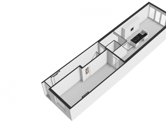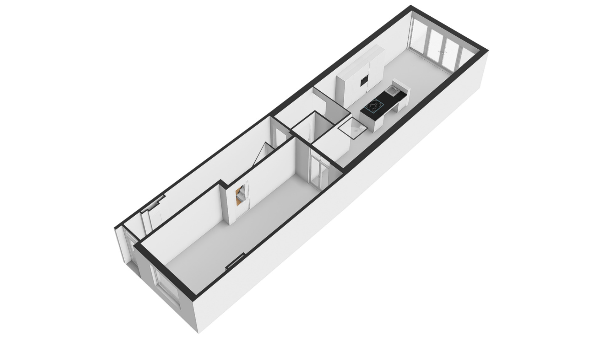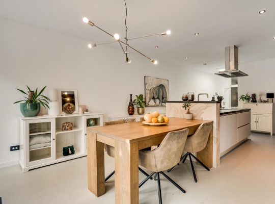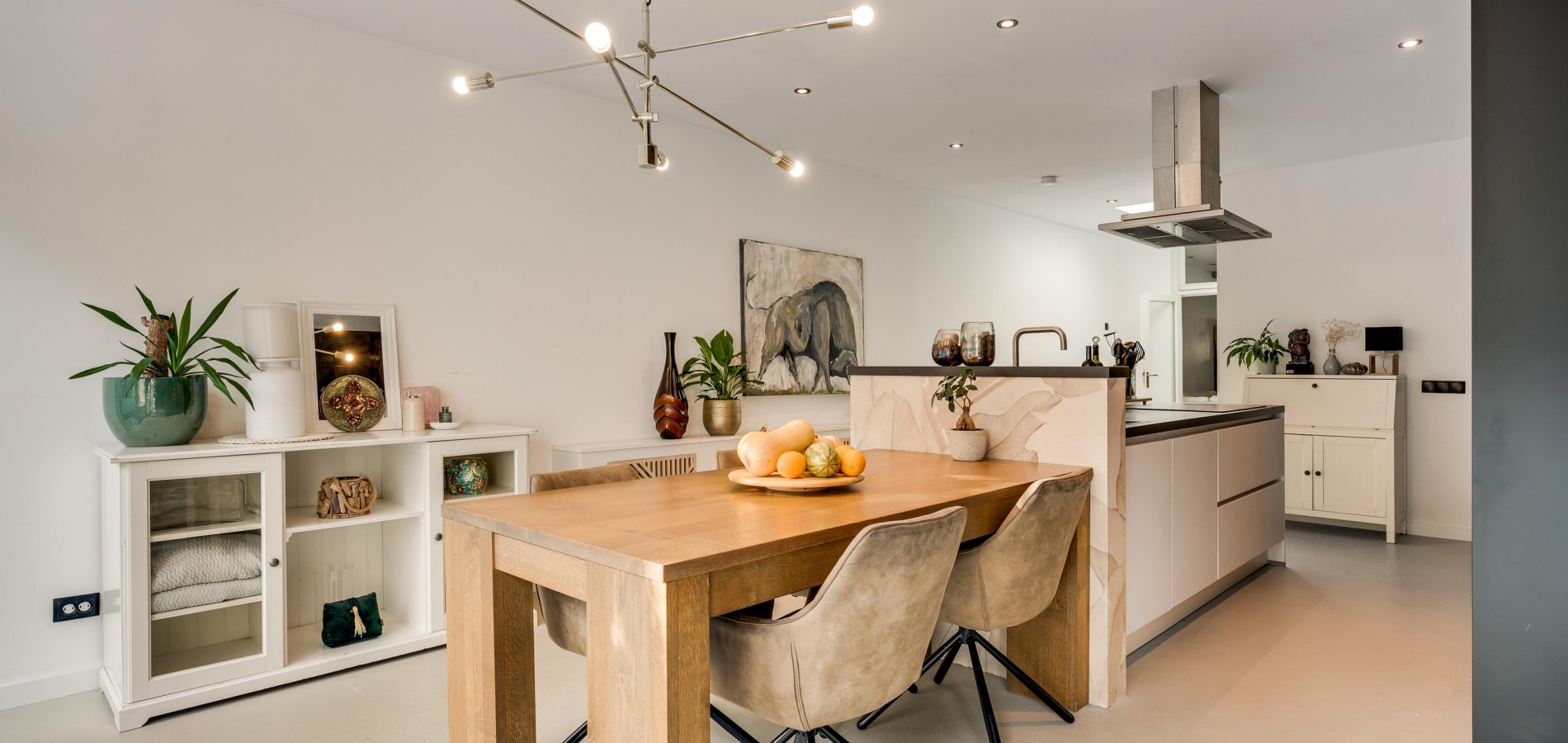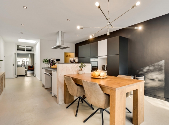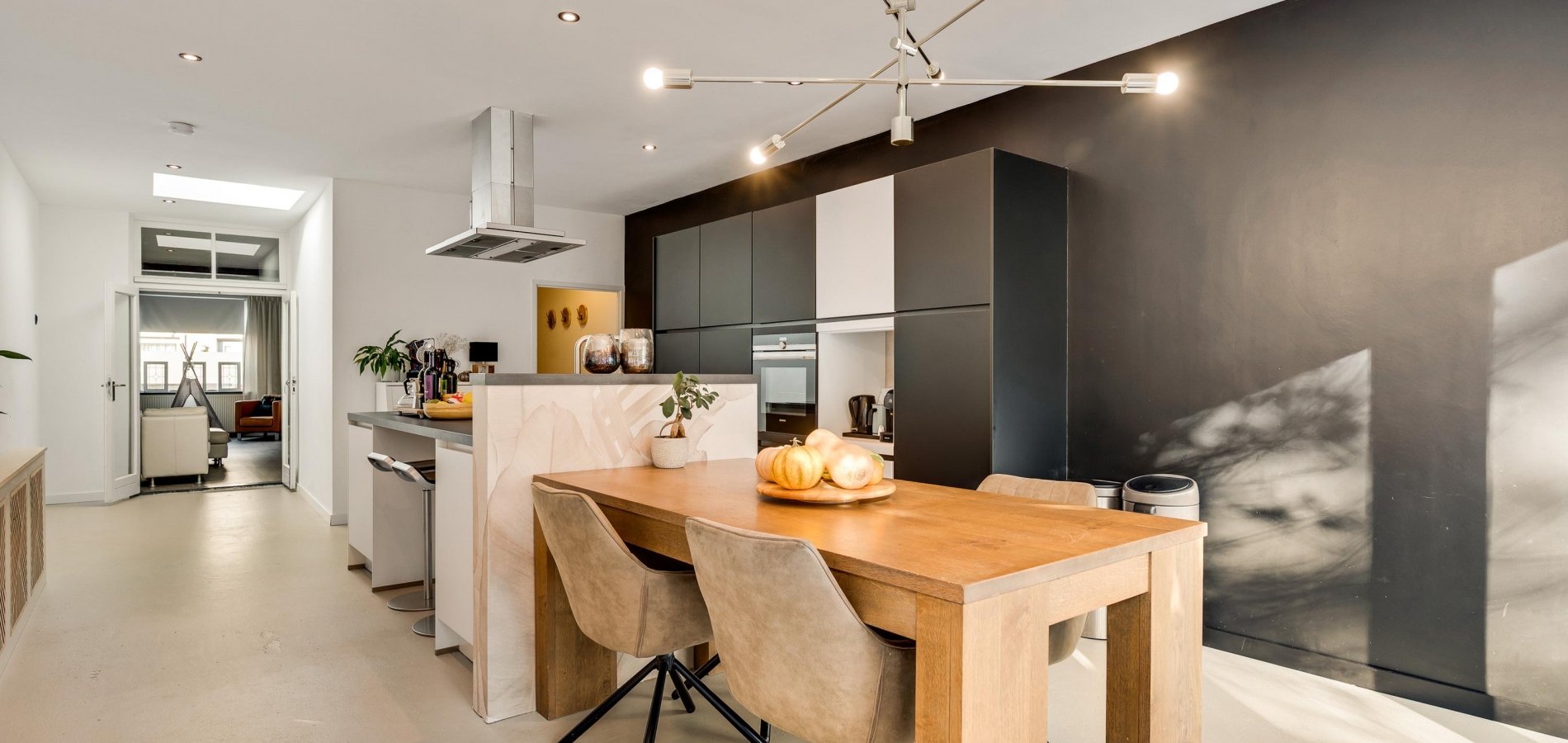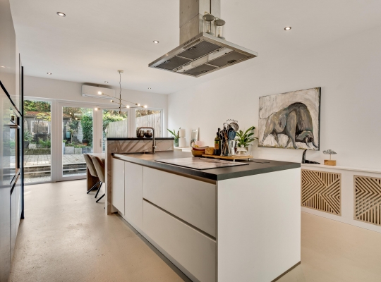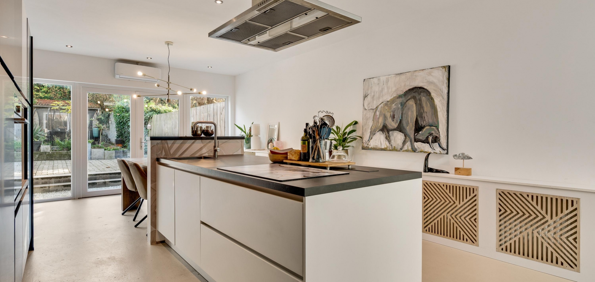 Het hart van de begane grond is de leefkeuken (circa 35,5 m2), met ramen tot vloerhoogte en openslaande deuren naar de tuin. Boven de tuindeuren hangt een airco-unit, die kan koelen en verwarmen. In 2022 is de fraaie keukenopstelling met eiland geplaatst, uitgevoerd in wit en zwart. De inductie kookplaat, afzuigkap, oven, vaatwasser en koelkast zijn ingebouwd.