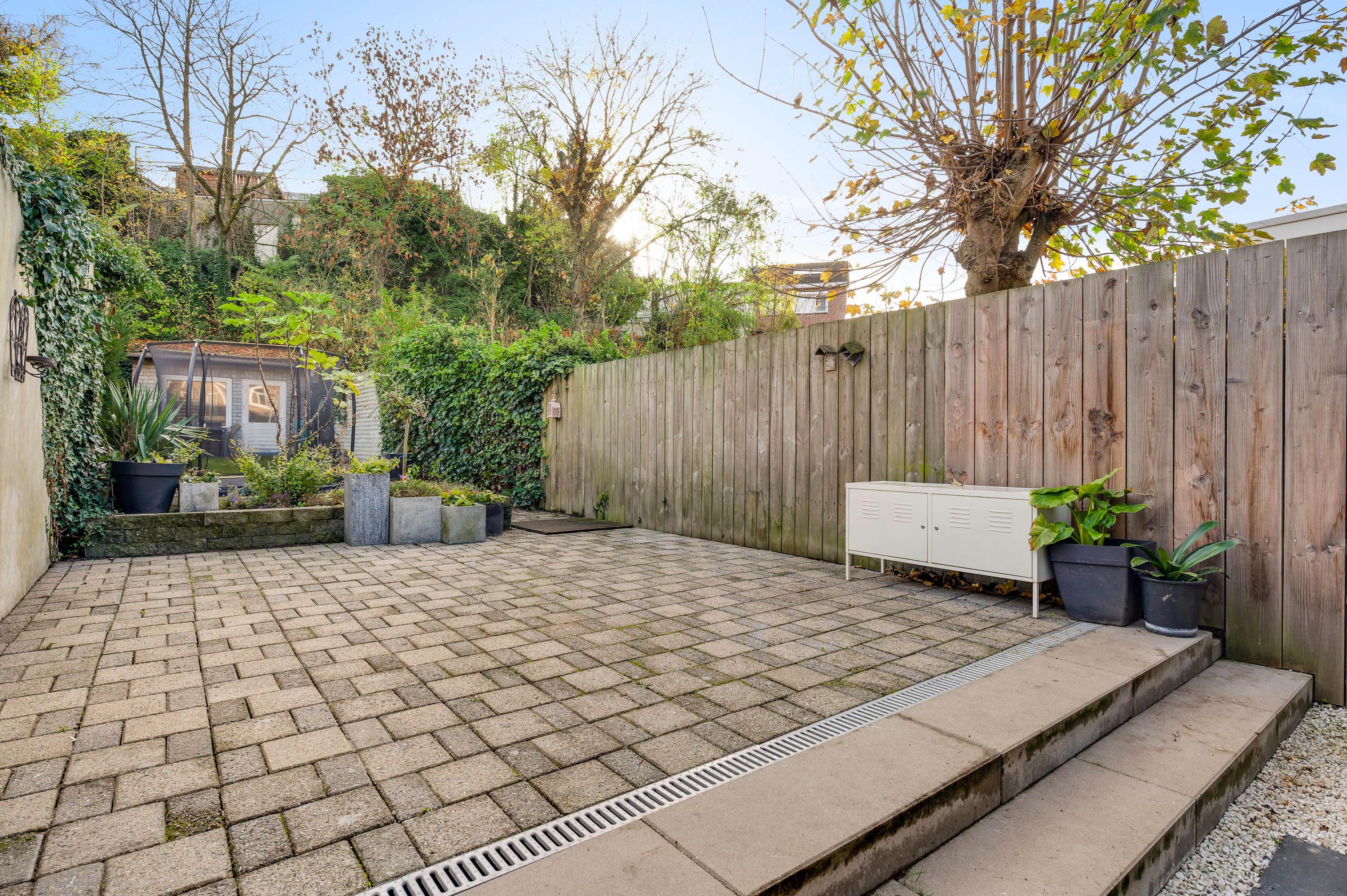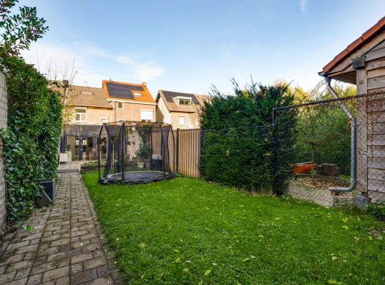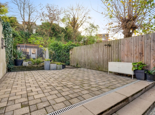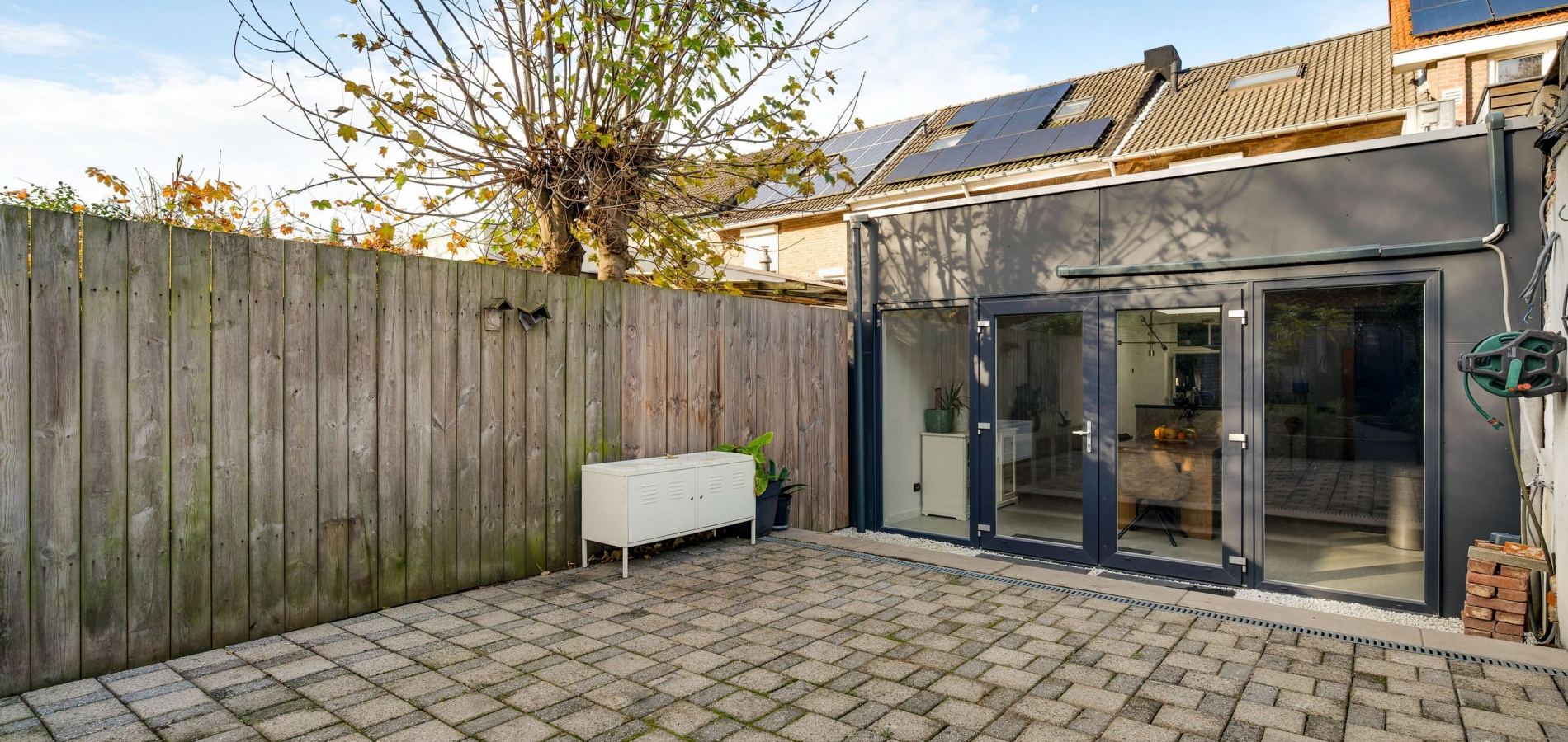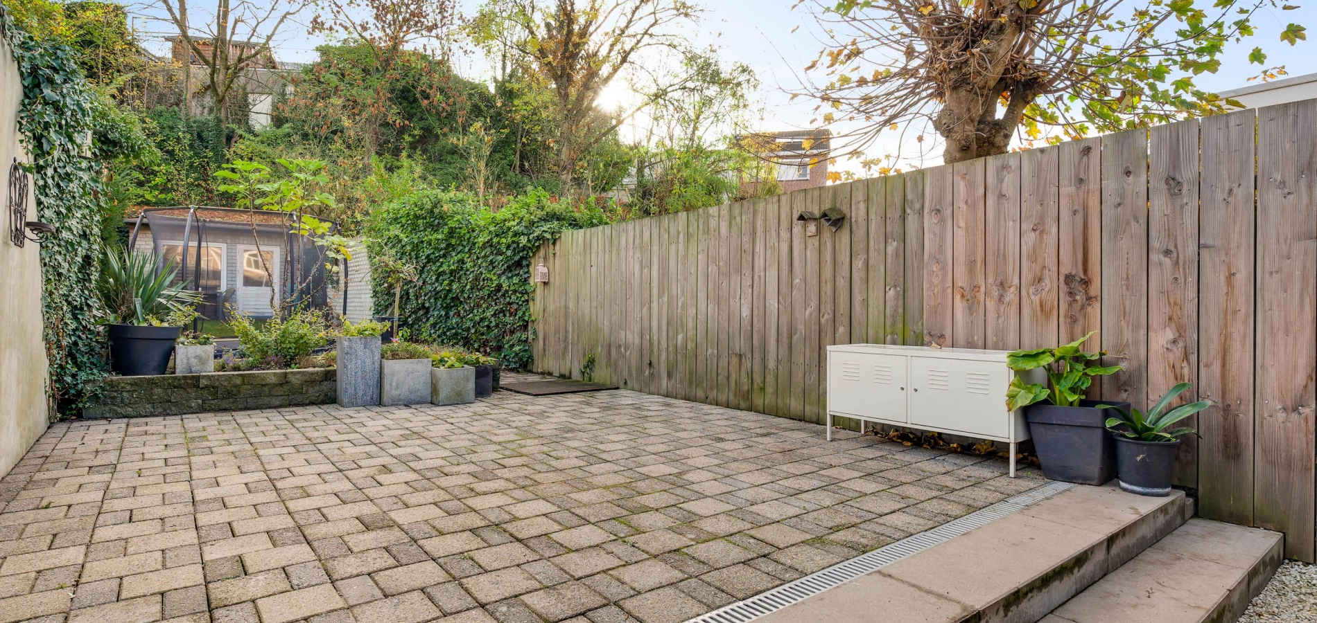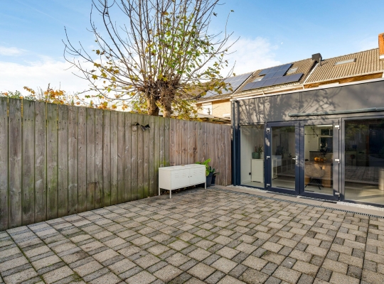 Ondanks de grote aanbouw heeft deze woning een diepe tuin, gesitueerd op het oosten. Het terras is van groot formaat en het tweede, groene deel van de tuin is nu een fijne speelplek voor de kinderen. In de stenen berging (circa 3,05 x 3,05) is genoeg plek voor het tuin- en klusgereedschap.