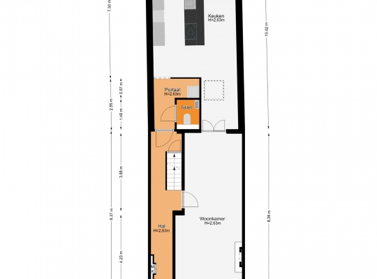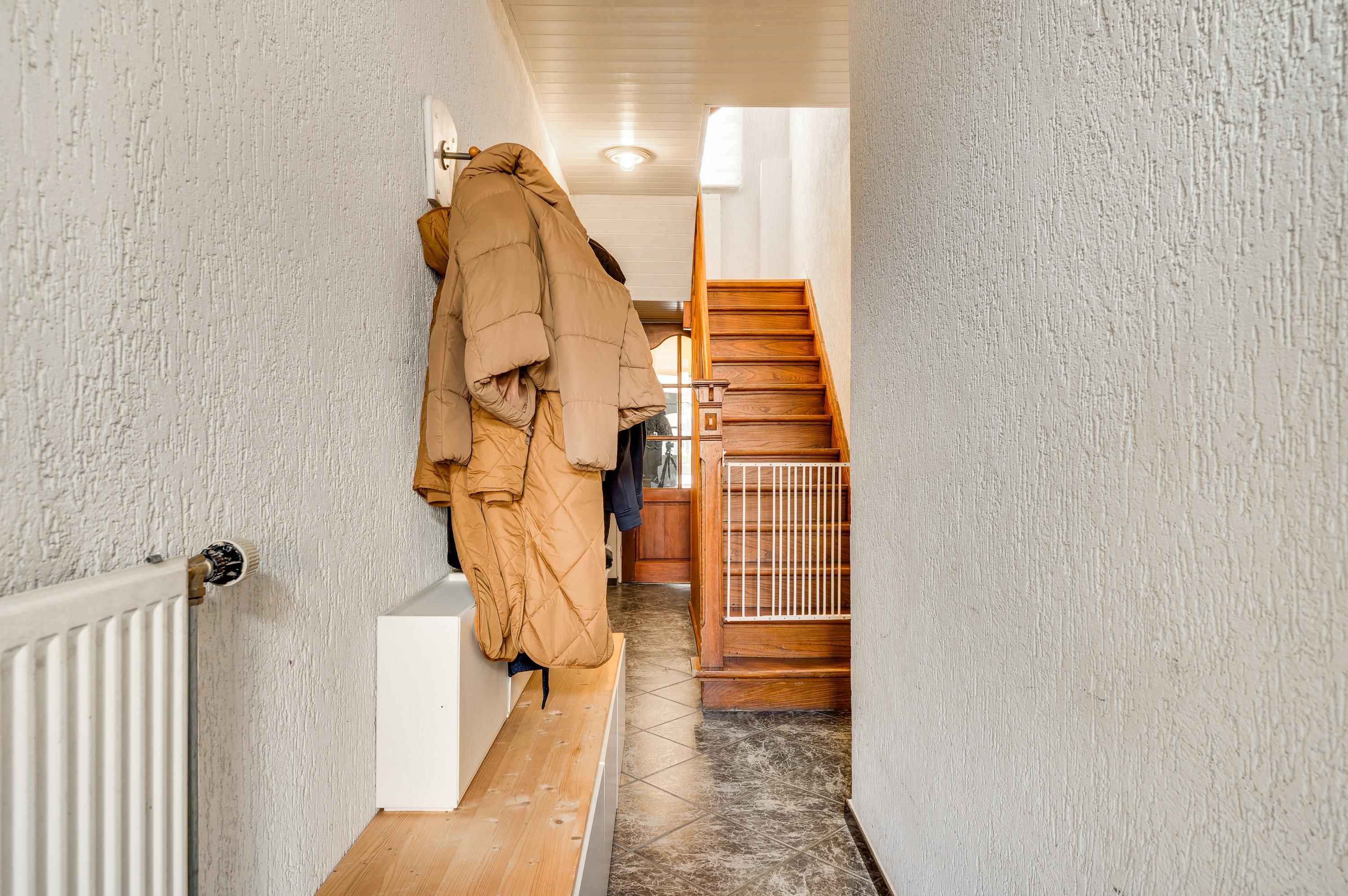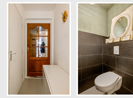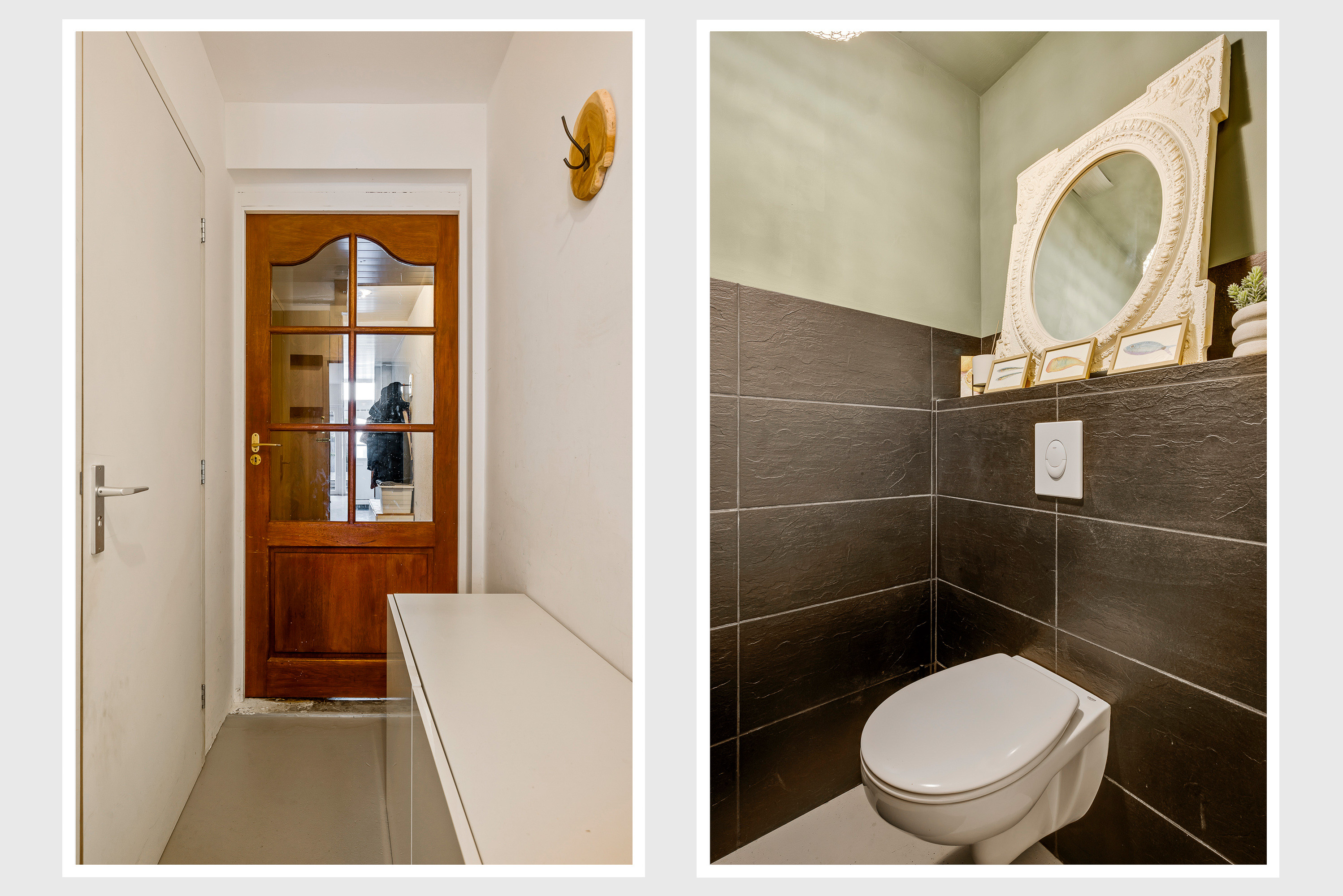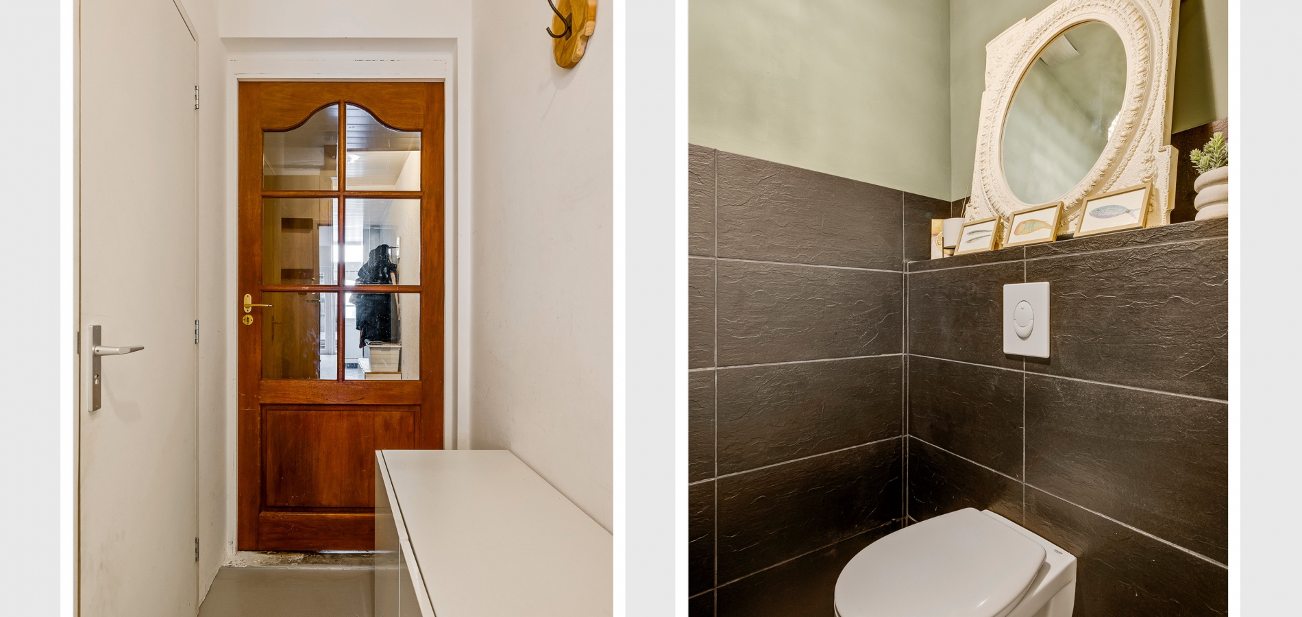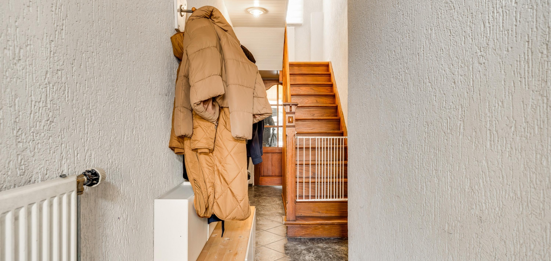 De kunststof voordeur geeft toegang tot de meer dan 8,30 meter lange hal. Er liggen tegels op de vloer en de fraaie bordestrap is behouden. Het hoge plafond, in een lichte kleur, maakt de hal optisch groter. In het verlengde van de hal is een portaal met de toiletruimte en een nis voor de wasapparatuur.