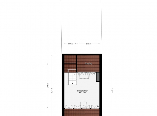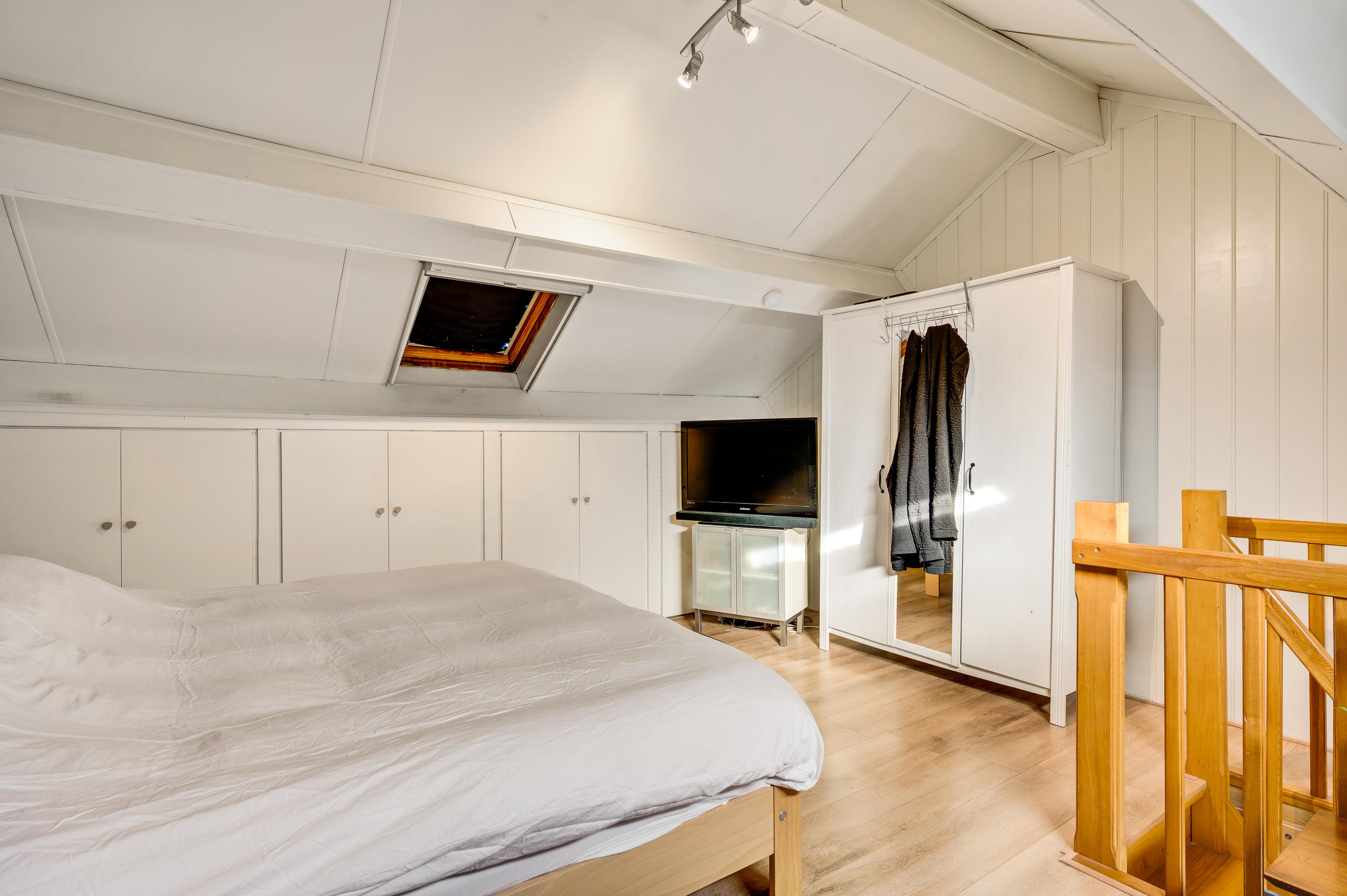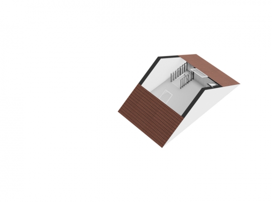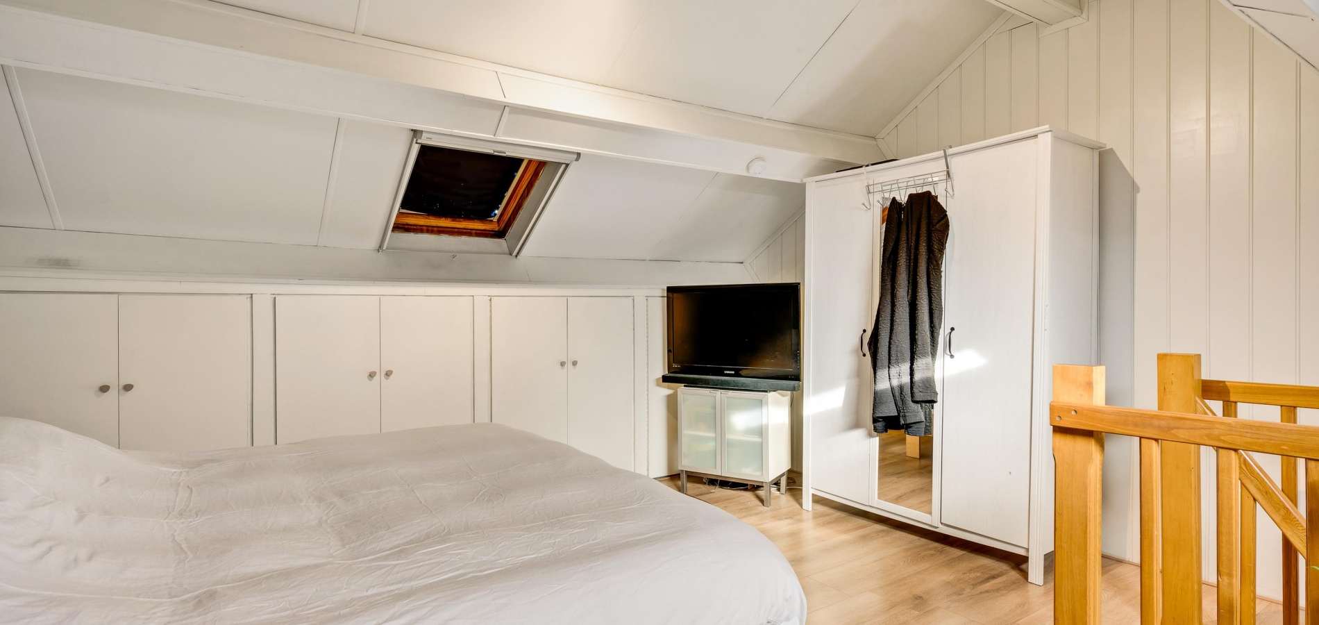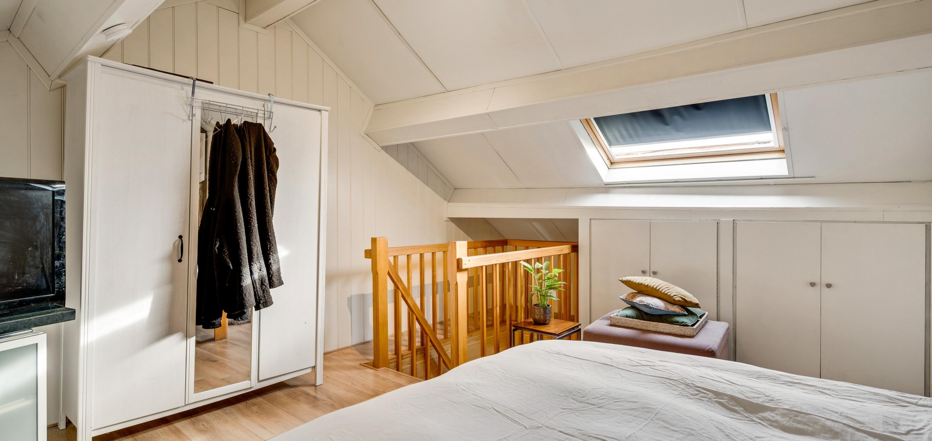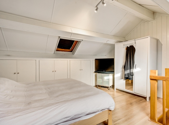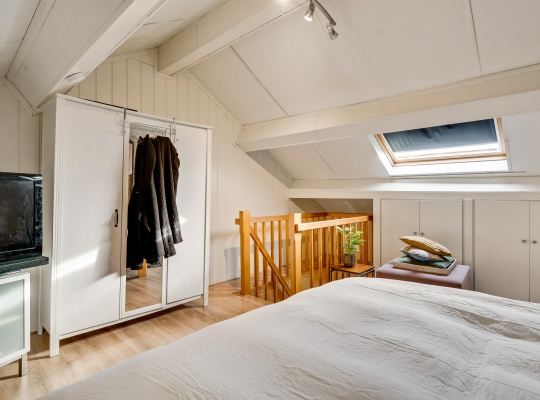 Een vaste trap brengt u naar slaapkamer III (circa 4,31 x 4,26) met twee dakramen en een goede stahoogte. Deze kamer, met diepe bergingen in de schuinten van het dak, is in gebruik als master bedroom.