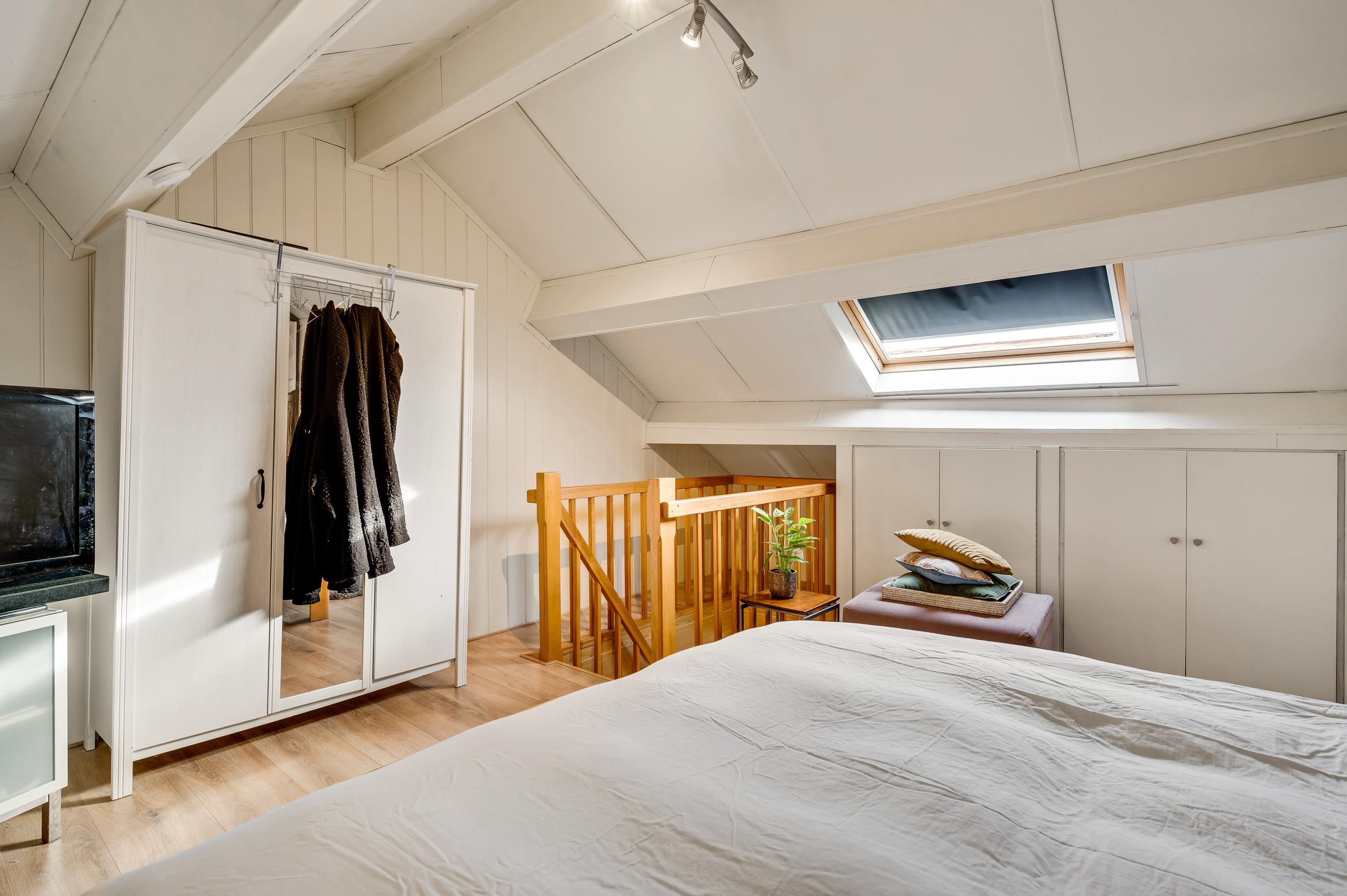 Het grote raam bij het bordes zorgt voor veel lichtinval, niet alleen bij de trap, maar ook op de overloop. Op bijna de hele verdieping ligt laminaat en de fraaie paneeldeuren zijn behouden.