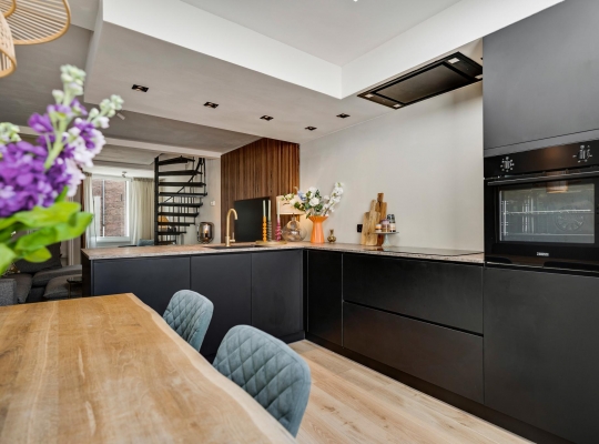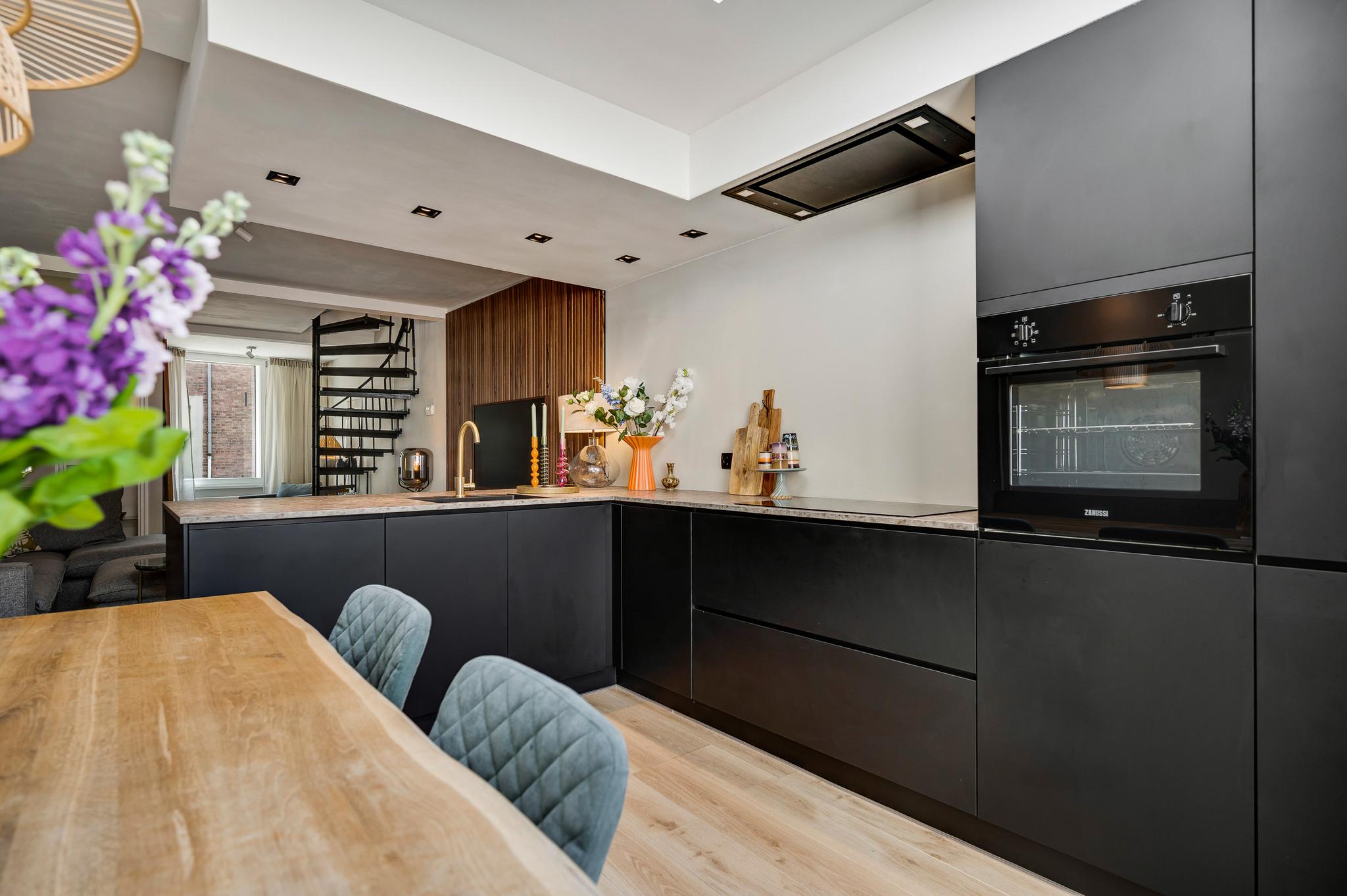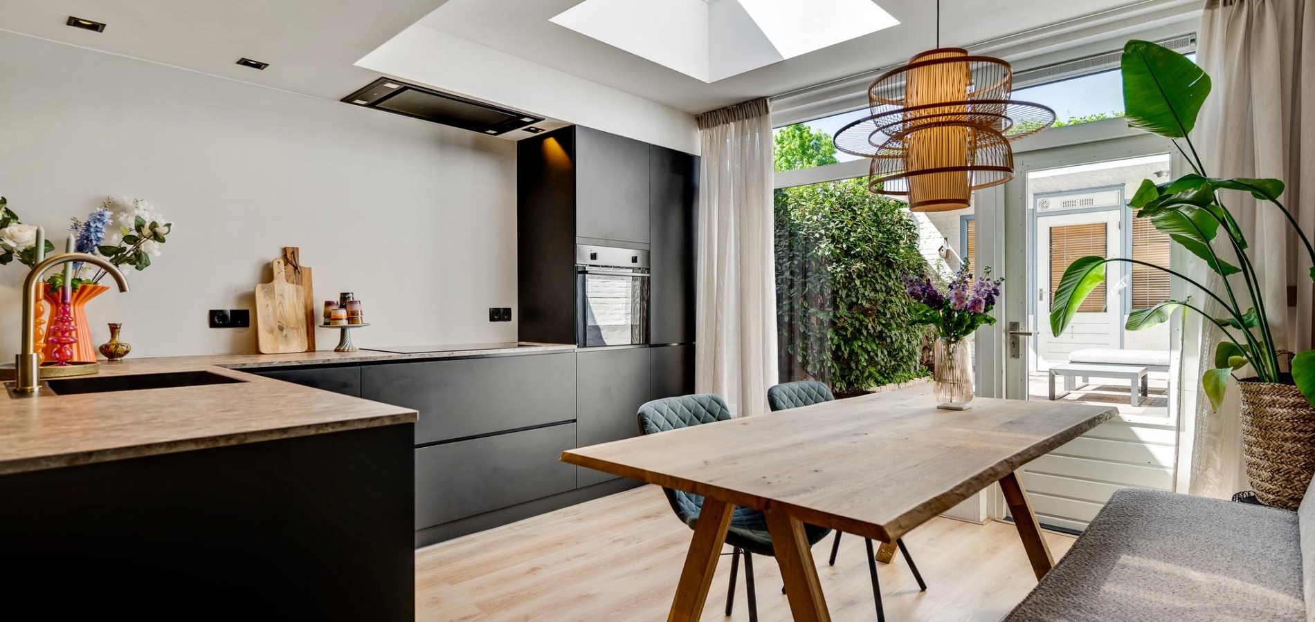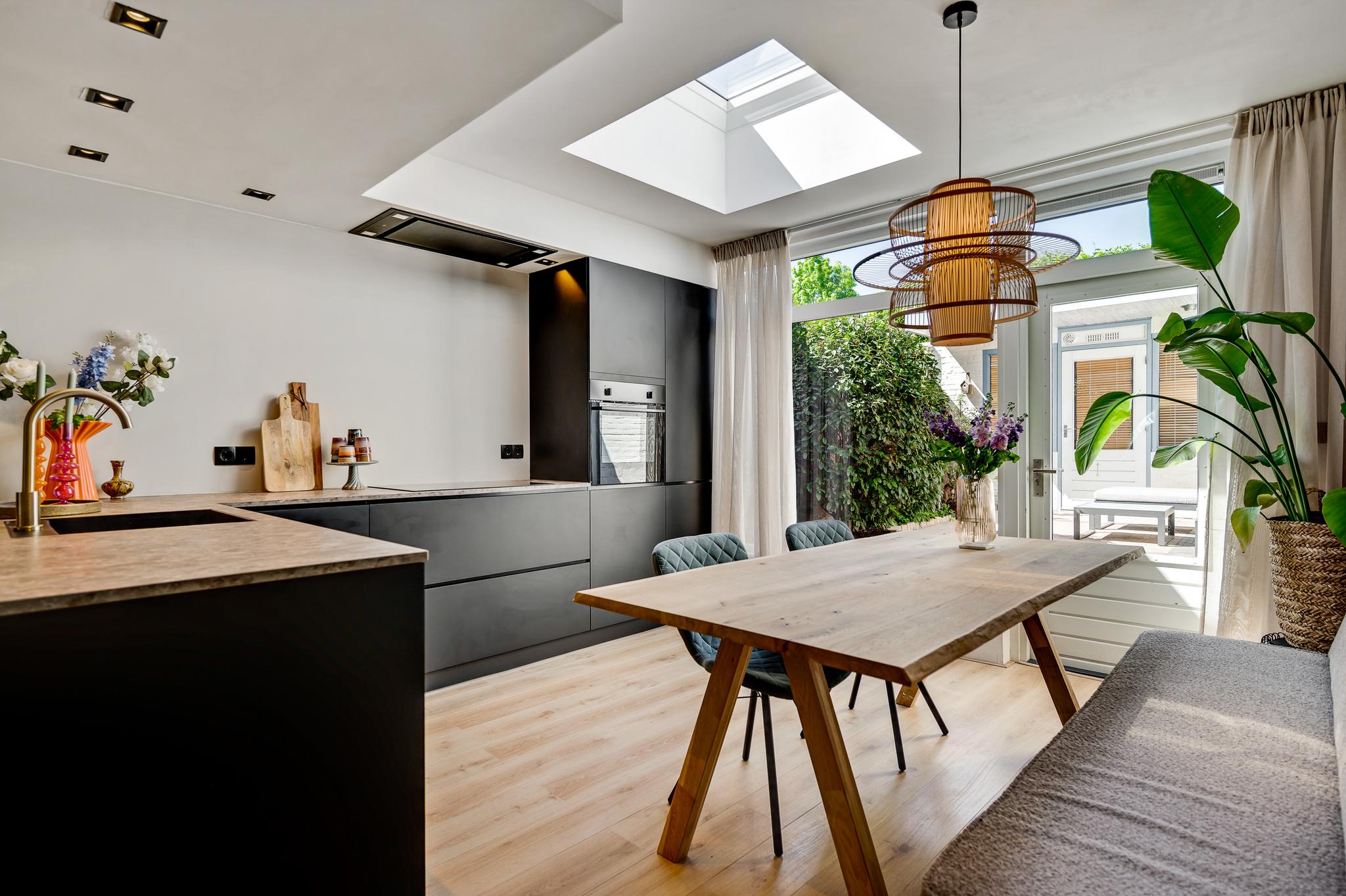 De woonkamer met open keuken heeft een totale oppervlakte van circa 40 m2,met het grote zitgedeelte in het midden en een extra zitgelegenheid aan de voorzijde. In de keuken, met een grote lichtkoepel en uitzicht naar de tuin, is ruimte voor de eettafel. Op de vloer ligt laminaat en de trendy lattenwand bij het zitgedeelte bepaalt, samen met de keuken, de sfeer in huis. De matzwarte hoekopstelling is in 2023 geplaatst, met een uitstekende afwerking en alle benodigde inbouwapparatuur: een inductie kookplaat, plafondafzuiging, oven, vaatwasser koelkast en diepvries.