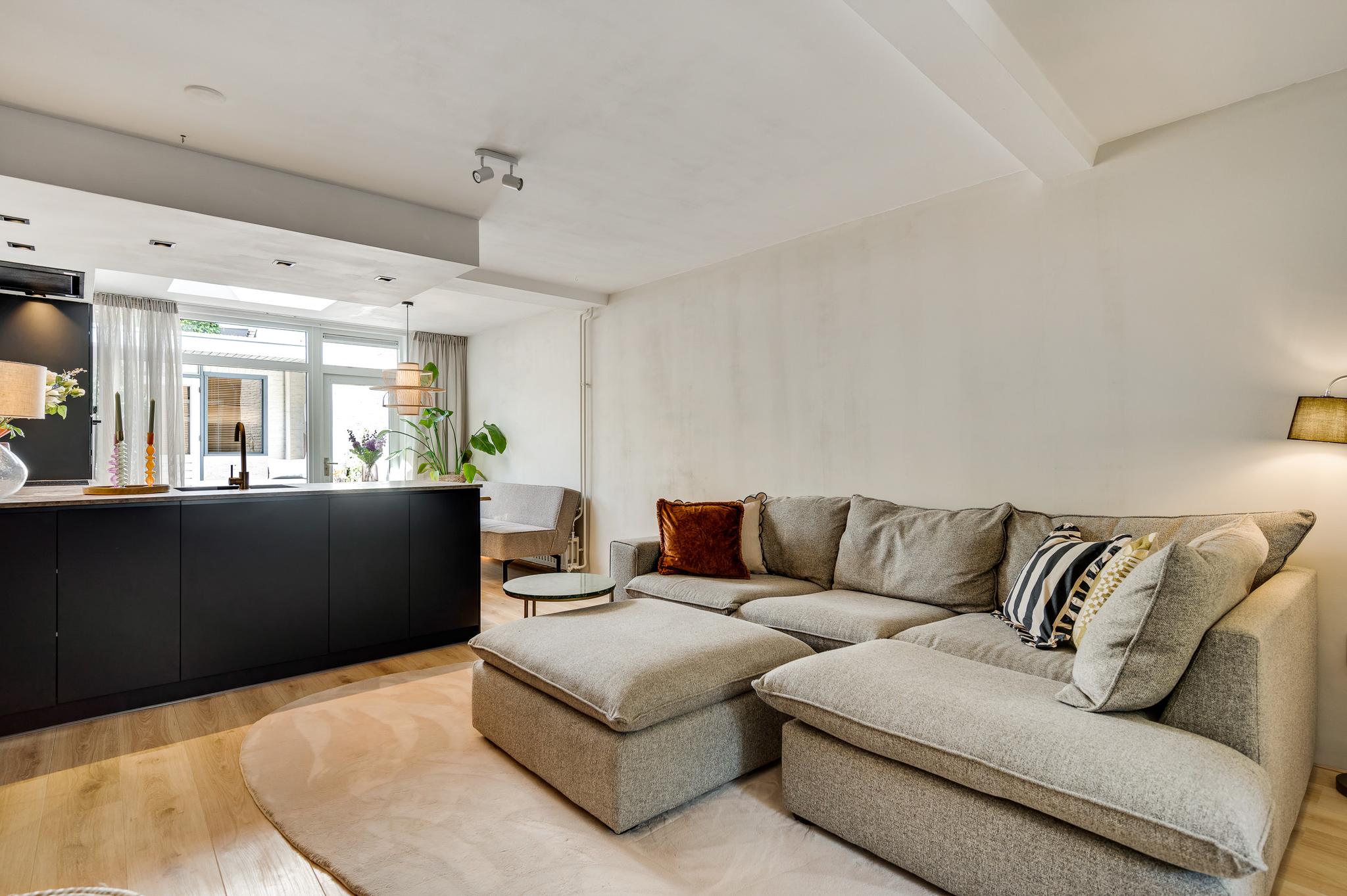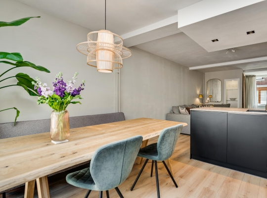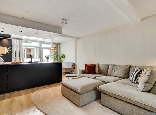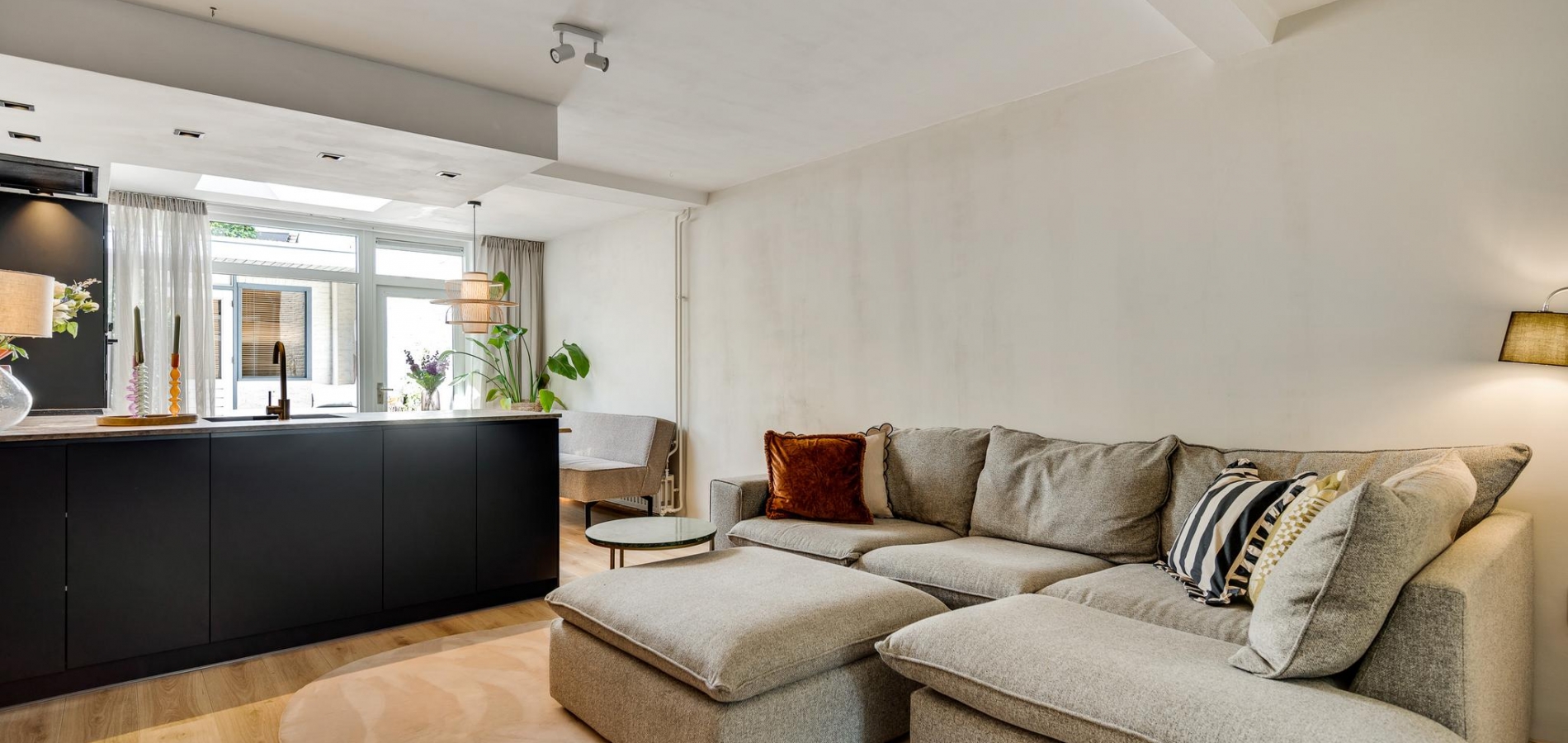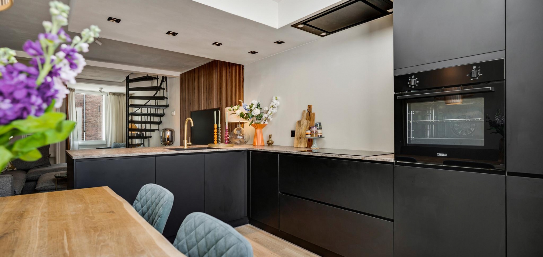 De woonkamer met open keuken heeft een totale oppervlakte van circa 40 m2,met het grote zitgedeelte in het midden en een extra zitgelegenheid aan de voorzijde. In de keuken, met een grote lichtkoepel en uitzicht naar de tuin, is ruimte voor de eettafel. Op de vloer ligt laminaat en de trendy lattenwand bij het zitgedeelte bepaalt, samen met de keuken, de sfeer in huis. De matzwarte hoekopstelling is in 2023 geplaatst, met een uitstekende afwerking en alle benodigde inbouwapparatuur: een inductie kookplaat, plafondafzuiging, oven, vaatwasser koelkast en diepvries.