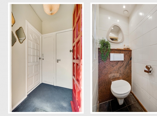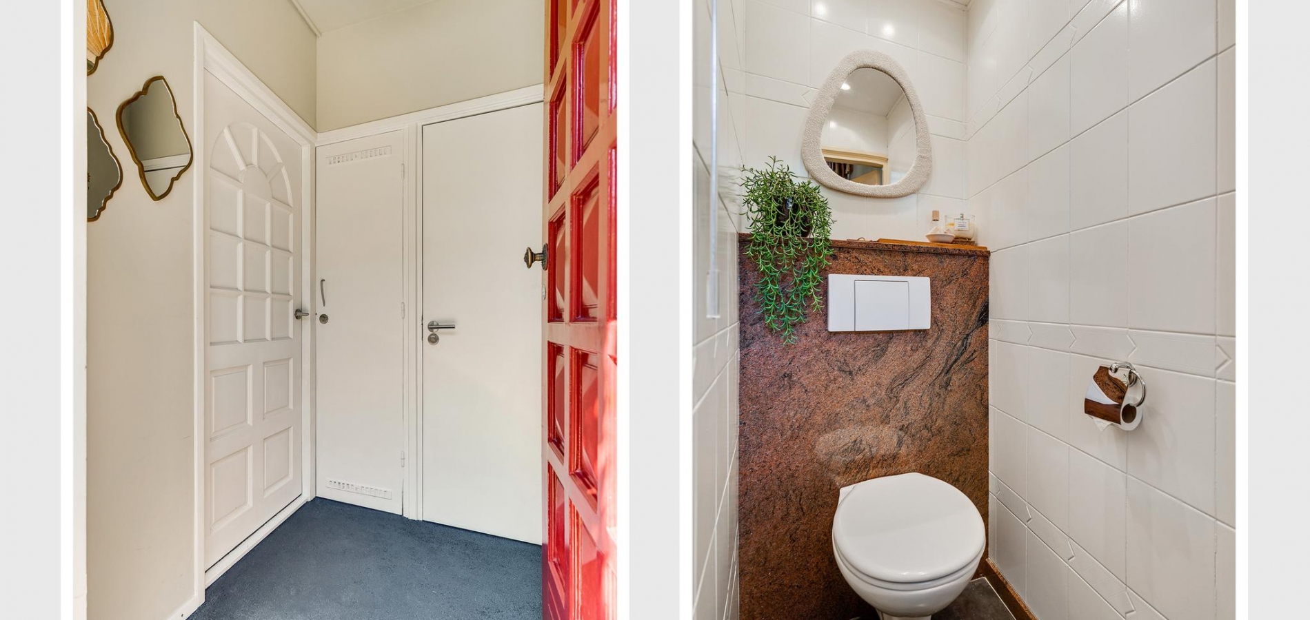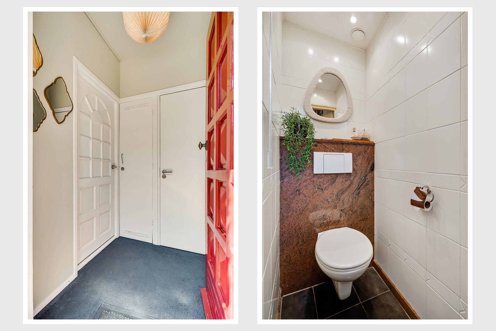 Wat een charme heeft deze woning! Achter de rode voordeur is de hal, met recht voor u de meterkast en de toiletruimte. Hier zijn lichte wandtegels gecombineerd met natuursteen en een wandcloset.