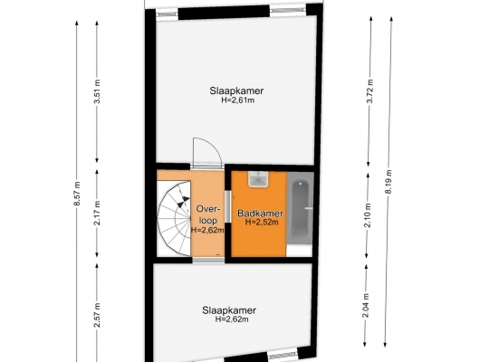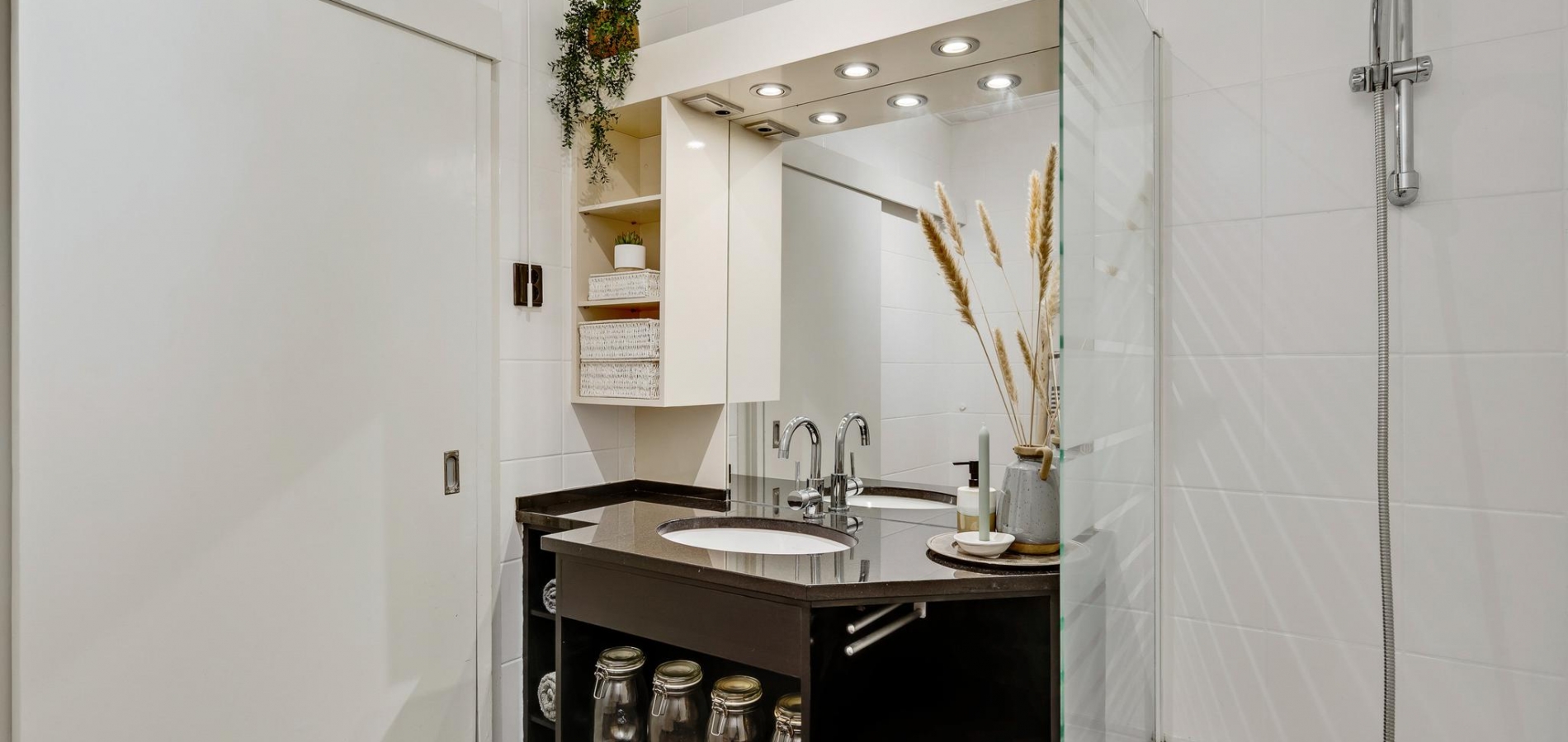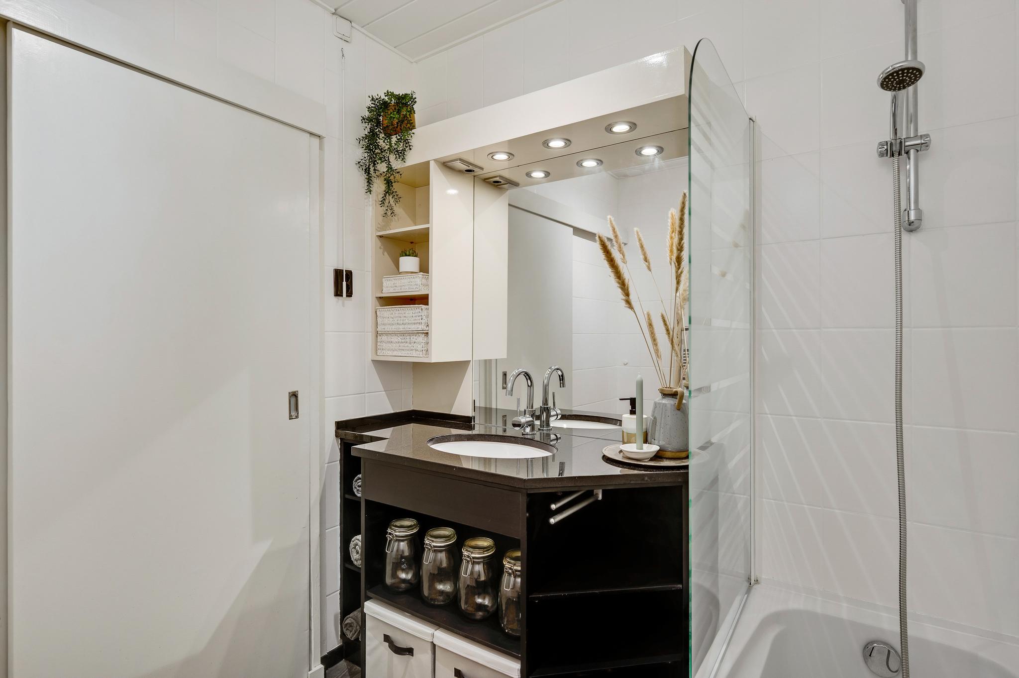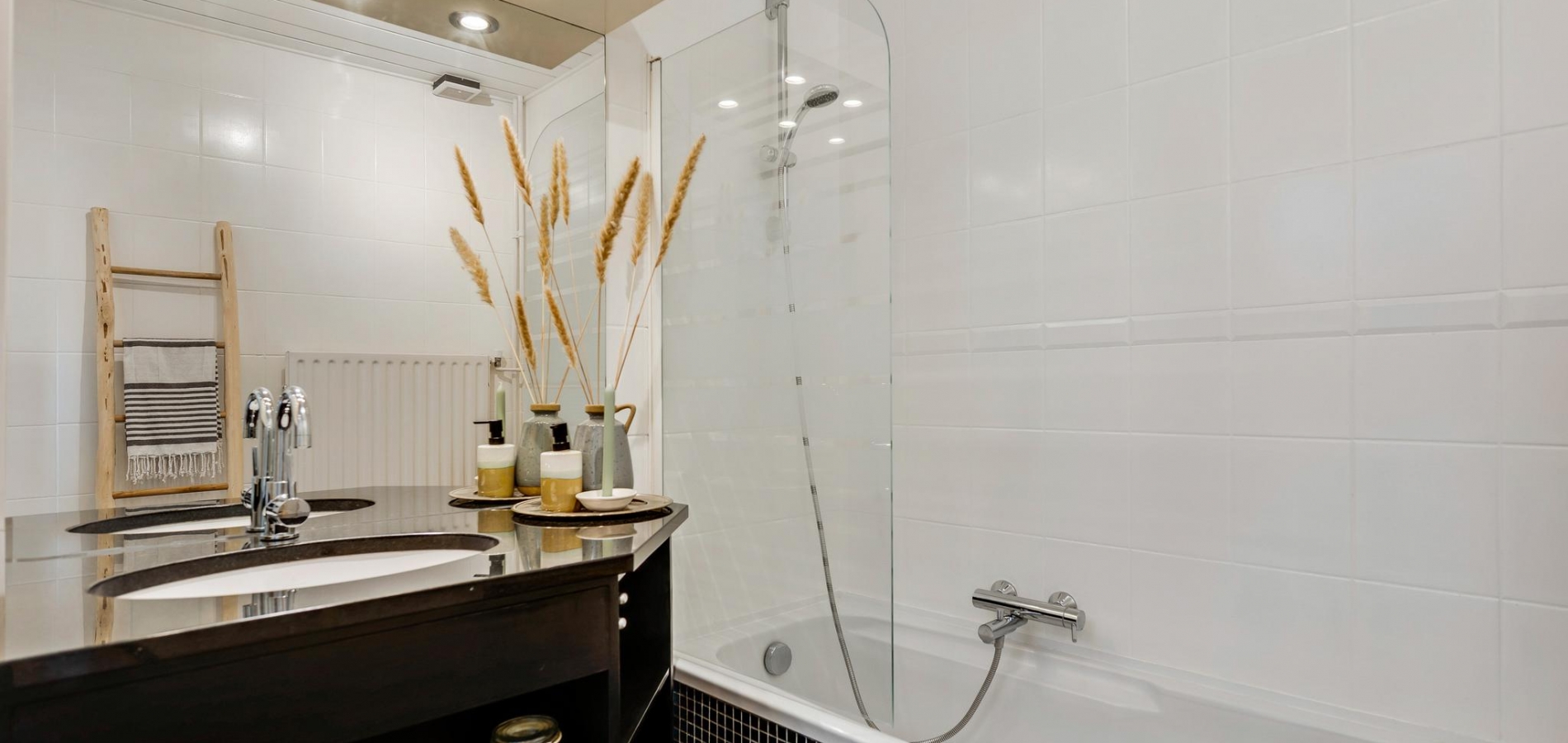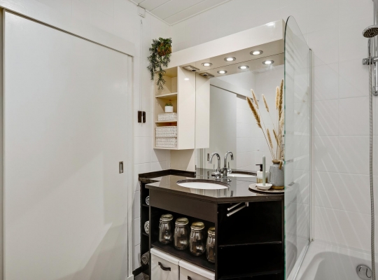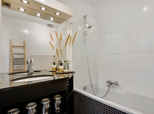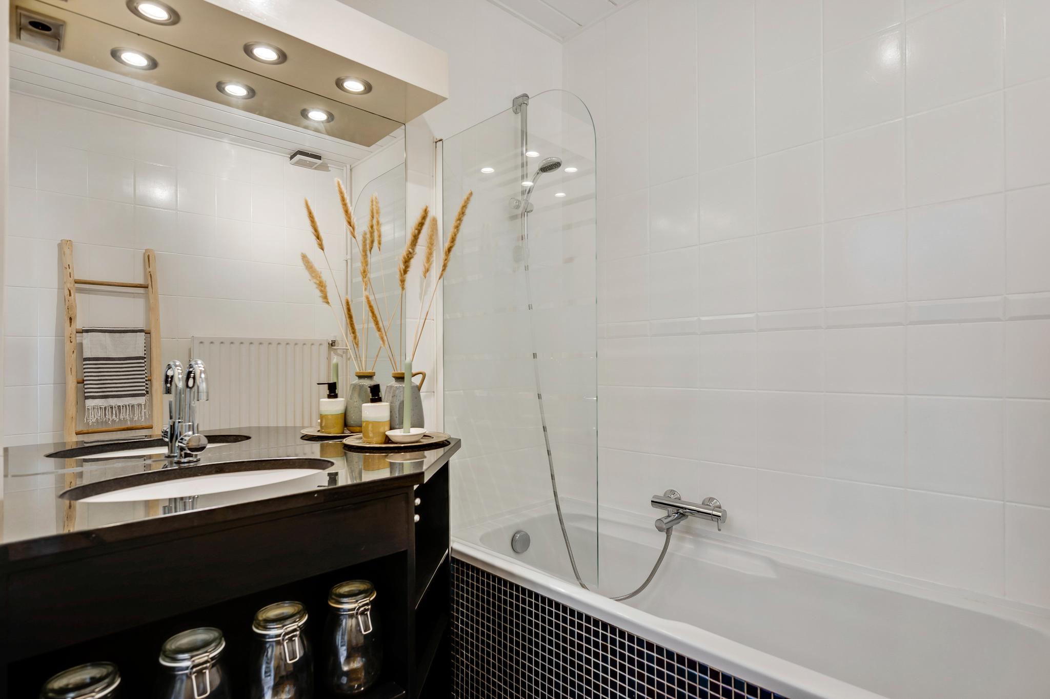 De badkamer (circa 2,12 x 2,05) is ingedeeld met een ligbad/douchecombinatie en een stijlvol badkamermeubel. Wit en zwart zijn smaakvol gecombineerd tot een badkamer, die u met accessoires neer eigen idee kunt stylen.