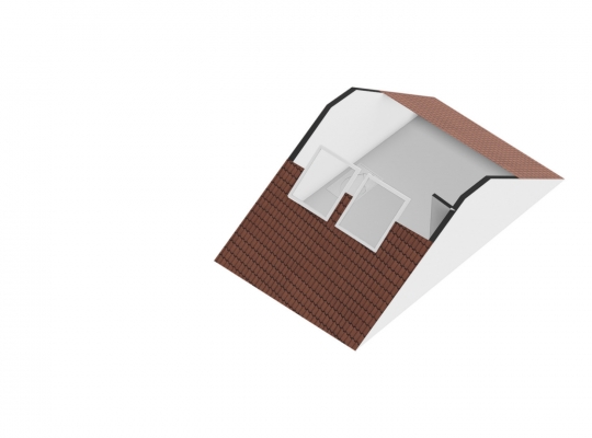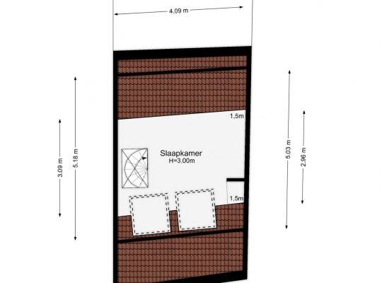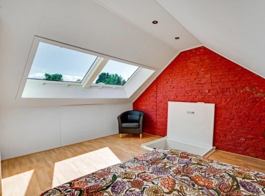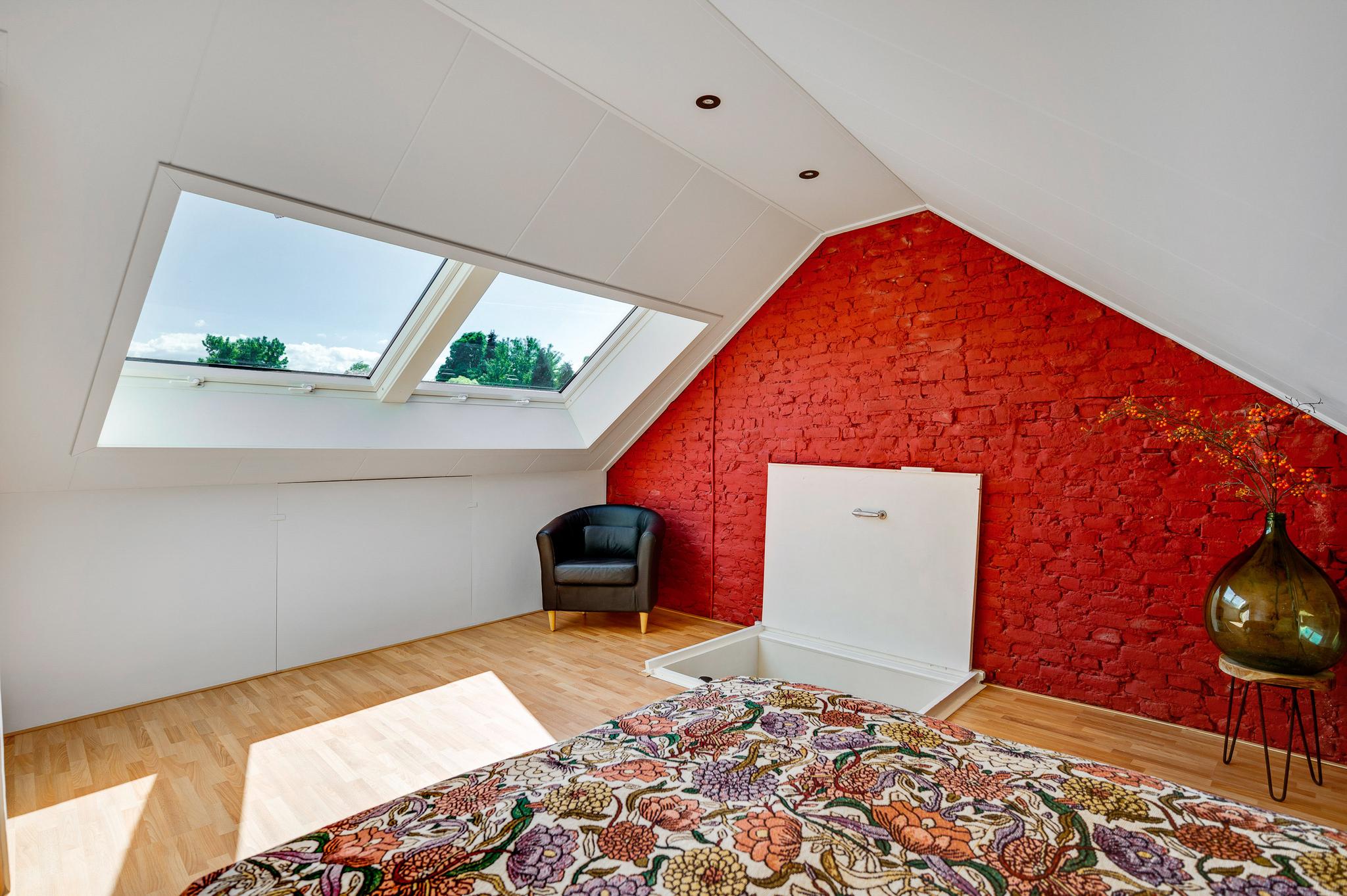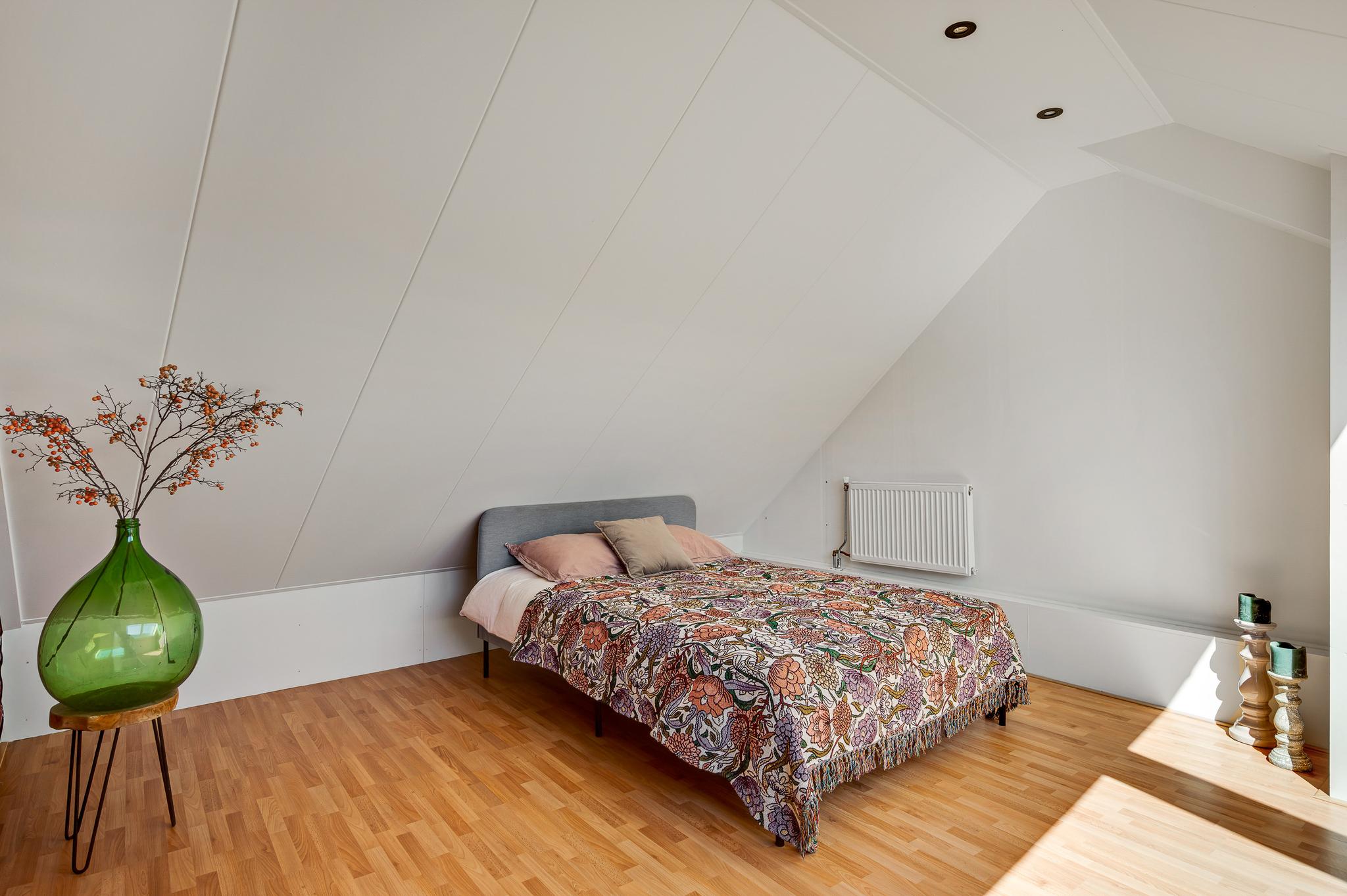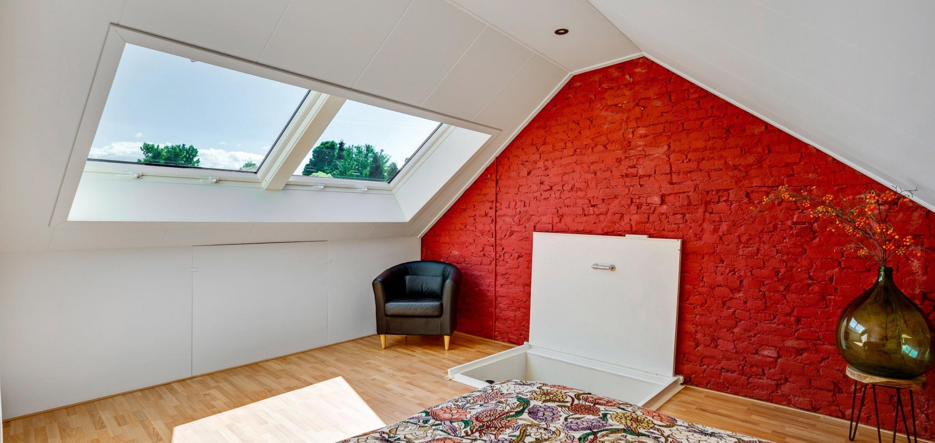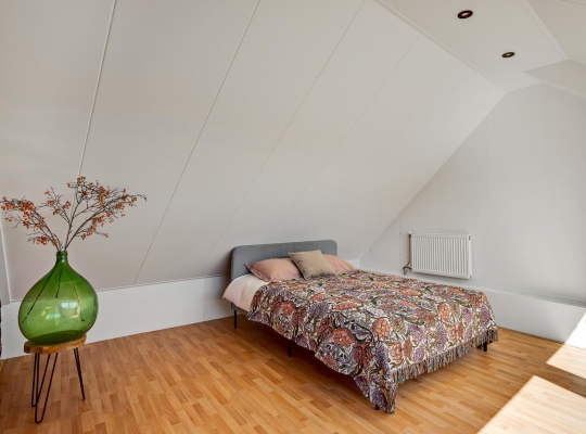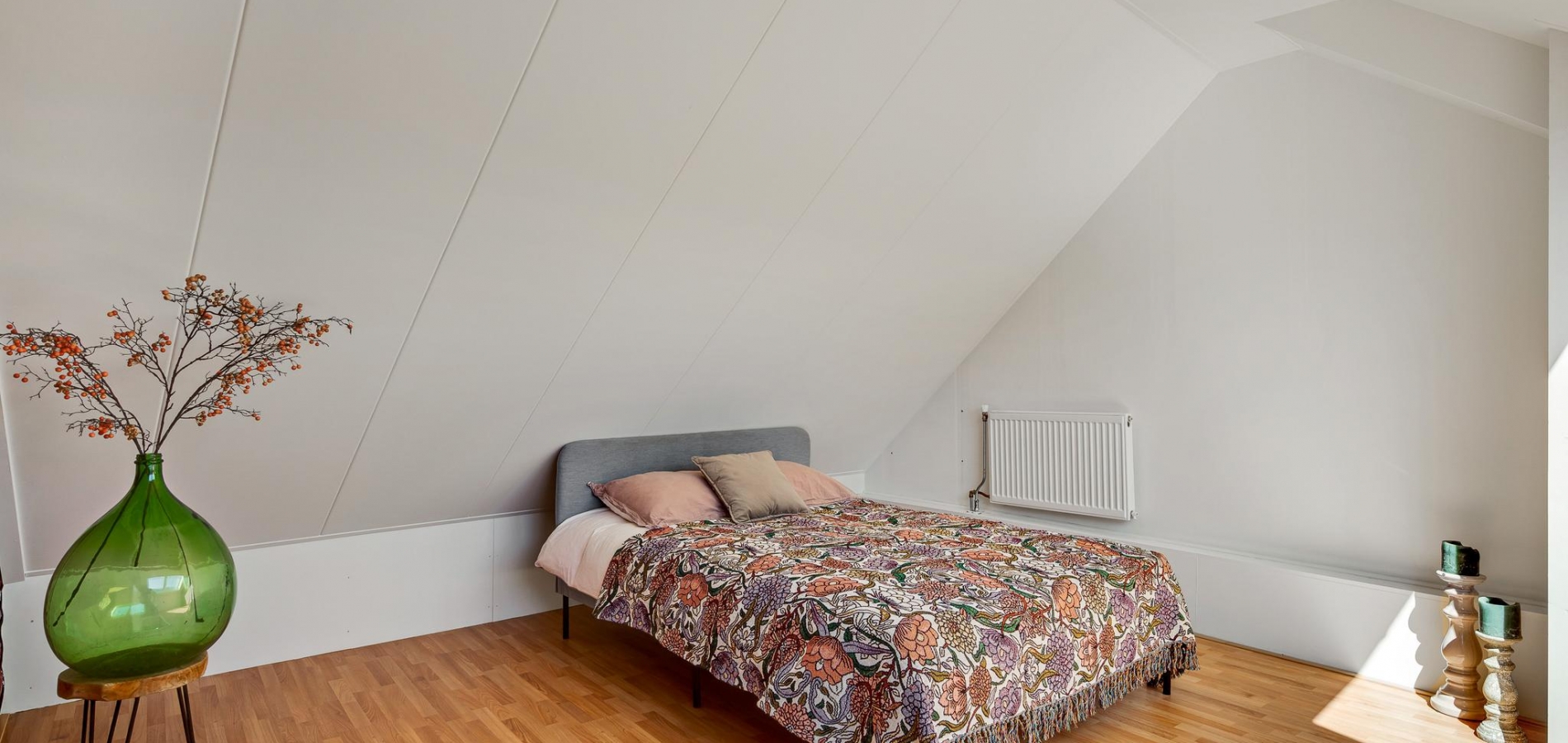 Slaapkamer III (circa 4,03 x 4,30) is op de tweede verdieping, te bereiken via een vaste trap. De nokhoogte van circa 3 meter zorgt voor een goede stahoogte en aan de voorzijde zijn twee dakramen geplaatst. In de hoek van deze kamer, achter een gordijn, hangt de HR-ketel (Intergas, 2022, eigendom).