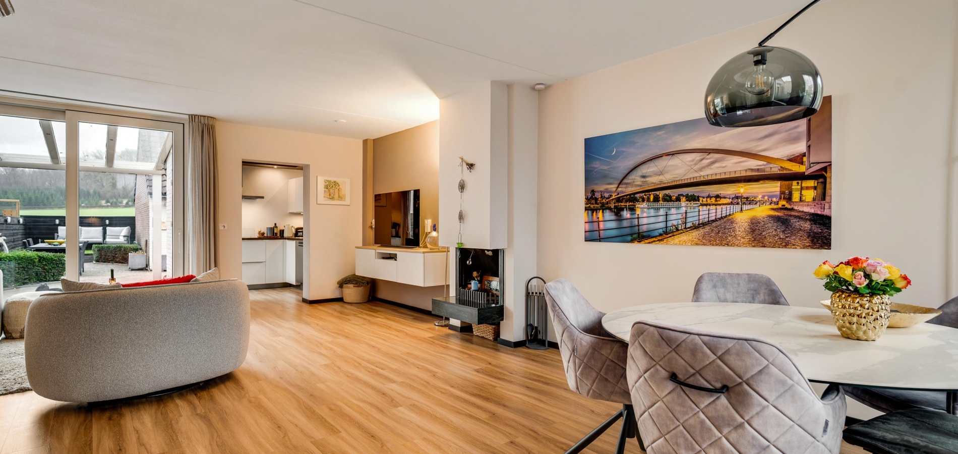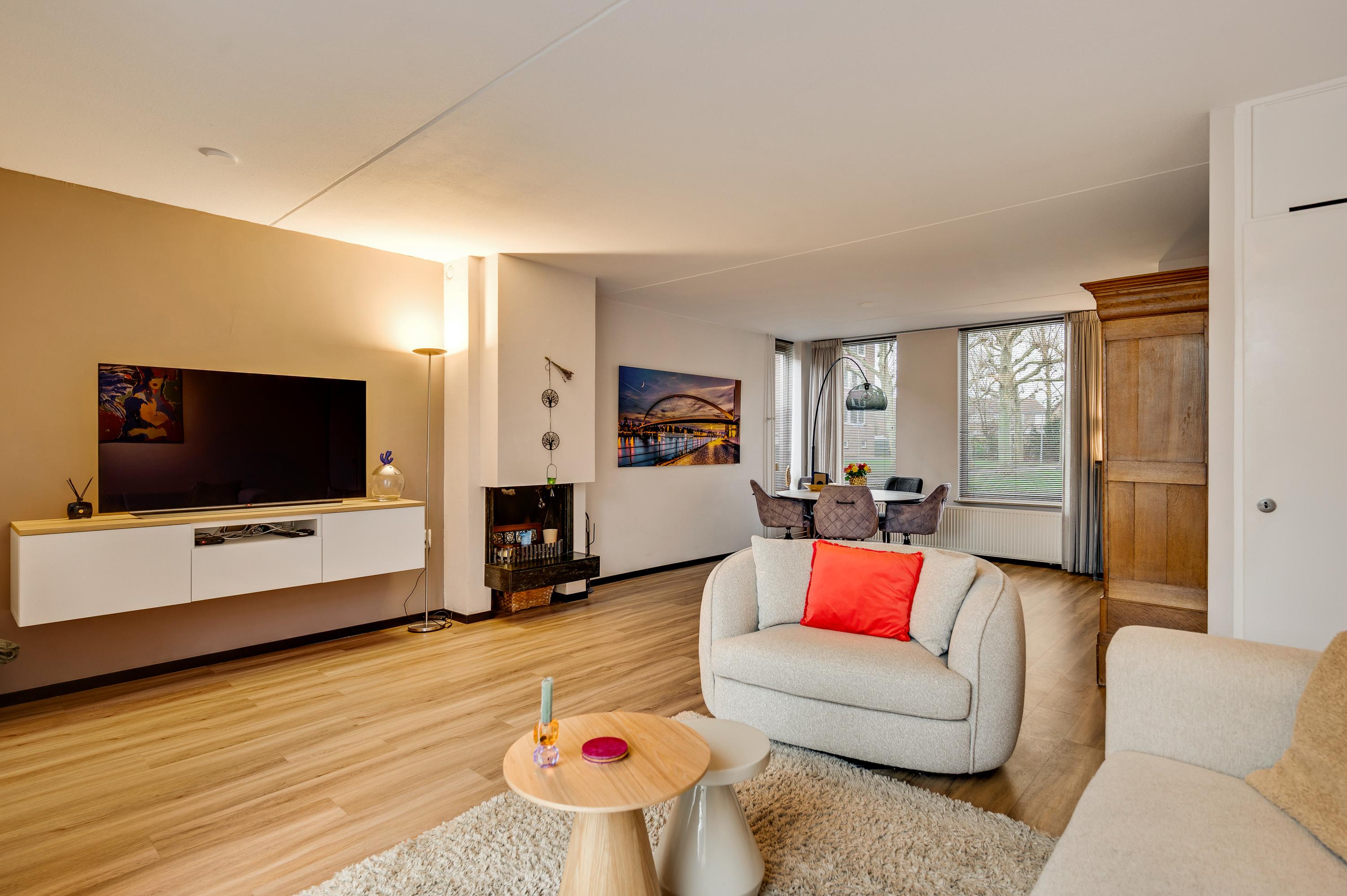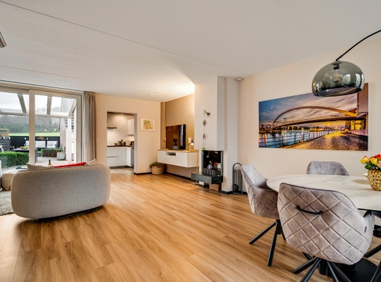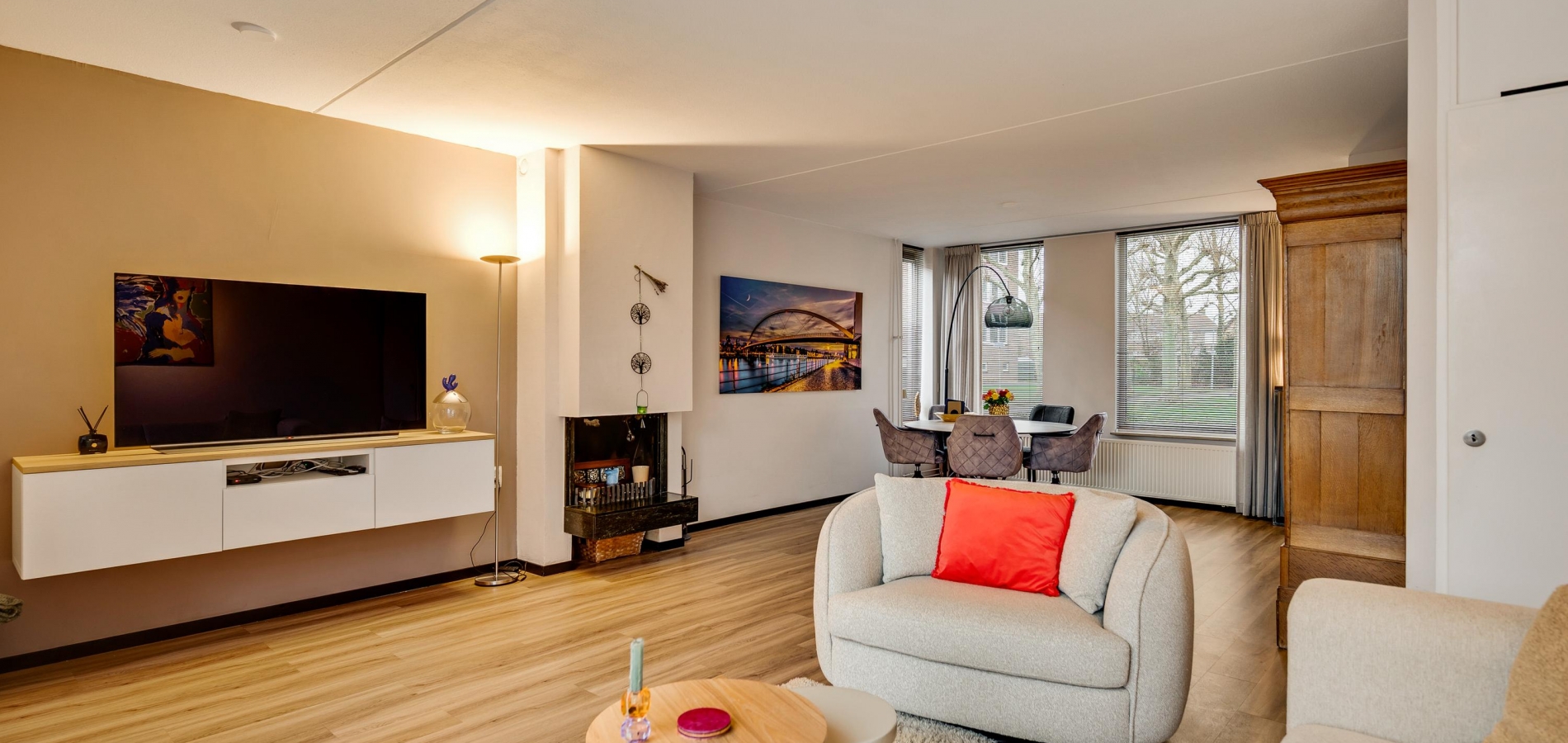 De woonkamer (circa 34 m2) is een fraaie en sfeervolle leefruimte, met een open haard en een schuifpui naar het overdekte terras. Het eetgedeelte is aan de voorzijde en vanaf de bank heeft u fraai uitzicht.