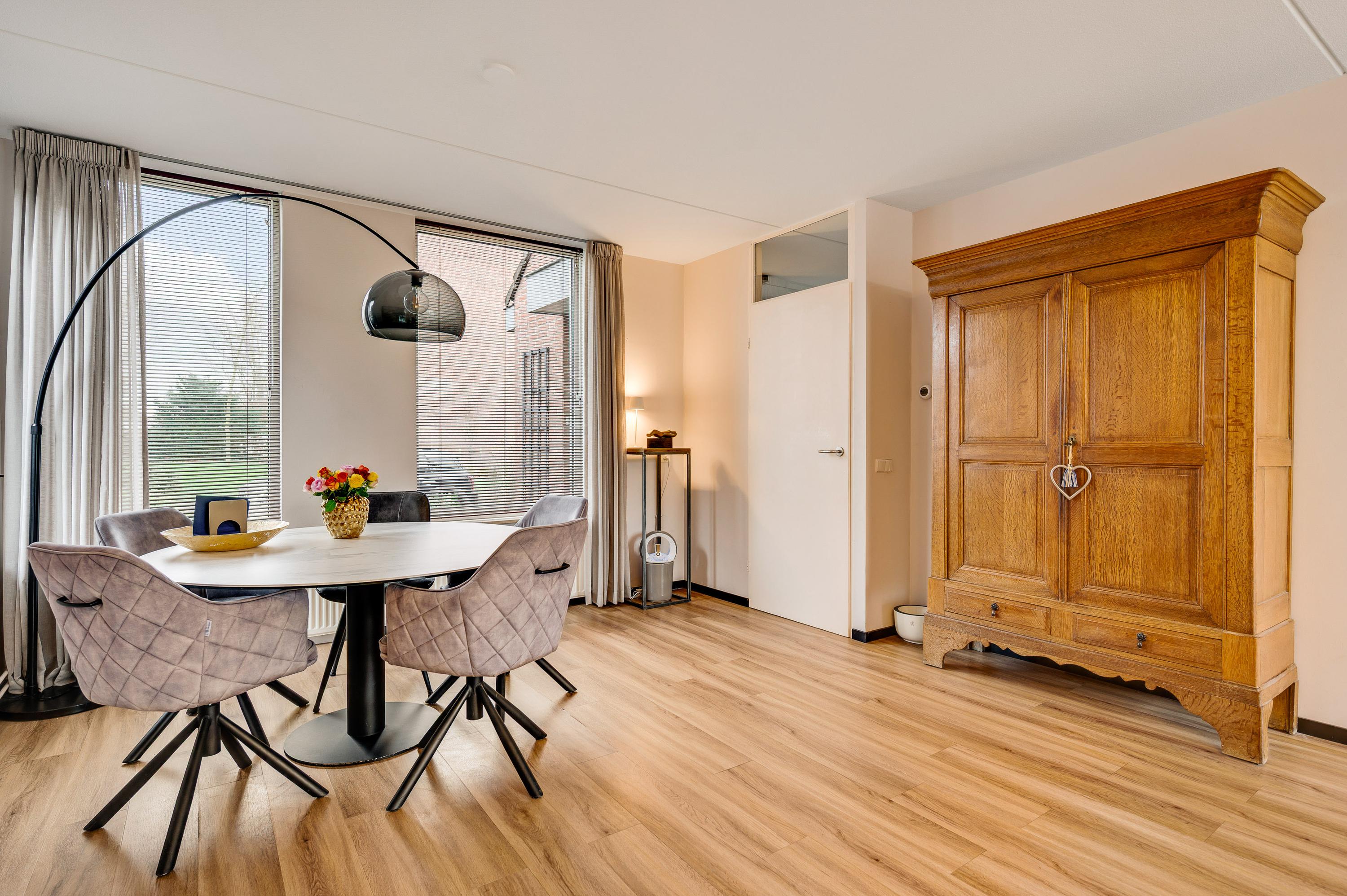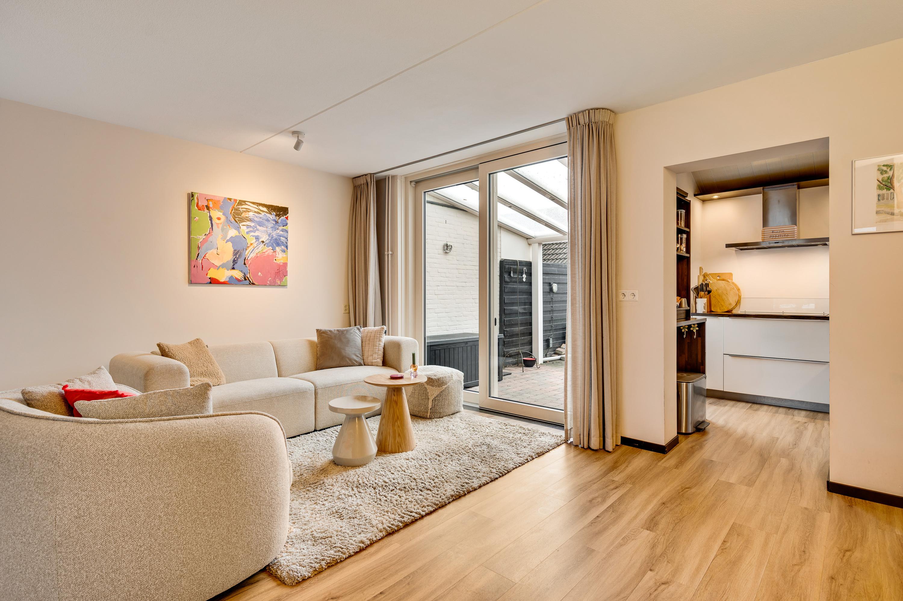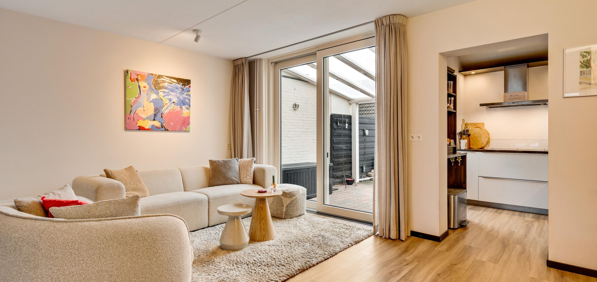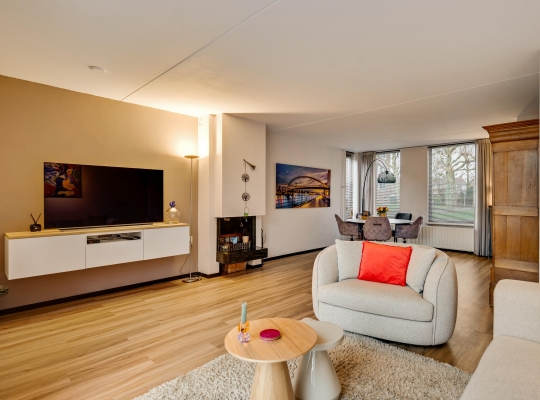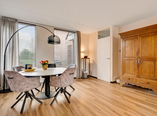 De woonkamer (circa 34 m2) is een fraaie en sfeervolle leefruimte, met een open haard en een schuifpui naar het overdekte terras. Het eetgedeelte is aan de voorzijde en vanaf de bank heeft u fraai uitzicht.