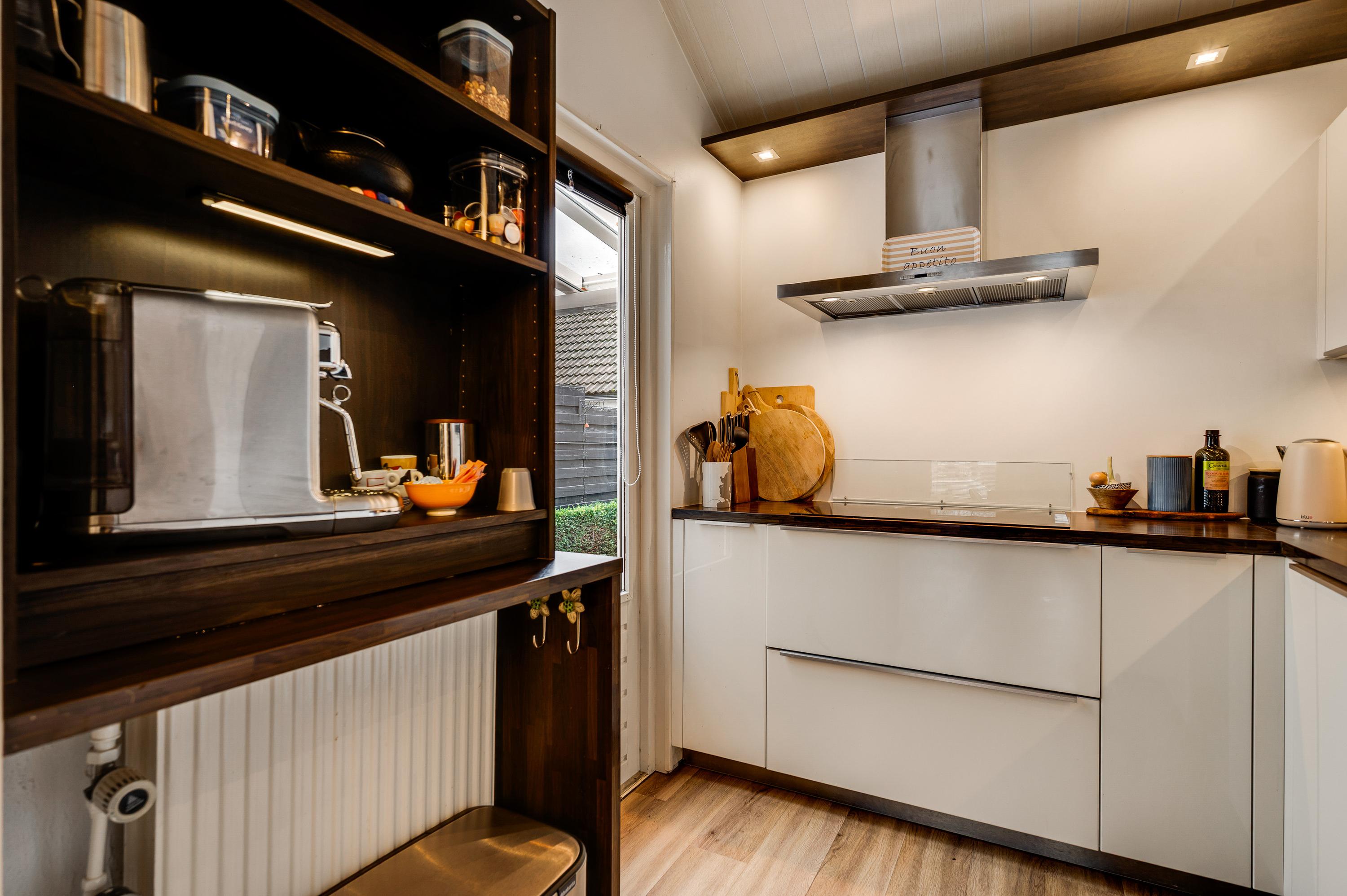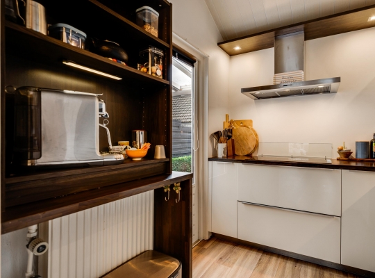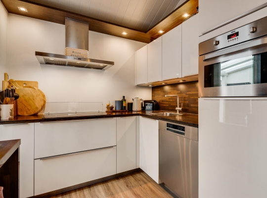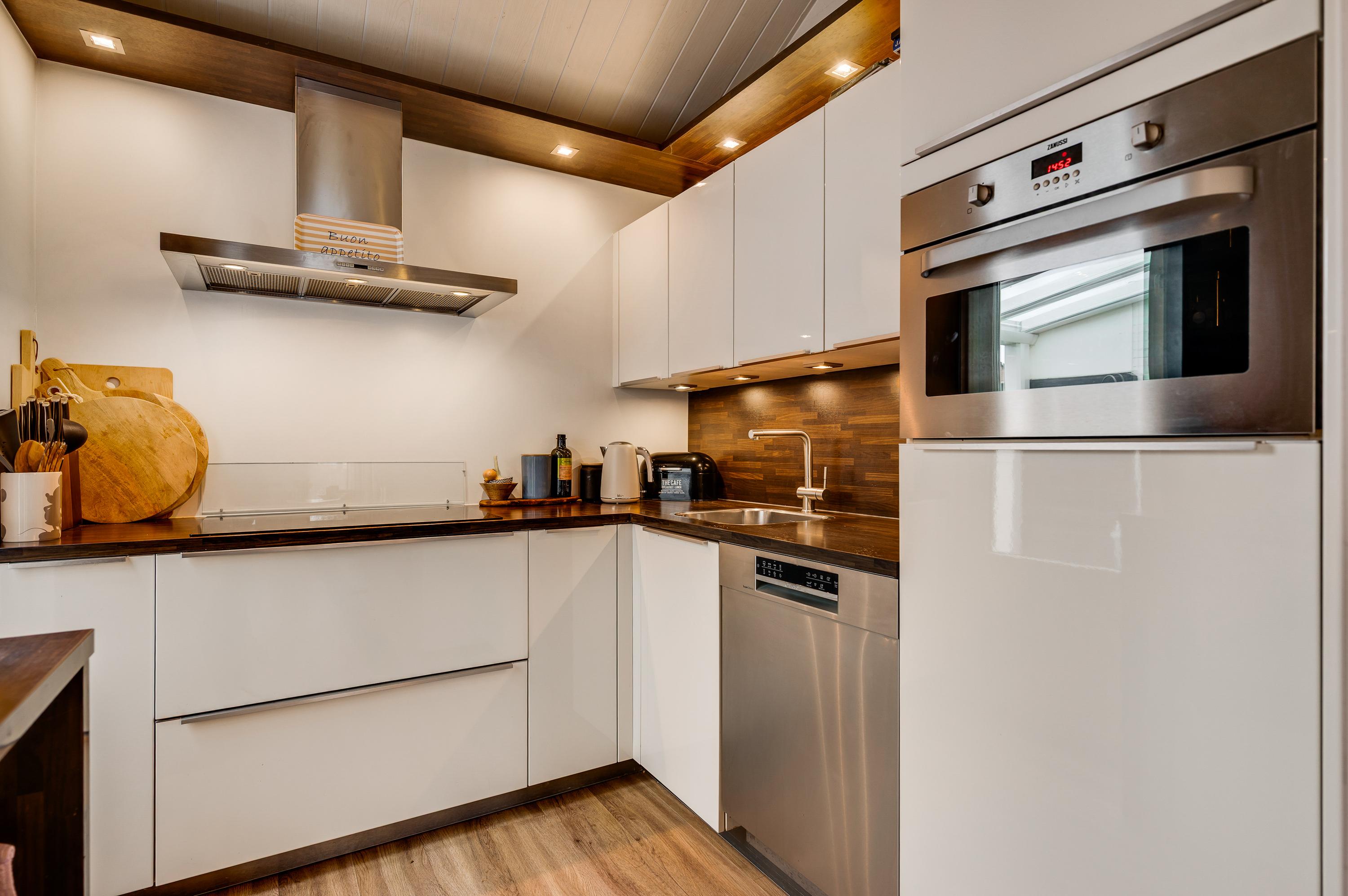 In de keuken (circa 2,38 x 2,20) is de ruimte goed ingedeeld, met een lichte hoekopstelling en een hoge kast boven de radiator. Het hoge, schuine plafond maakt de keuken heel ruimtelijk en ook vanuit hier is er toegang tot het overdekte terras. Alle benodigde apparatuur is aanwezig: een inductie kookplaat, afzuigkap, vaatwasser, koelkast en een combi-oven.