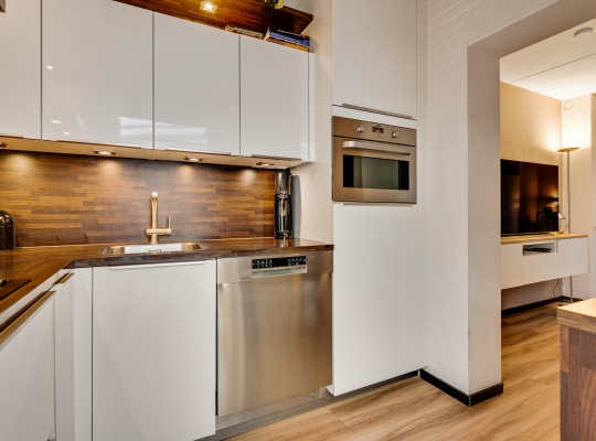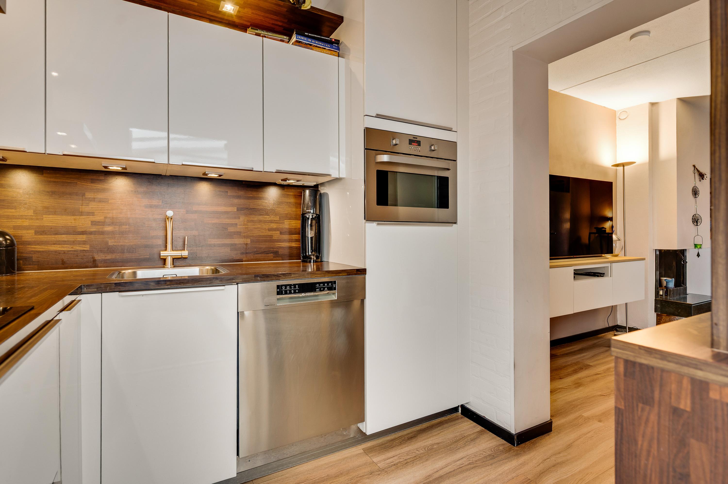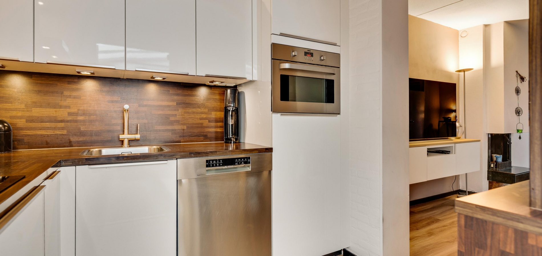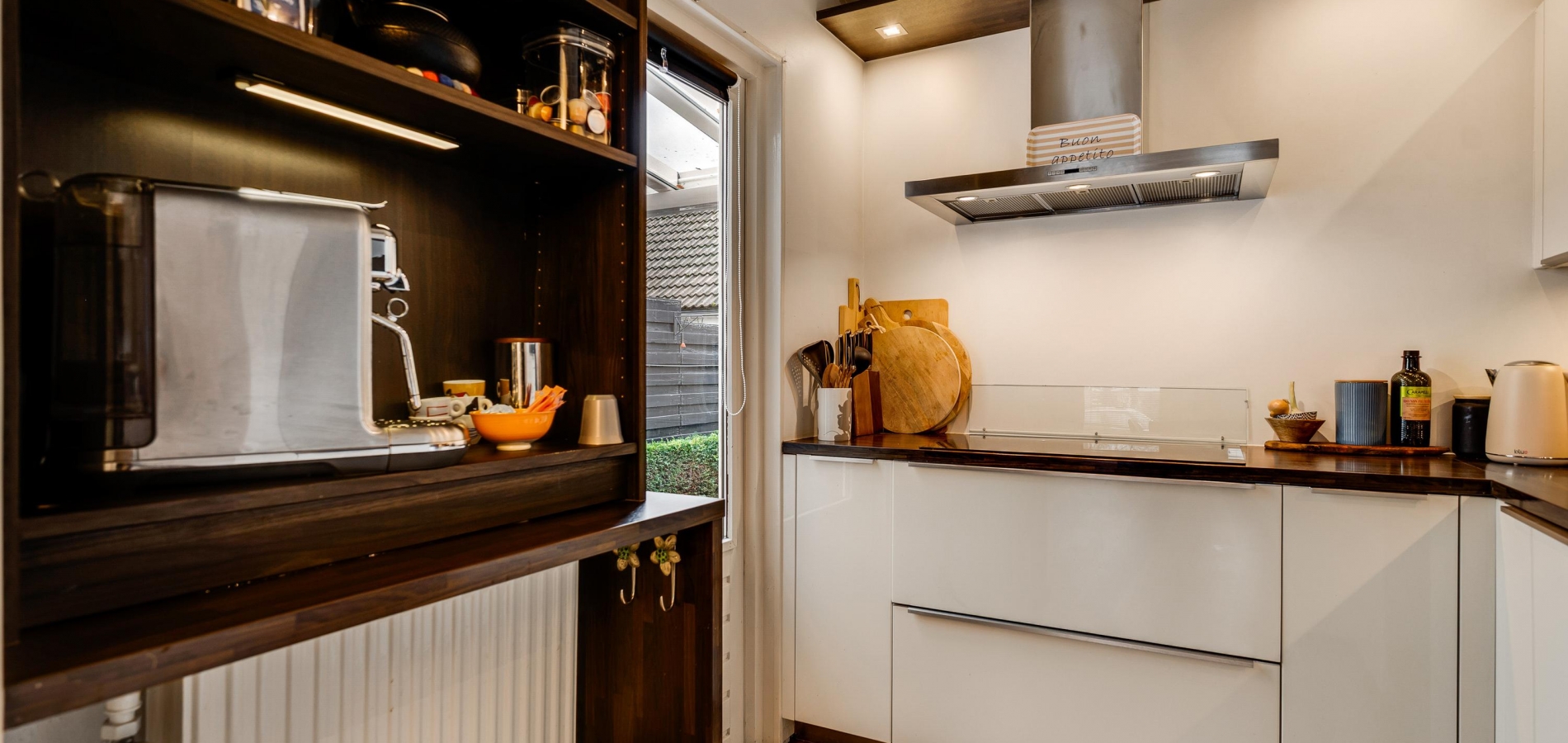 In de keuken (circa 2,38 x 2,20) is de ruimte goed ingedeeld, met een lichte hoekopstelling en een hoge kast boven de radiator. Het hoge, schuine plafond maakt de keuken heel ruimtelijk en ook vanuit hier is er toegang tot het overdekte terras. Alle benodigde apparatuur is aanwezig: een inductie kookplaat, afzuigkap, vaatwasser, koelkast en een combi-oven.