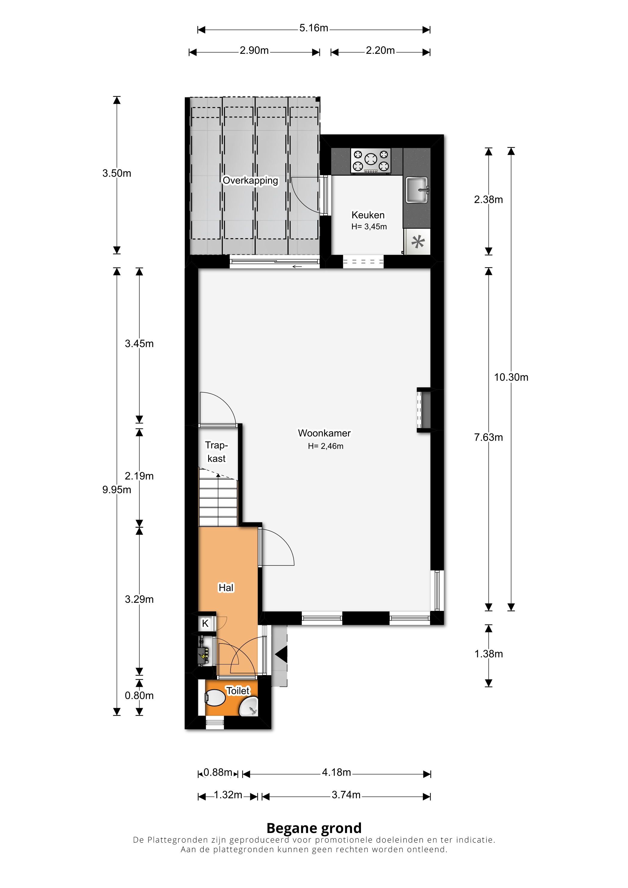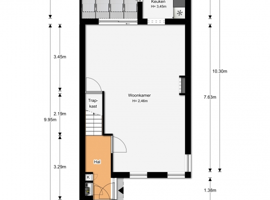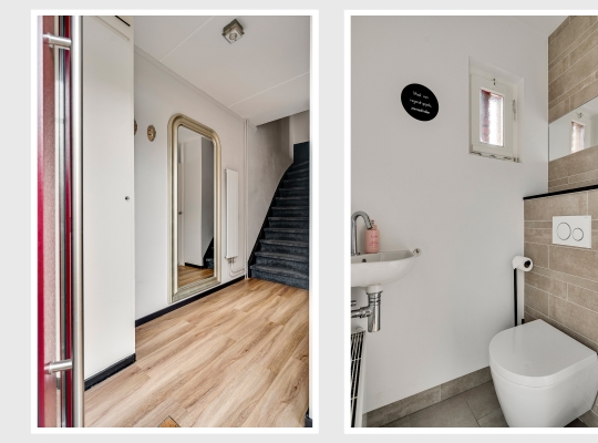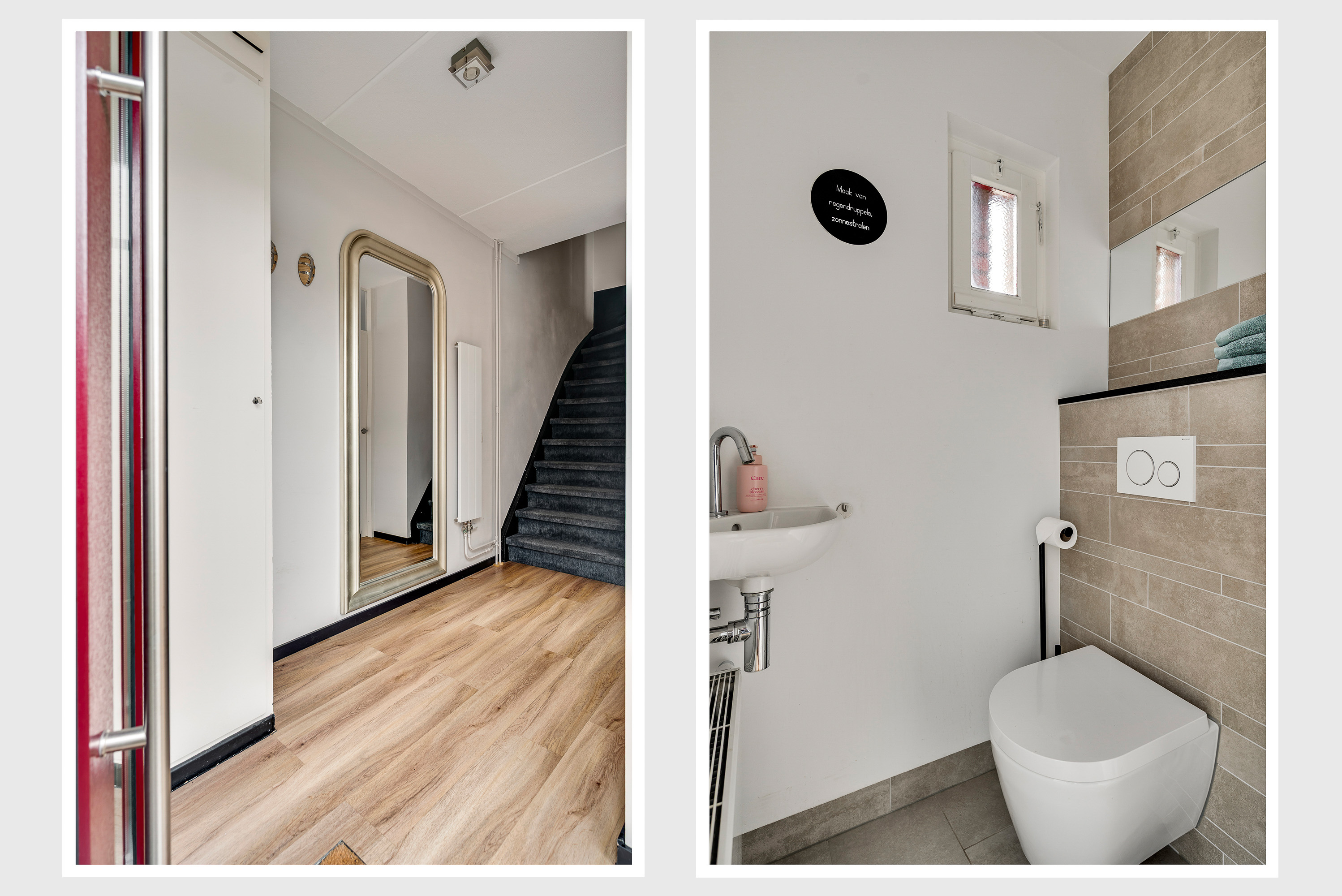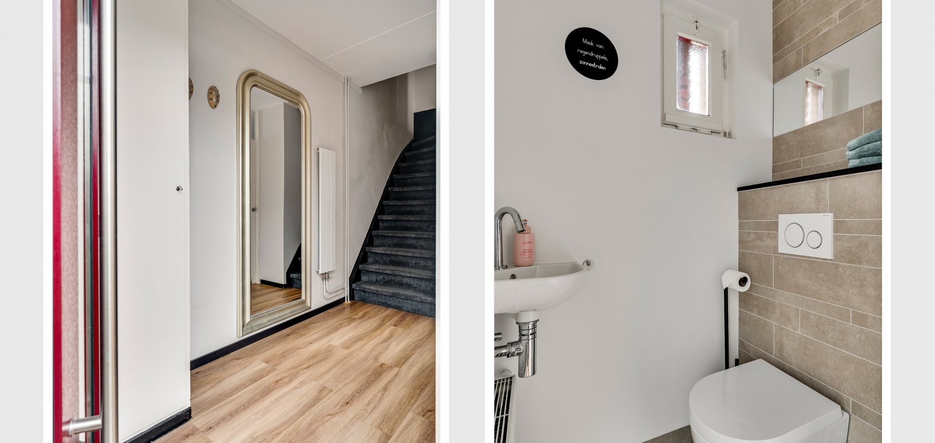 Door de ramen van de voordeur valt veel daglicht in de hal naar binnen. Vanaf hier is er toegang tot de in 2017 vernieuwde toiletruimte met fonteintje, de meterkast, een bergkast en de woonkamer. Op de trap ligt mooi, donker tapijt en de laminaatvloer ligt op bijna de hele begane grond.