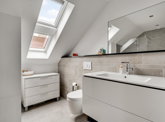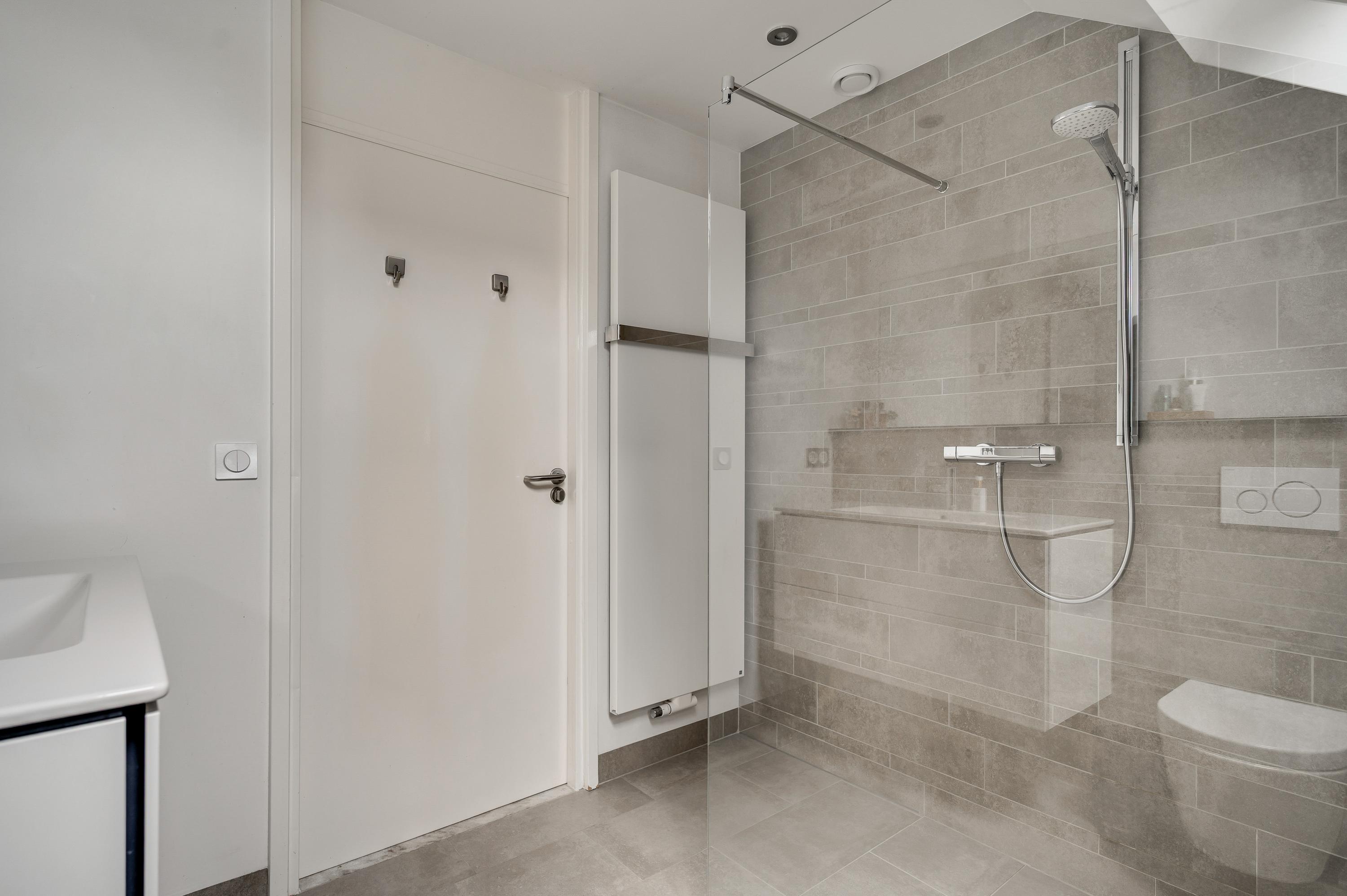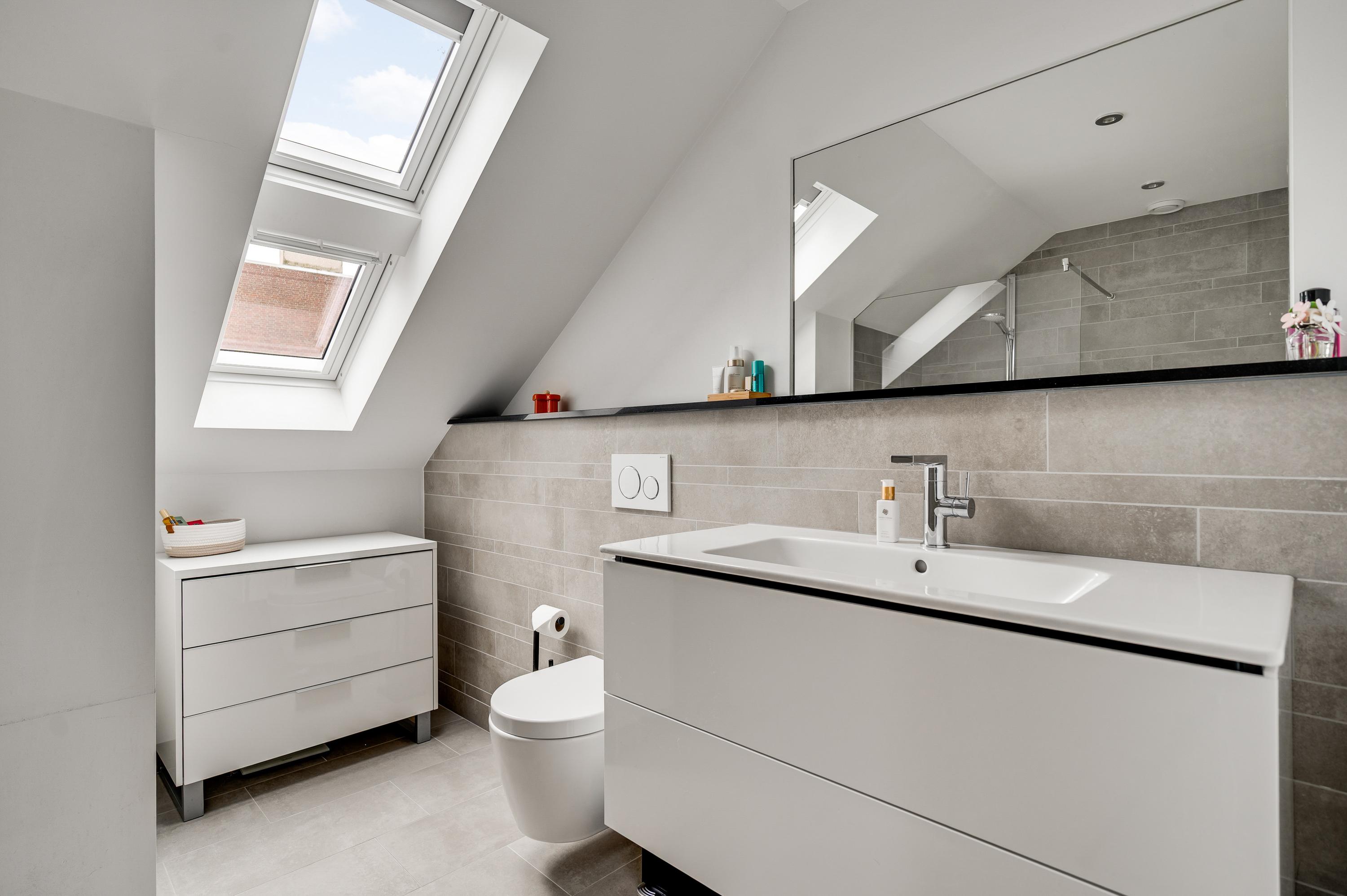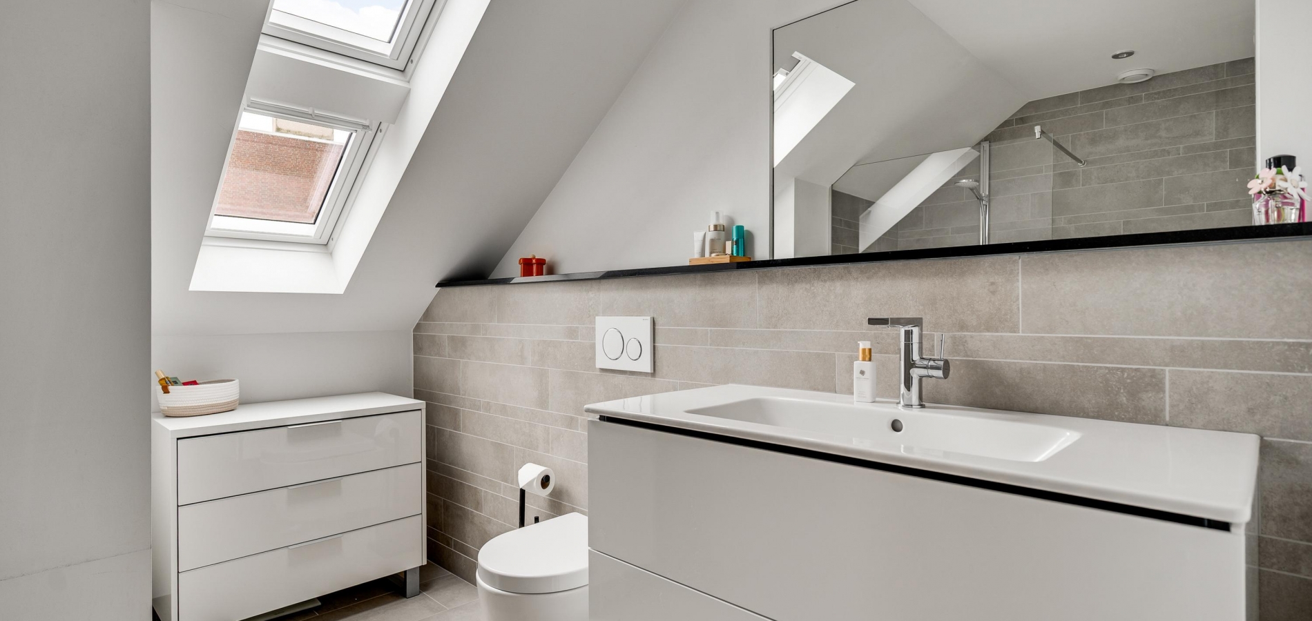 De badkamer (circa 2,92 x 2,57/1,29) is heel ruimtelijk ingedeeld, met gebruik van lichte kleuren. U heeft de beschikking over een inloopdouche, een wandcloset en een breed badmeubel met wastafel en een Veluxraam met zonwering. Fraaie elementen zijn de designradiator, de douche- en wastafelkraan en de glazen douchewand.