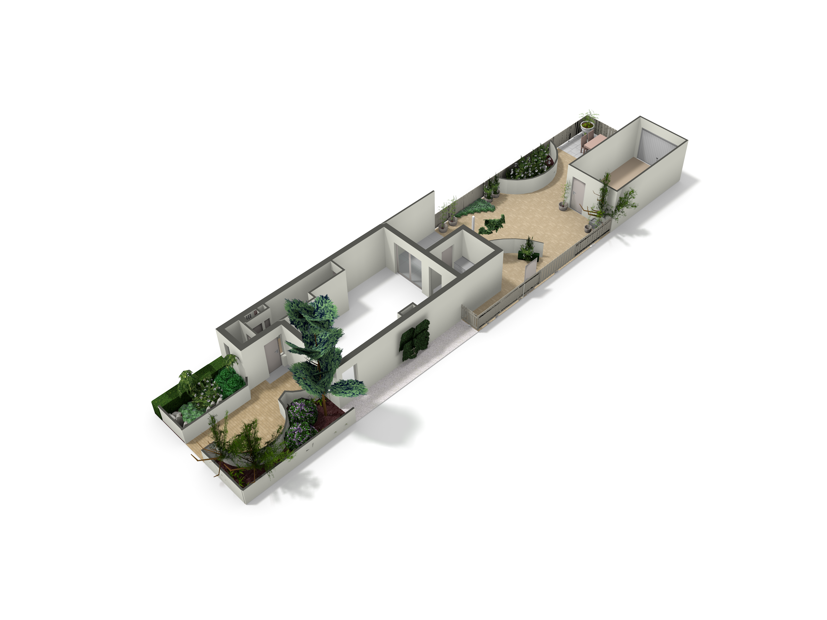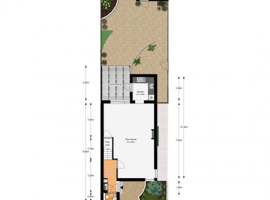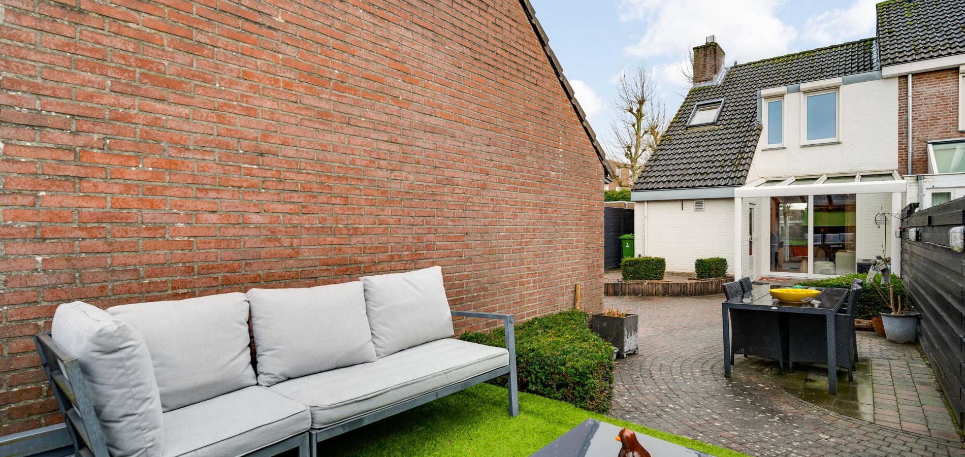 Het overdekte terras (circa 3,50 x 2,90) is een fijne plek om buiten te zitten, ook als het regent bij een goede temperatuur. De aansluitende, diepe achtertuin is ingedeeld met onderhoudsvriendelijke beplanting, meerdere terrassen en schuttingen in stoer zwart. De garage (circa 6,08 x 3,10) heeft een deur naar de tuin en een sectionaalpoort aan de achterzijde.