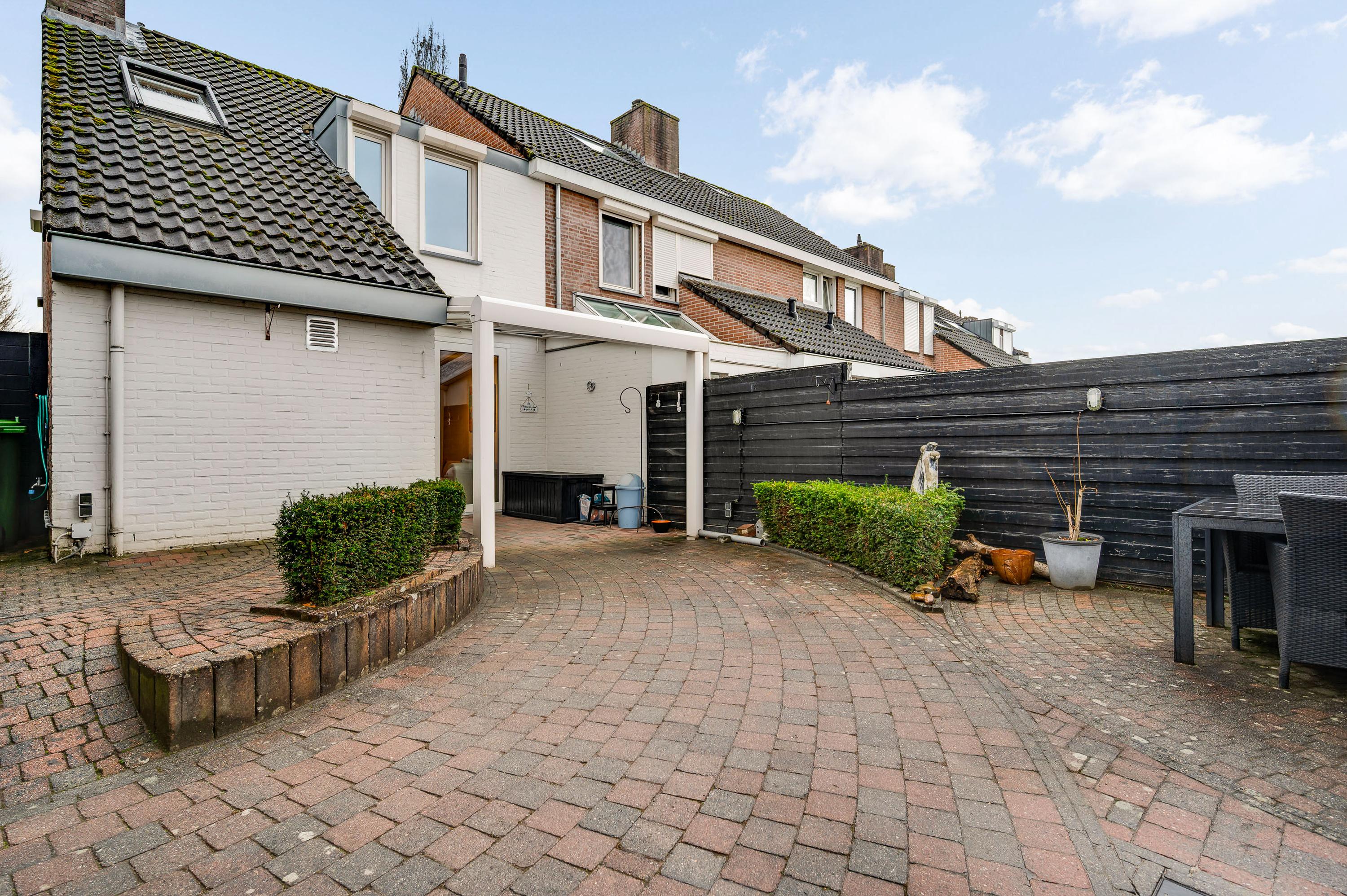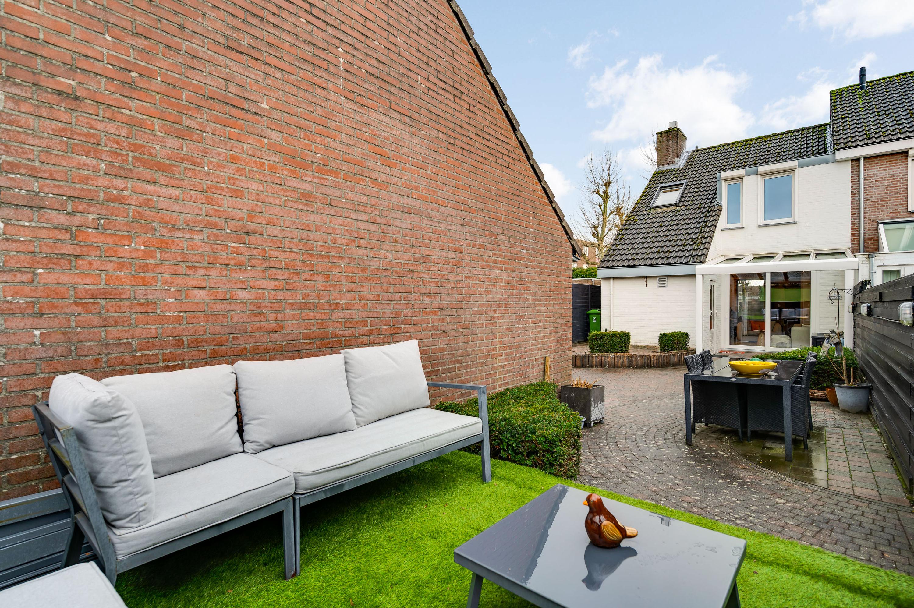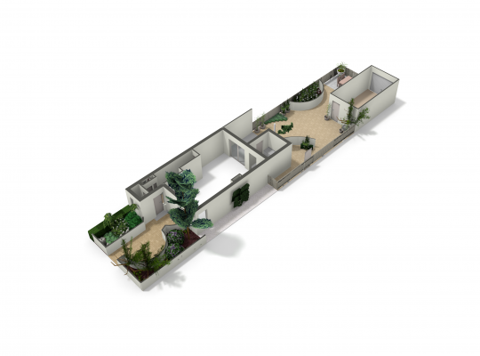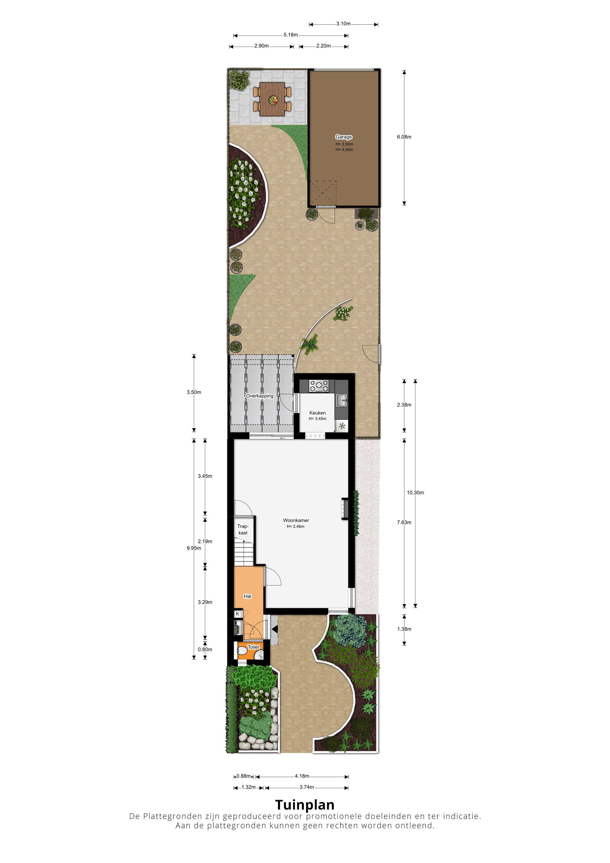 Het overdekte terras (circa 3,50 x 2,90) is een fijne plek om buiten te zitten, ook als het regent bij een goede temperatuur. De aansluitende, diepe achtertuin is ingedeeld met onderhoudsvriendelijke beplanting, meerdere terrassen en schuttingen in stoer zwart. De garage (circa 6,08 x 3,10) heeft een deur naar de tuin en een sectionaalpoort aan de achterzijde.