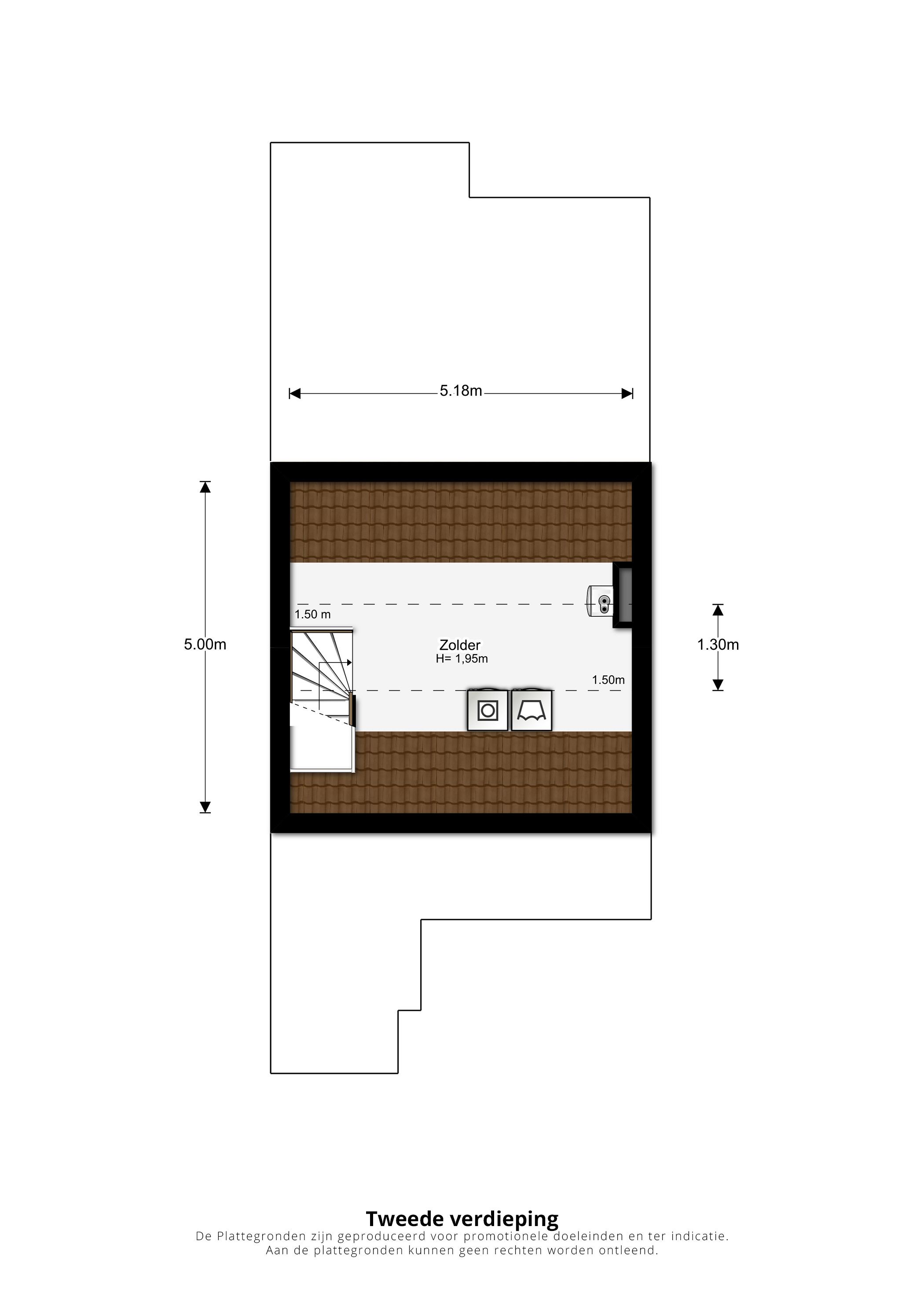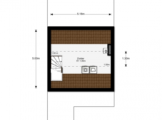 Een vaste trap geeft toegang tot een grote, multifunctionele ruimte (circa 5,18 x 5,00 vloeroppervlakte). Deze ruimte heeft een nokhoogte van circa 1,95 meter en is op het meetrapport aangemerkt als overige inpandige ruimte. Hier hangt de HR-ketel (Intergas, 2015, huur) en is de opstelling van de wasapparatuur.