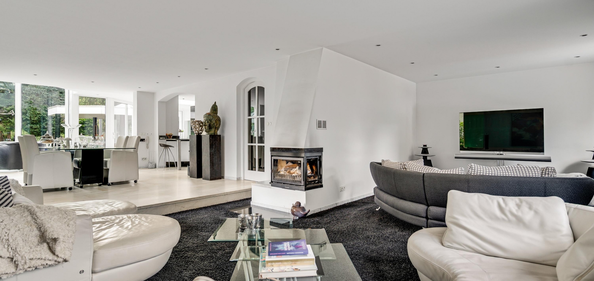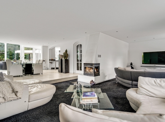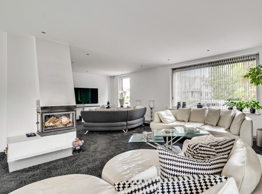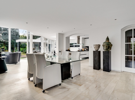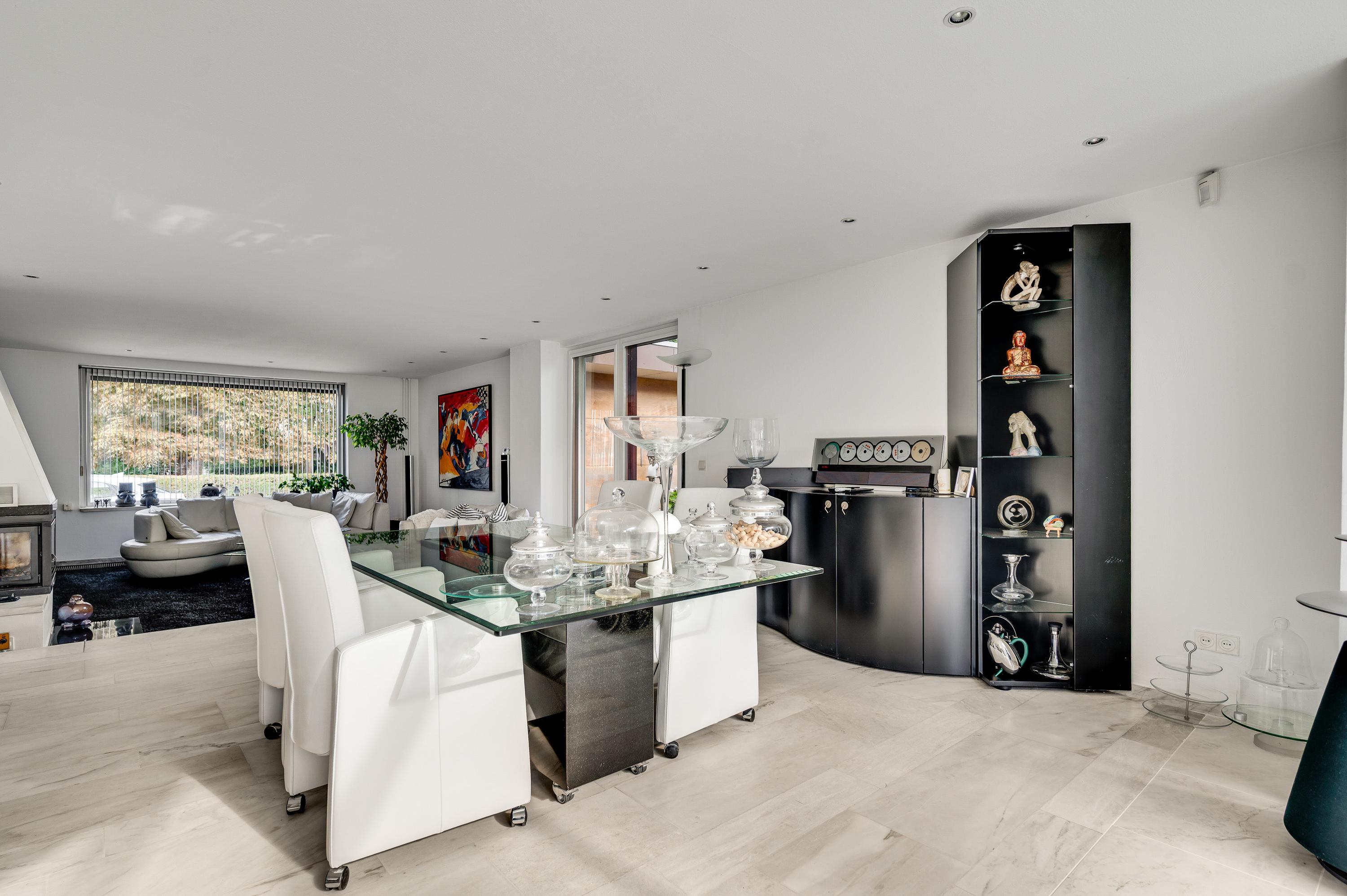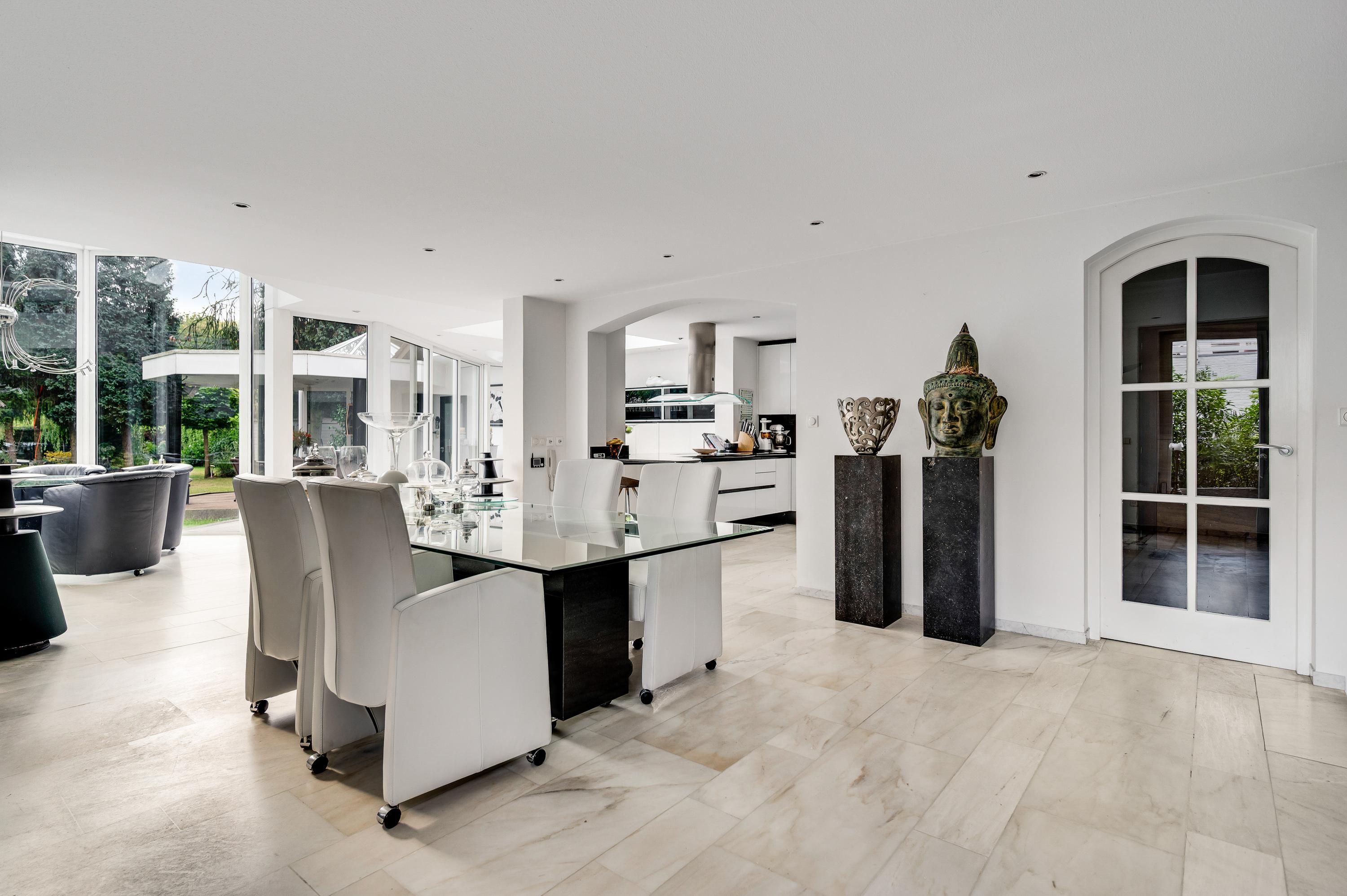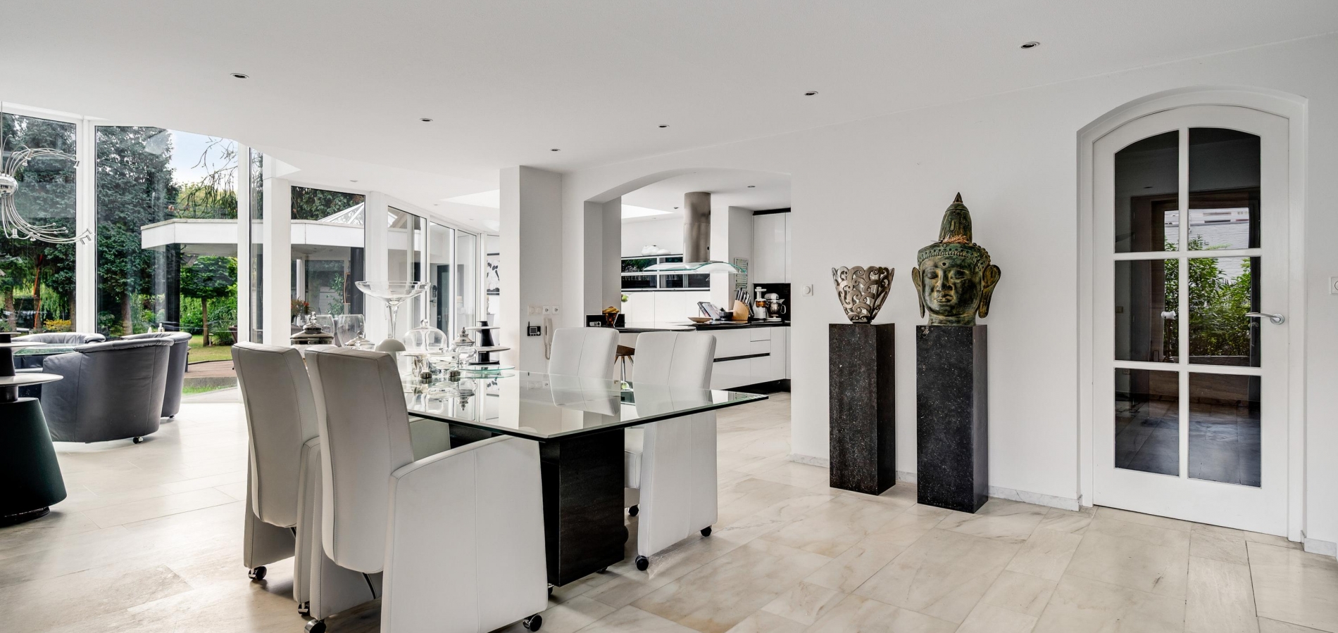 Vanuit de hal is de eetkamer te bereiken die in open verbinding met de woonkamer, keuken en de fraaie aanbouw staat. De L-vormige woonkamer, met een inbouwhaard en hoogpolig tapijt, heeft een oppervlakte van circa 35 m2. Bij de eetkamer (circa 27 m2) en in de keuken (circa 10,8 m2) ligt, net als in de hal en aanbouw, een fraaie tegelvloer. Er is genoeg plek voor een grote eettafel en in de keuken staat een royale U-opstelling, met een aanrechtblad en achterwand van graniet. Alle benodigde apparatuur is ingebouwd, van een inductie kookplaat met design afzuigkap tot kokend waterkraan en een dubbeldeurs koel-/vrieskast.