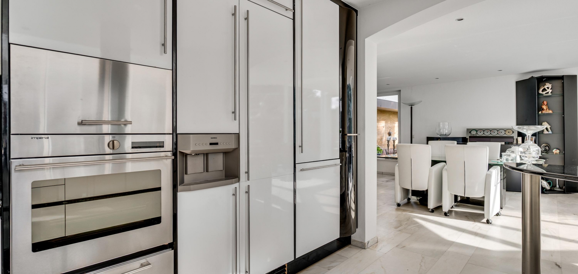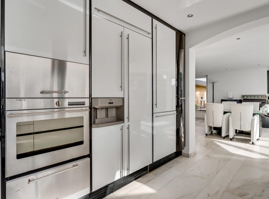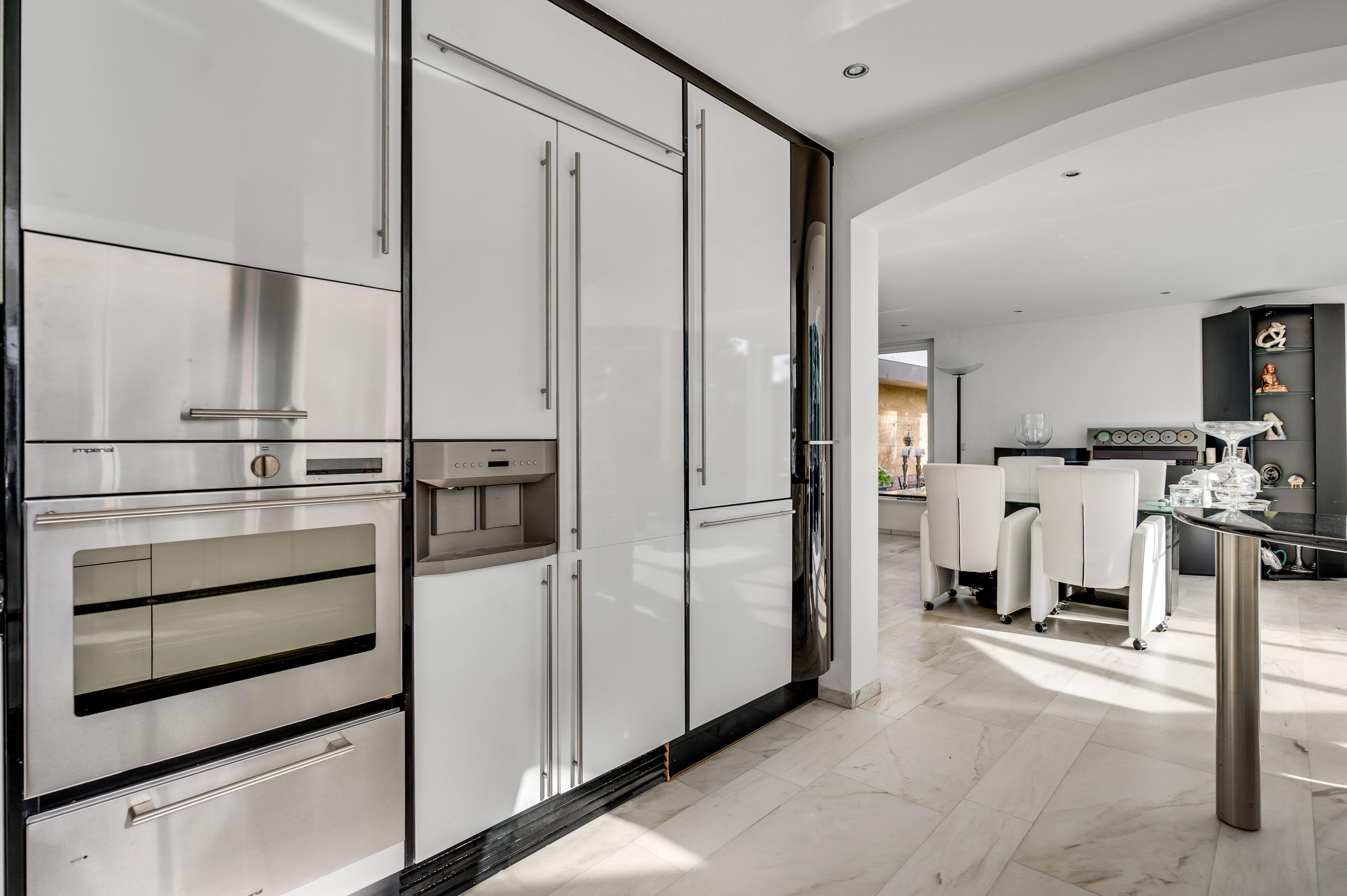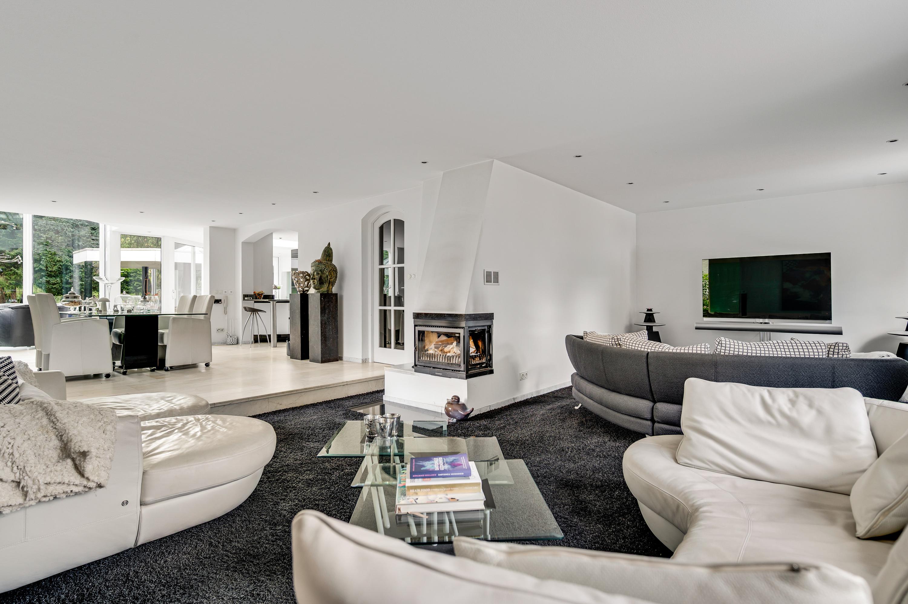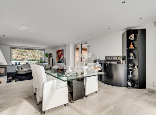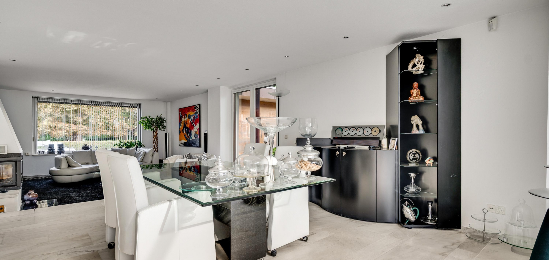 Vanuit de hal is de eetkamer te bereiken die in open verbinding met de woonkamer, keuken en de fraaie aanbouw staat. De L-vormige woonkamer, met een inbouwhaard en hoogpolig tapijt, heeft een oppervlakte van circa 35 m2. Bij de eetkamer (circa 27 m2) en in de keuken (circa 10,8 m2) ligt, net als in de hal en aanbouw, een fraaie tegelvloer. Er is genoeg plek voor een grote eettafel en in de keuken staat een royale U-opstelling, met een aanrechtblad en achterwand van graniet. Alle benodigde apparatuur is ingebouwd, van een inductie kookplaat met design afzuigkap tot kokend waterkraan en een dubbeldeurs koel-/vrieskast.