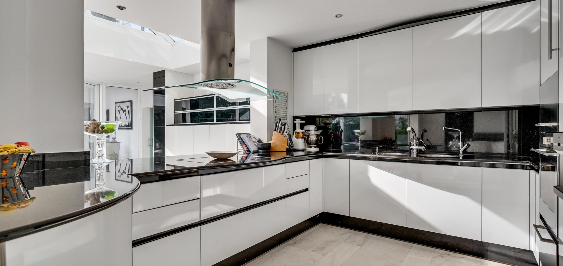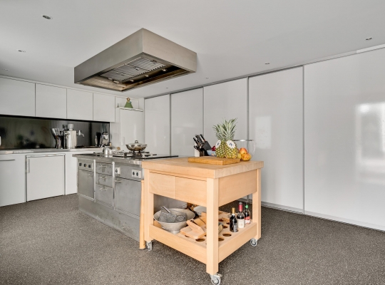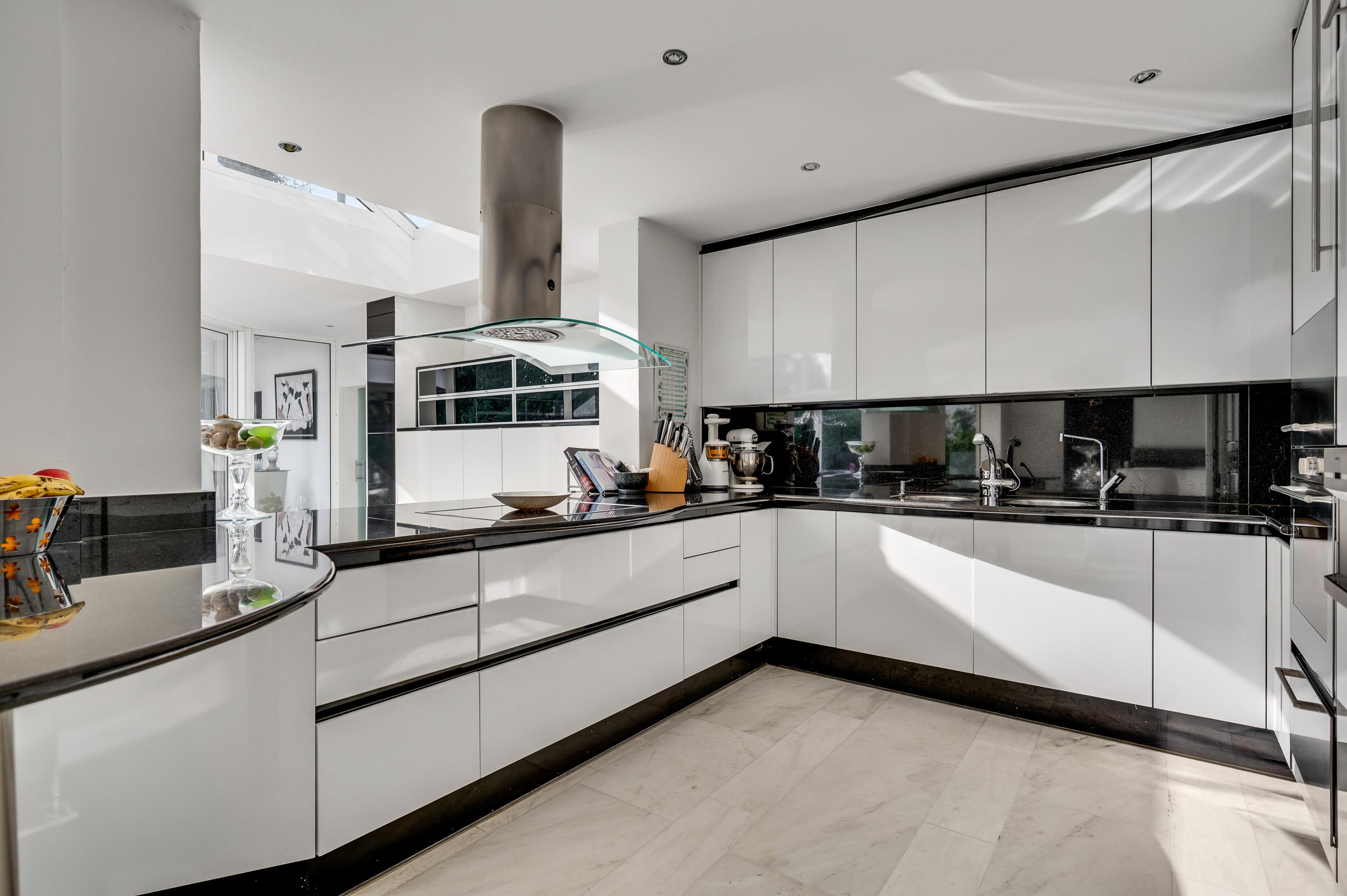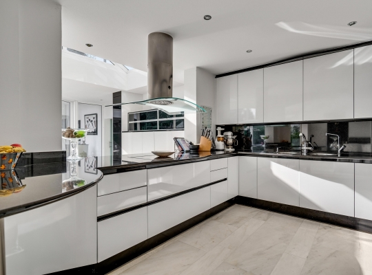 In de hoek van de aanbouw is een deur naar een zeer verrassende, professionele keuken (circa 6,58 x 4,25) met een vaste kastenwand, een royaal spoelgedeelte en een groot kookeiland. Deze ruimte heeft dubbele deuren naar een ruime garage (circa 6,82 x 4,86/4,50), die vervolgens toegang biedt tot de deels overdekte oprit.