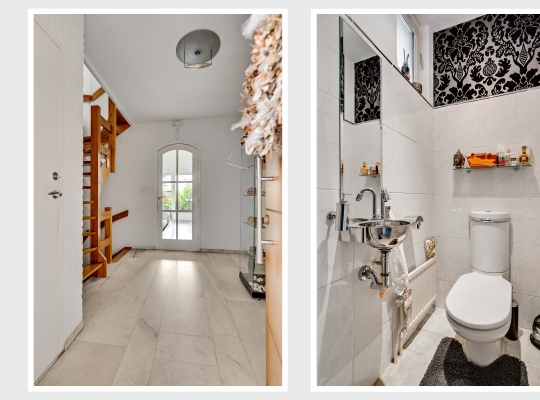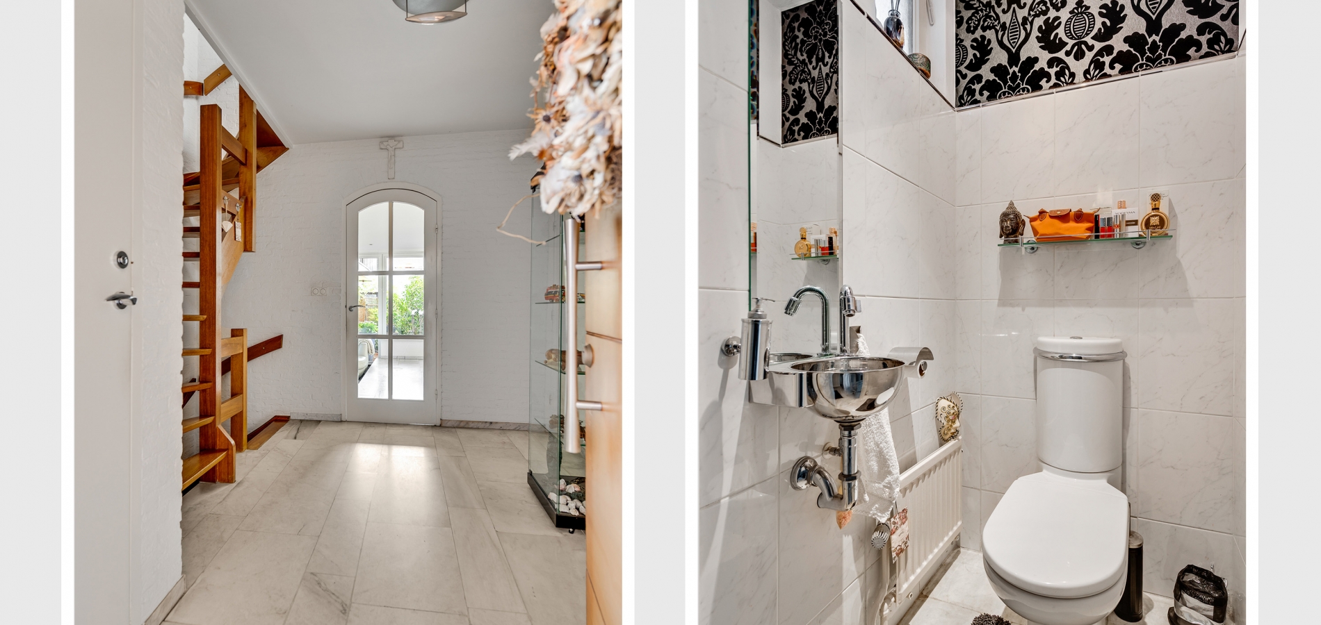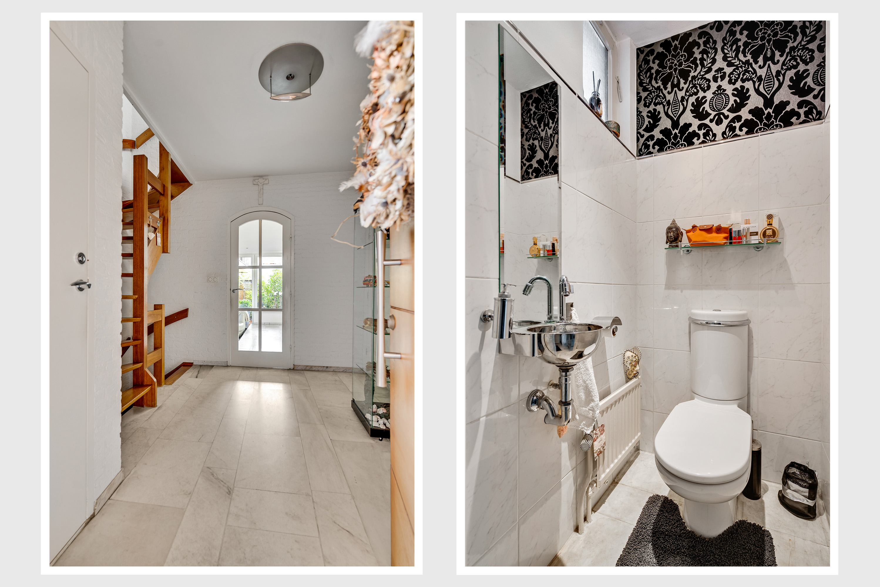 Aan de rechterzijde bij de lange oprit, is de entree van deze vrijstaande woning. In de hal, naast de meterkast, is de garderobe en aan de andere zijde is de toiletruimte. De trappen naar het souterrain en eerste verdieping zijn uitgevoerd in hardhout.