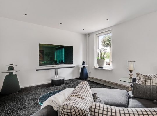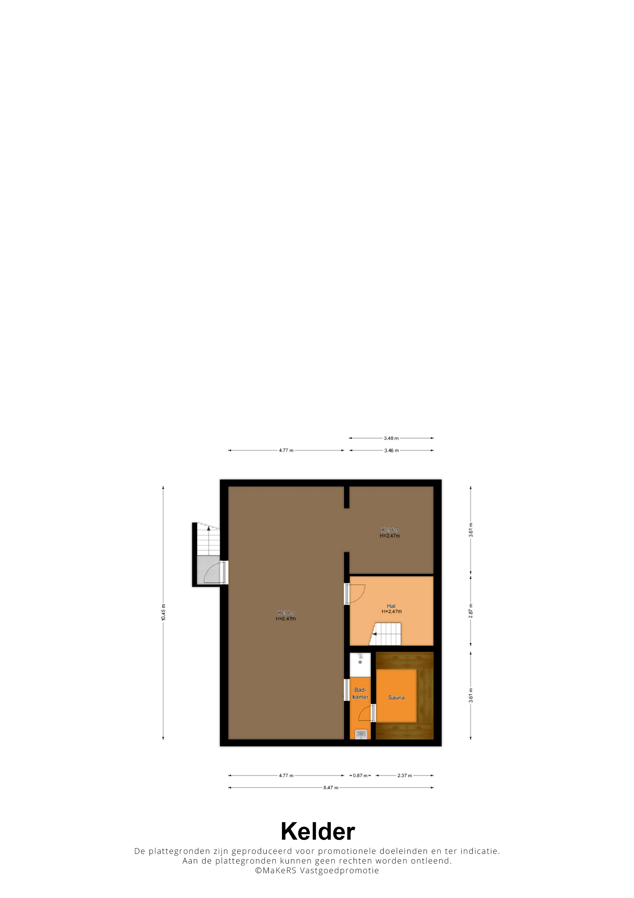 Wat u aan de voorzijde niet ziet, is het ruime souterrain met een plafondhoogte van circa 2,47 meter. De grootste ruimte is een L-vormige, multifunctionele ruimte van circa 60 m2 die via een buitentrap in verbinding met de tuin staat. Verder zijn er een trapportaal, geschikt als provisieruimte en een wellnessruimte (circa 3,58 x 3,46) met een ruime douche en een meerpersoons sauna.