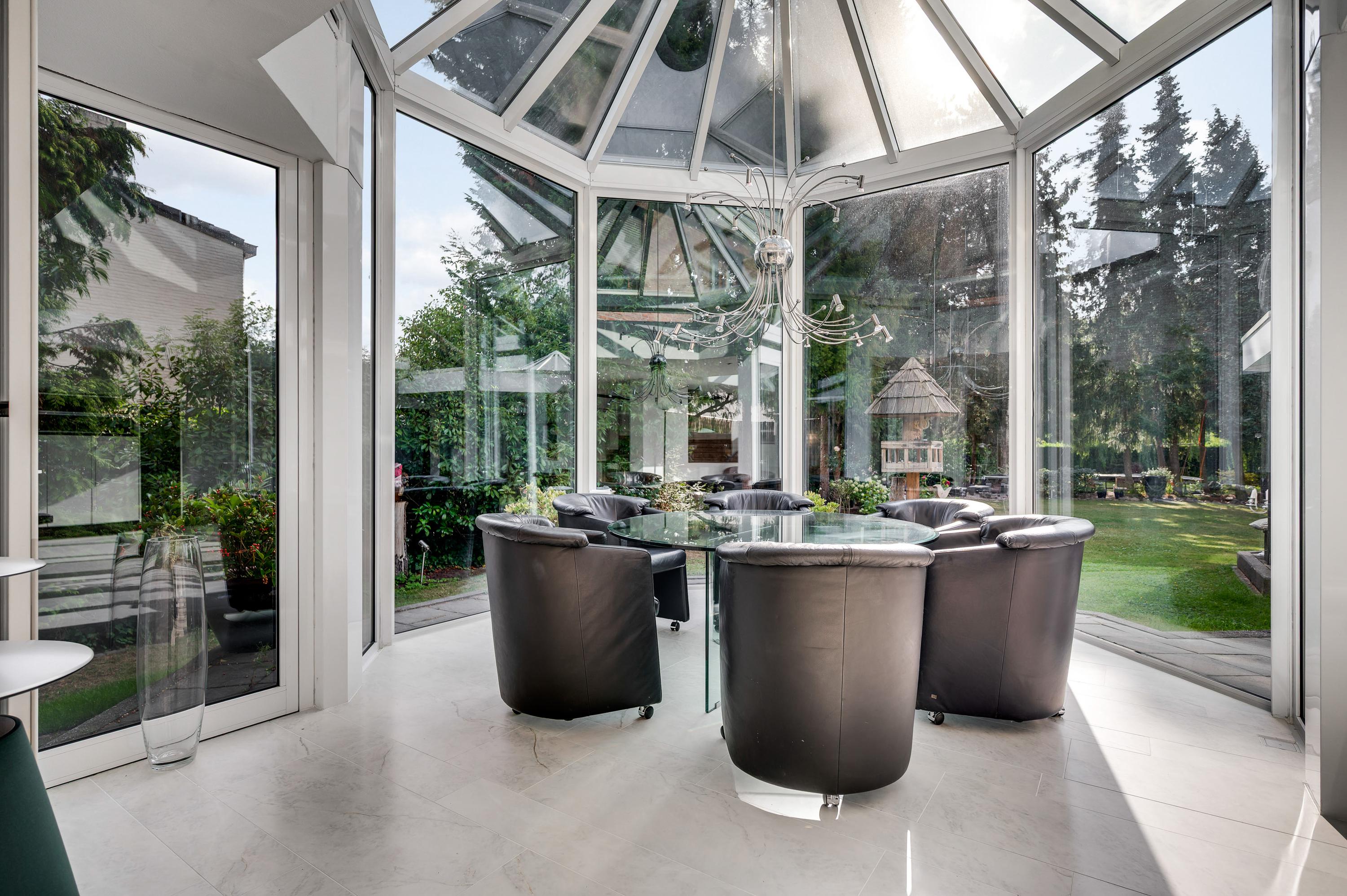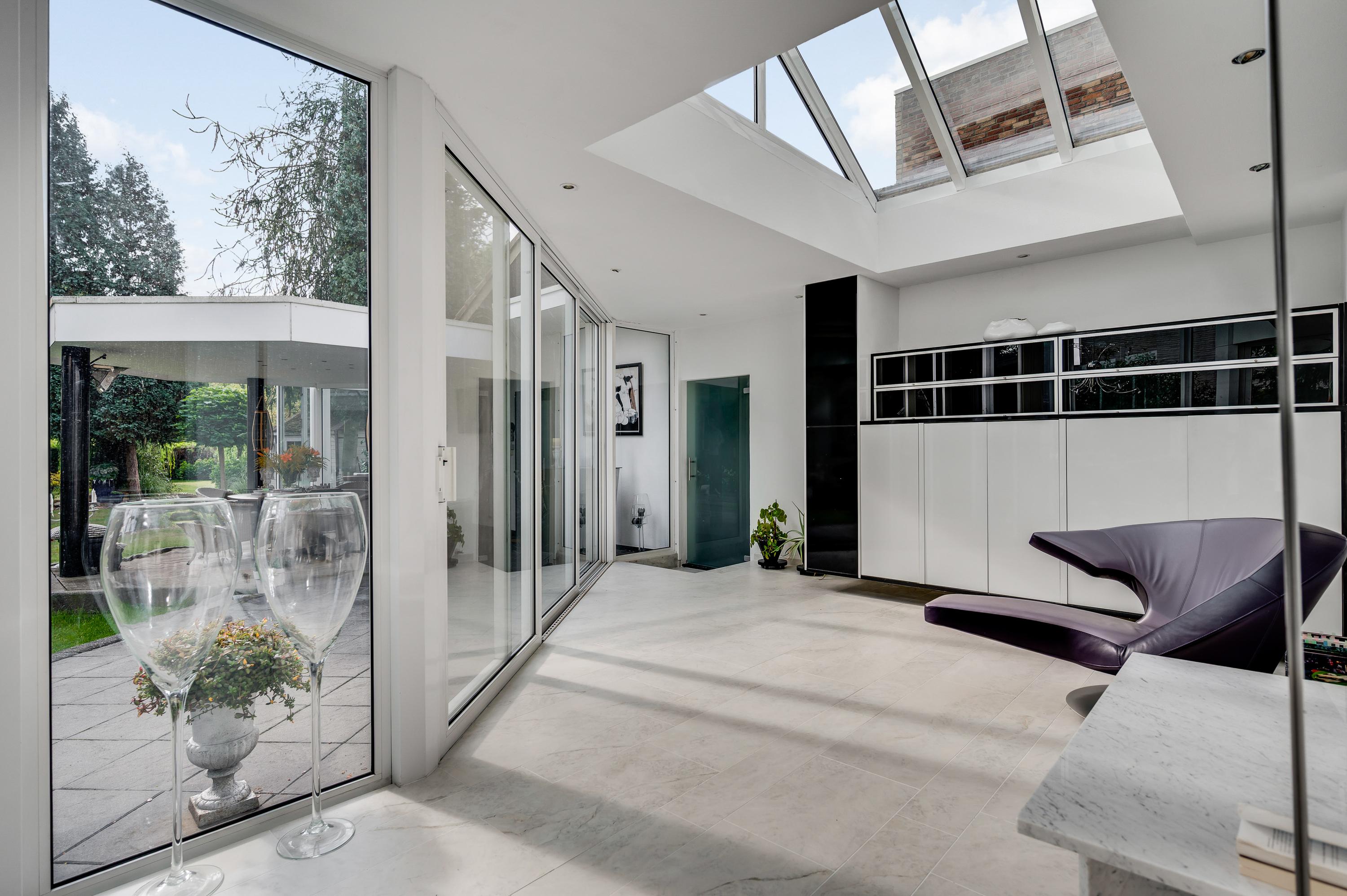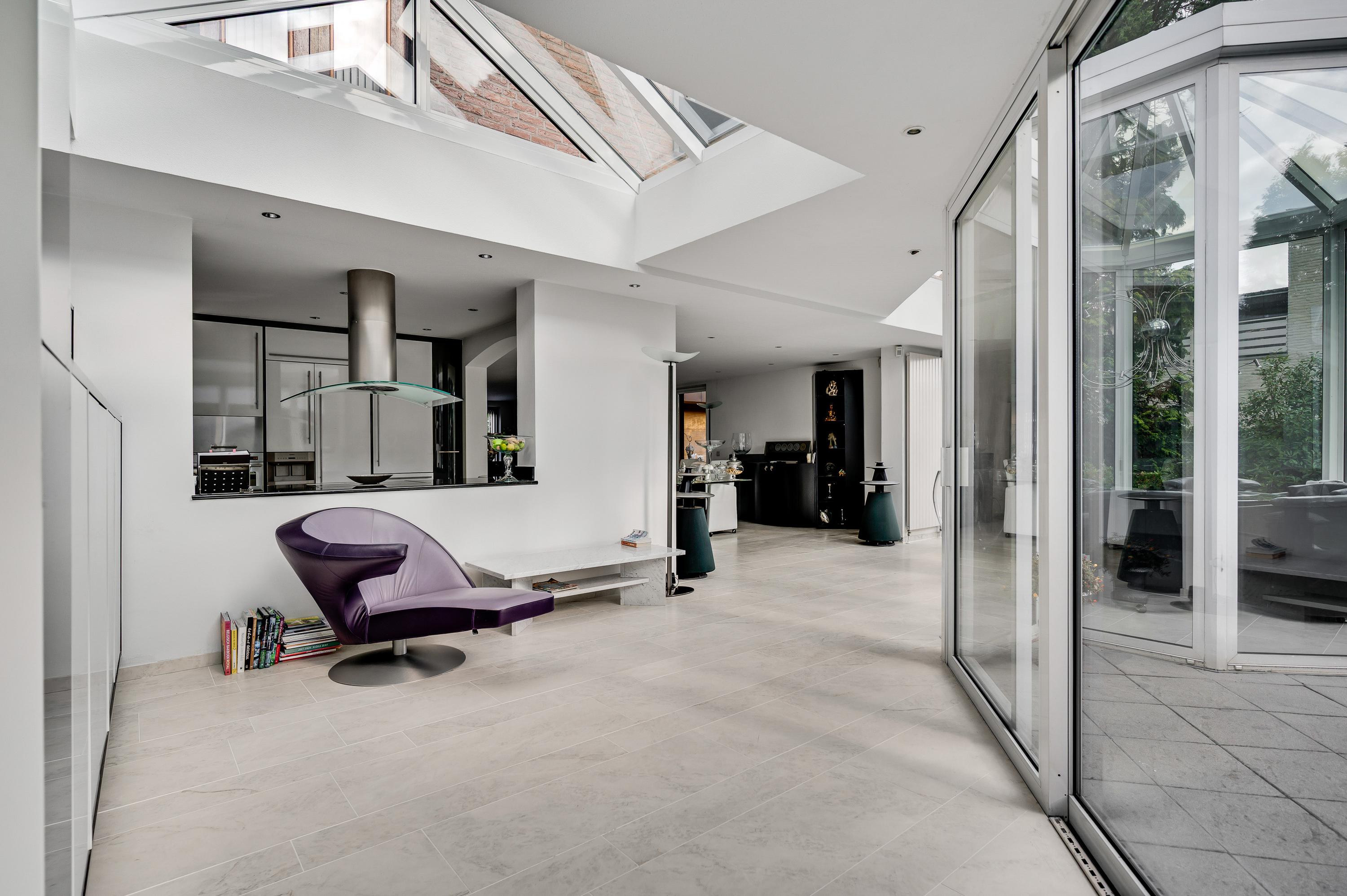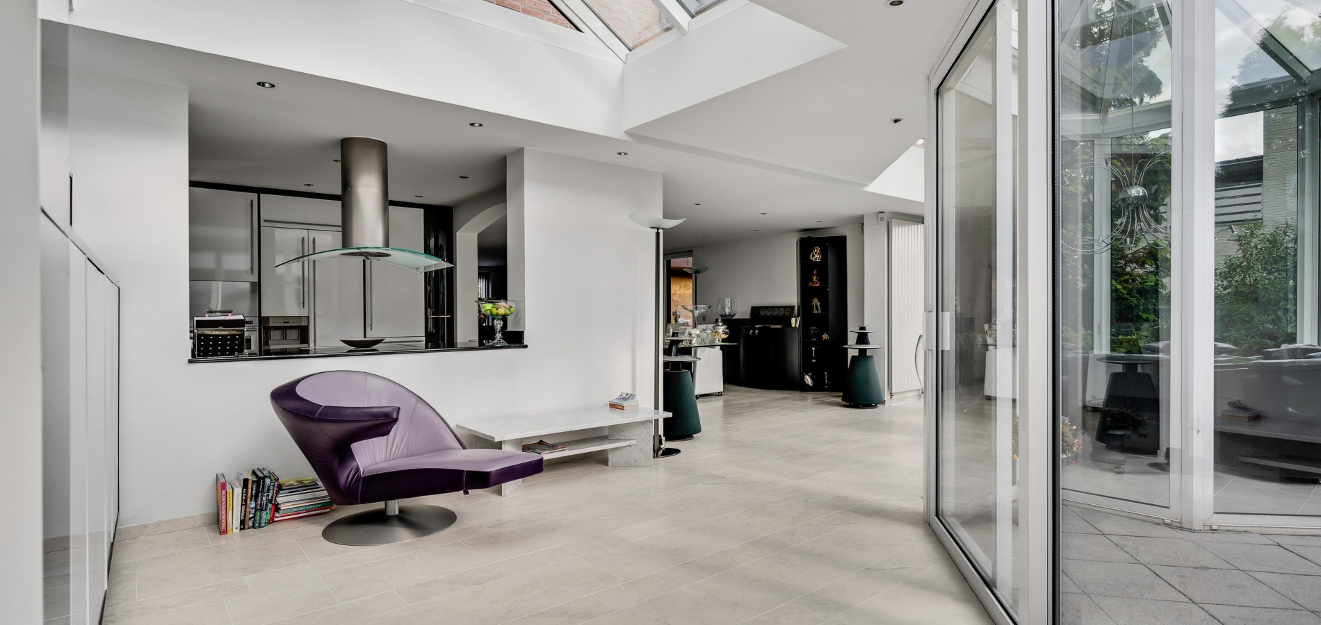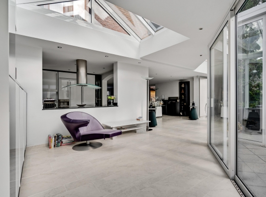 Veel woningen hebben een recht-toe-recht aan aanbouw, om extra ruimte in huis te creëren. Dat geldt niet voor deze woning, met een prachtige serre en een speels vormgegeven aanbouw met lichtstraat. De serre is thans ingericht met een ronde tafel, en het andere deel van de aanbouw is een fijne zit-/leesplek met uitzicht naar de tuin.