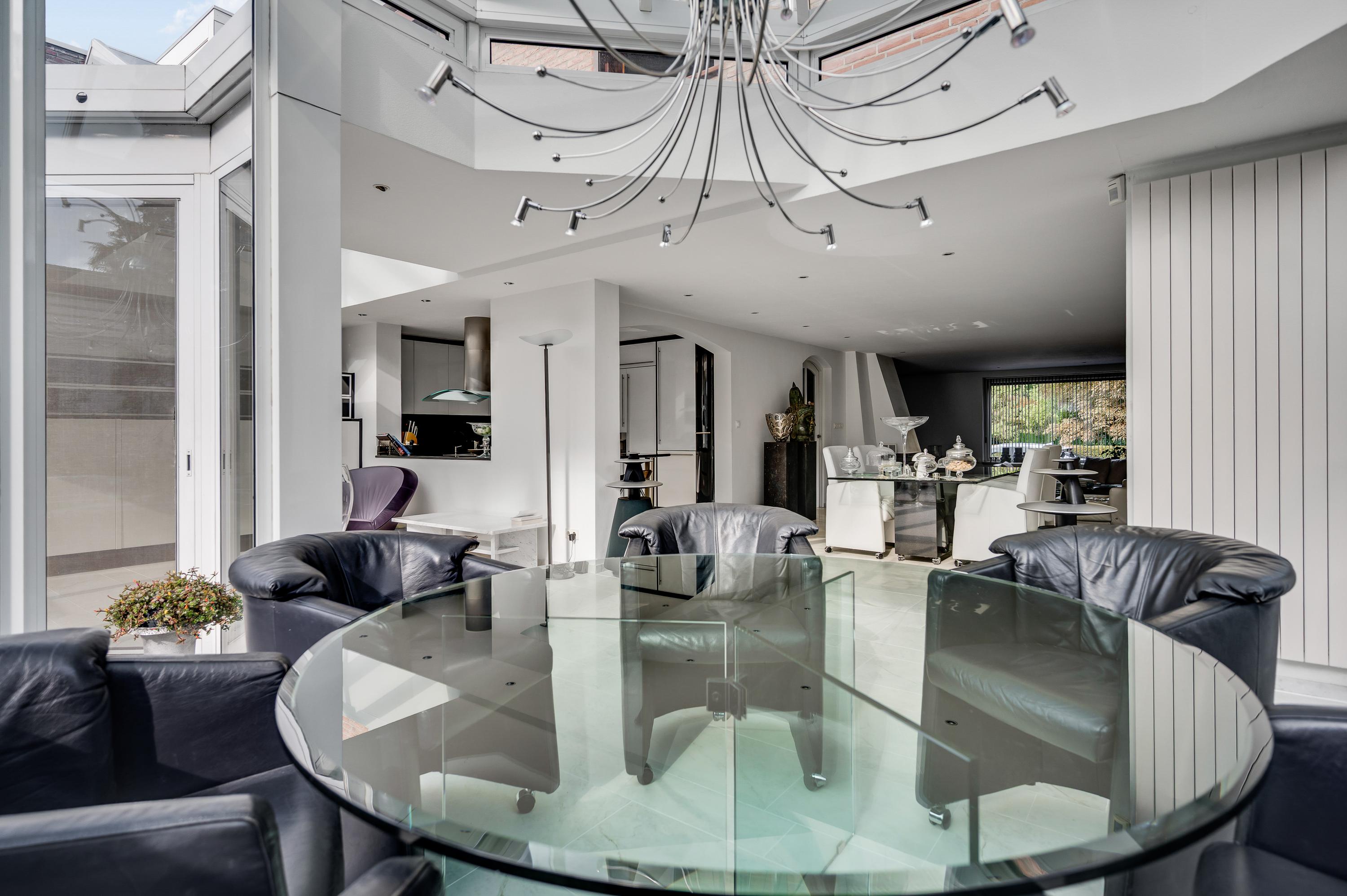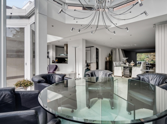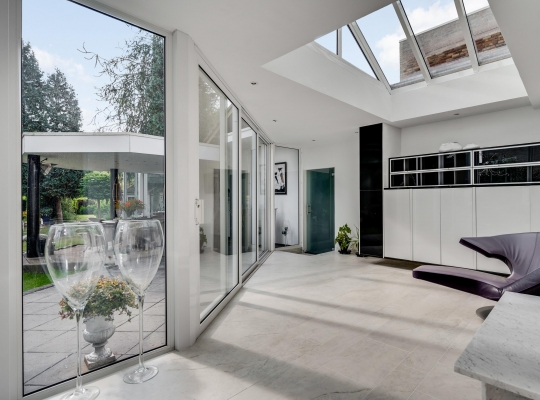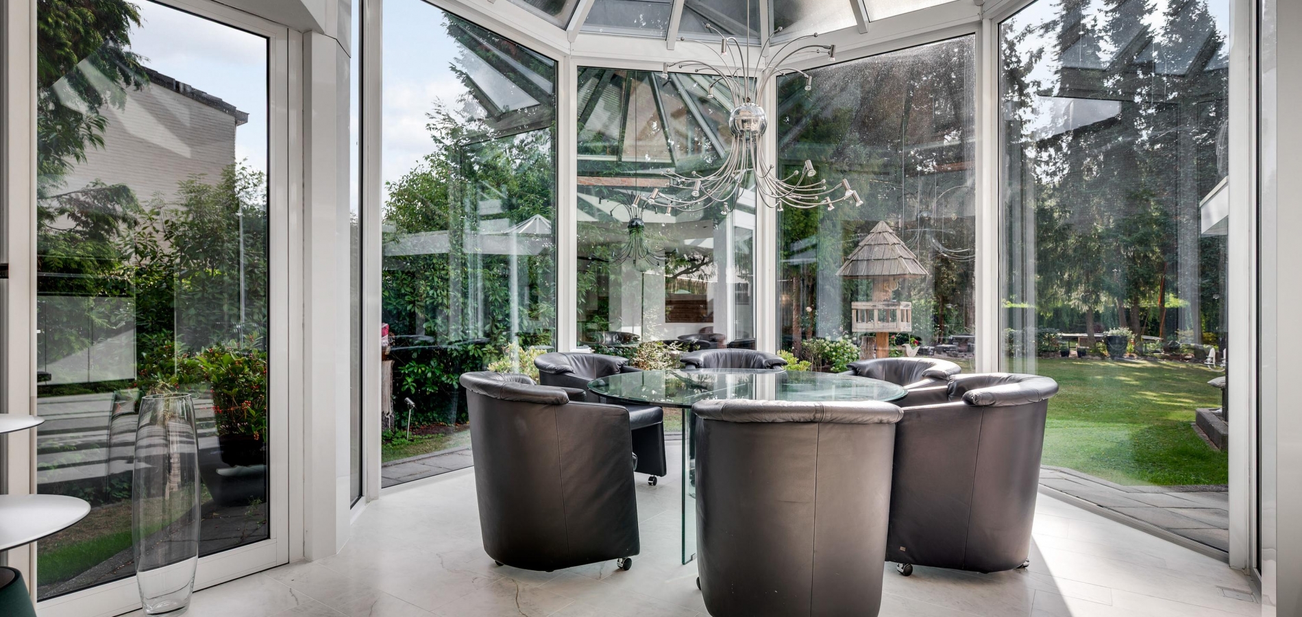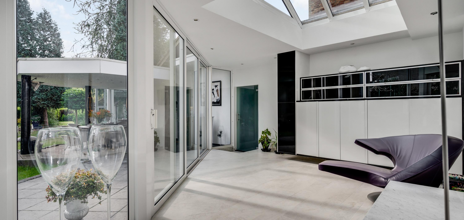 Veel woningen hebben een recht-toe-recht aan aanbouw, om extra ruimte in huis te creëren. Dat geldt niet voor deze woning, met een prachtige serre en een speels vormgegeven aanbouw met lichtstraat. De serre is thans ingericht met een ronde tafel, en het andere deel van de aanbouw is een fijne zit-/leesplek met uitzicht naar de tuin.