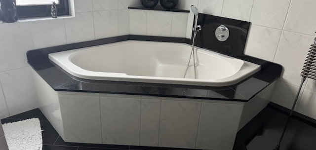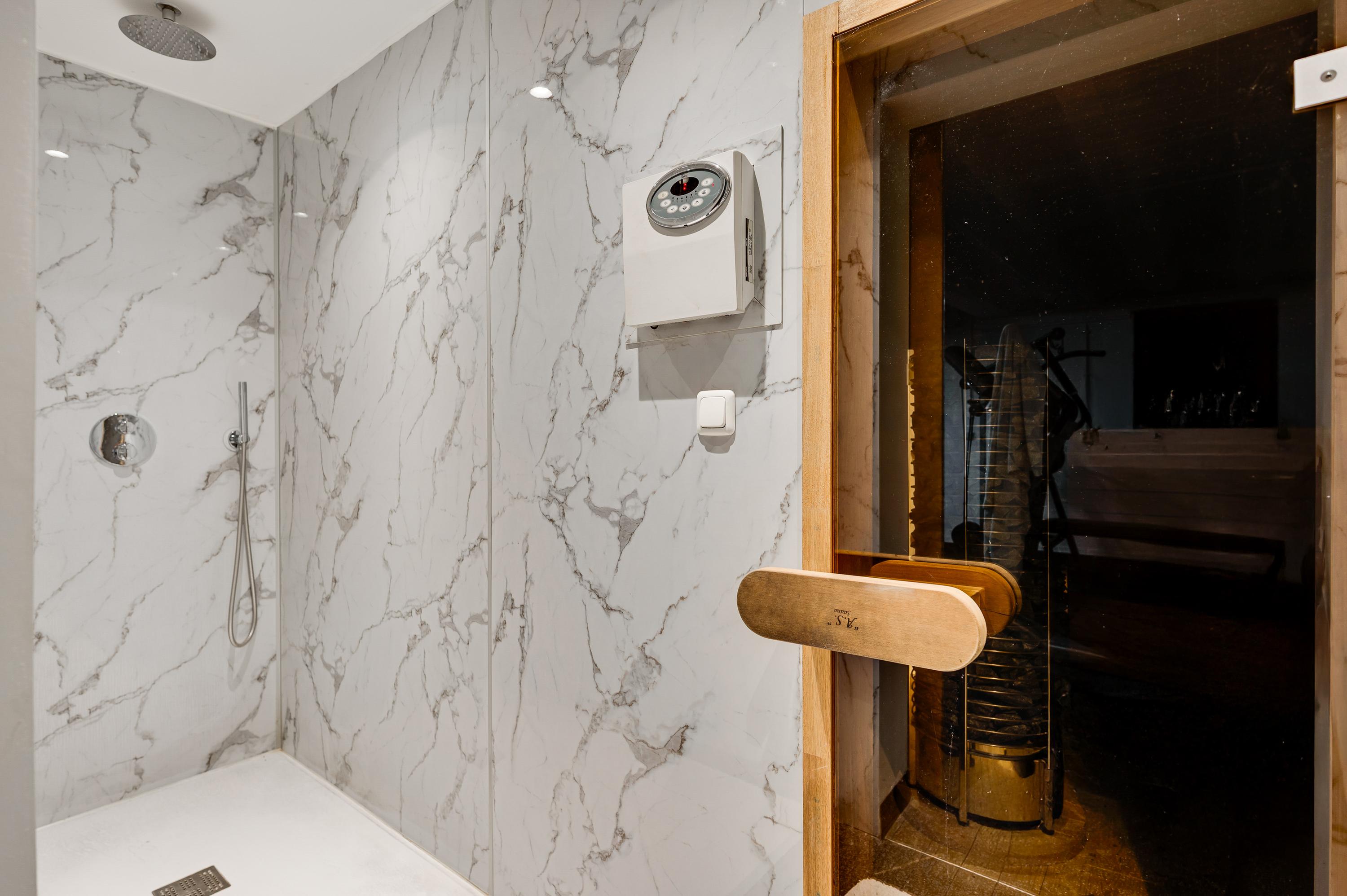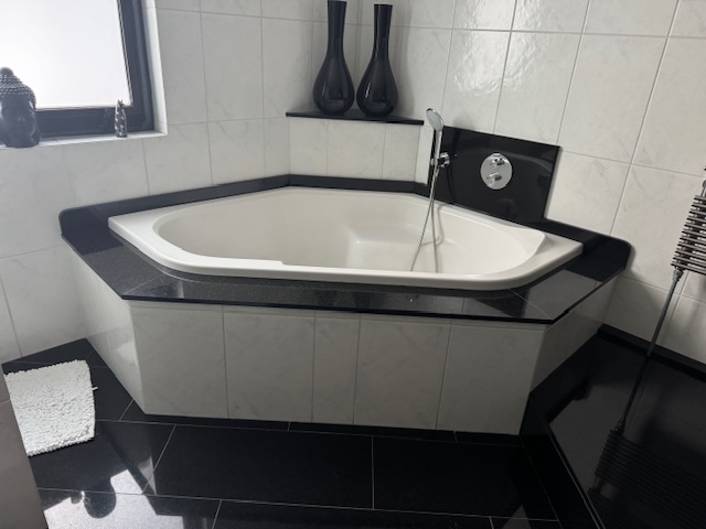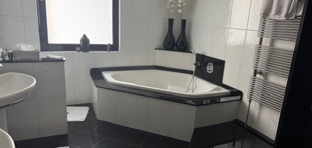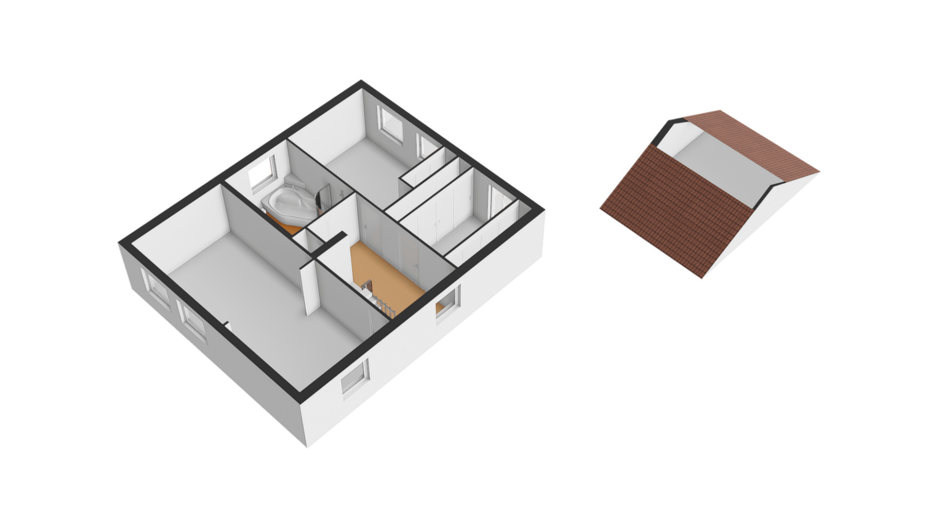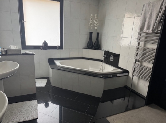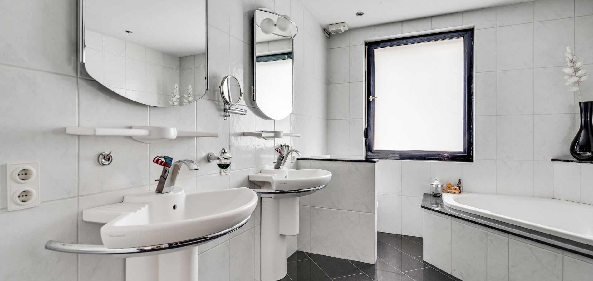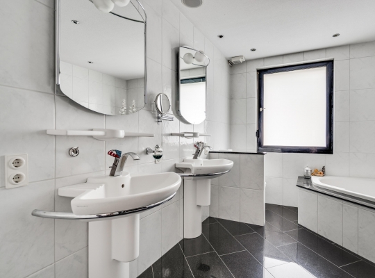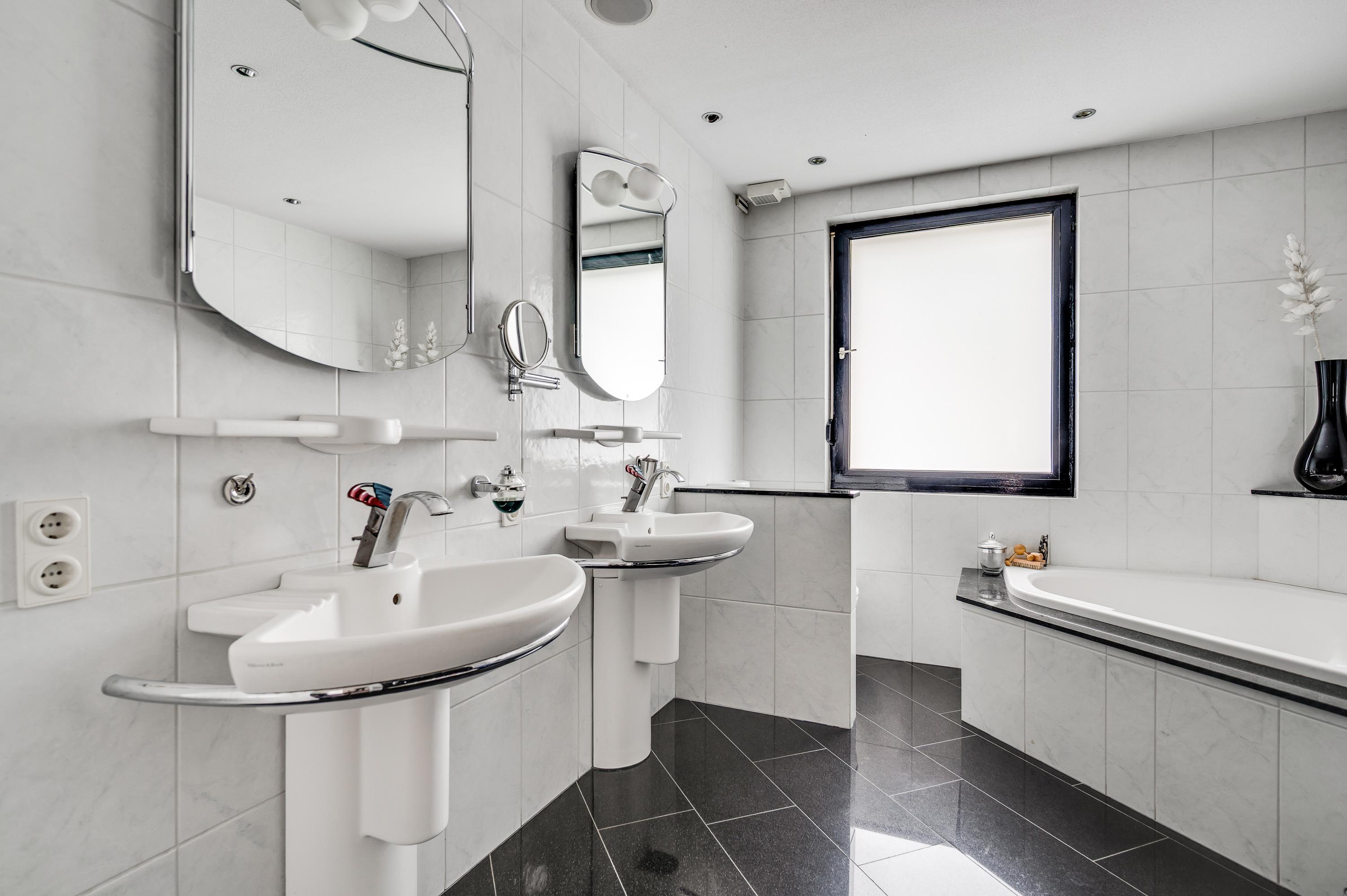 In het hart van deze verdieping is de badkamer (circa 3,52 x 2,77). Deze ruimte, met een groot zijraam, is ingedeeld met een hoekbad, inloopdouche, een toilet en twee wastafels van Villeroy & Boch.