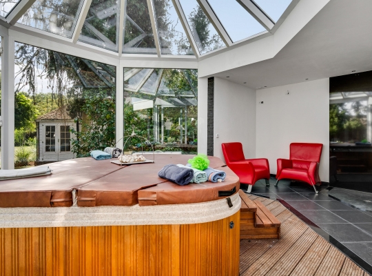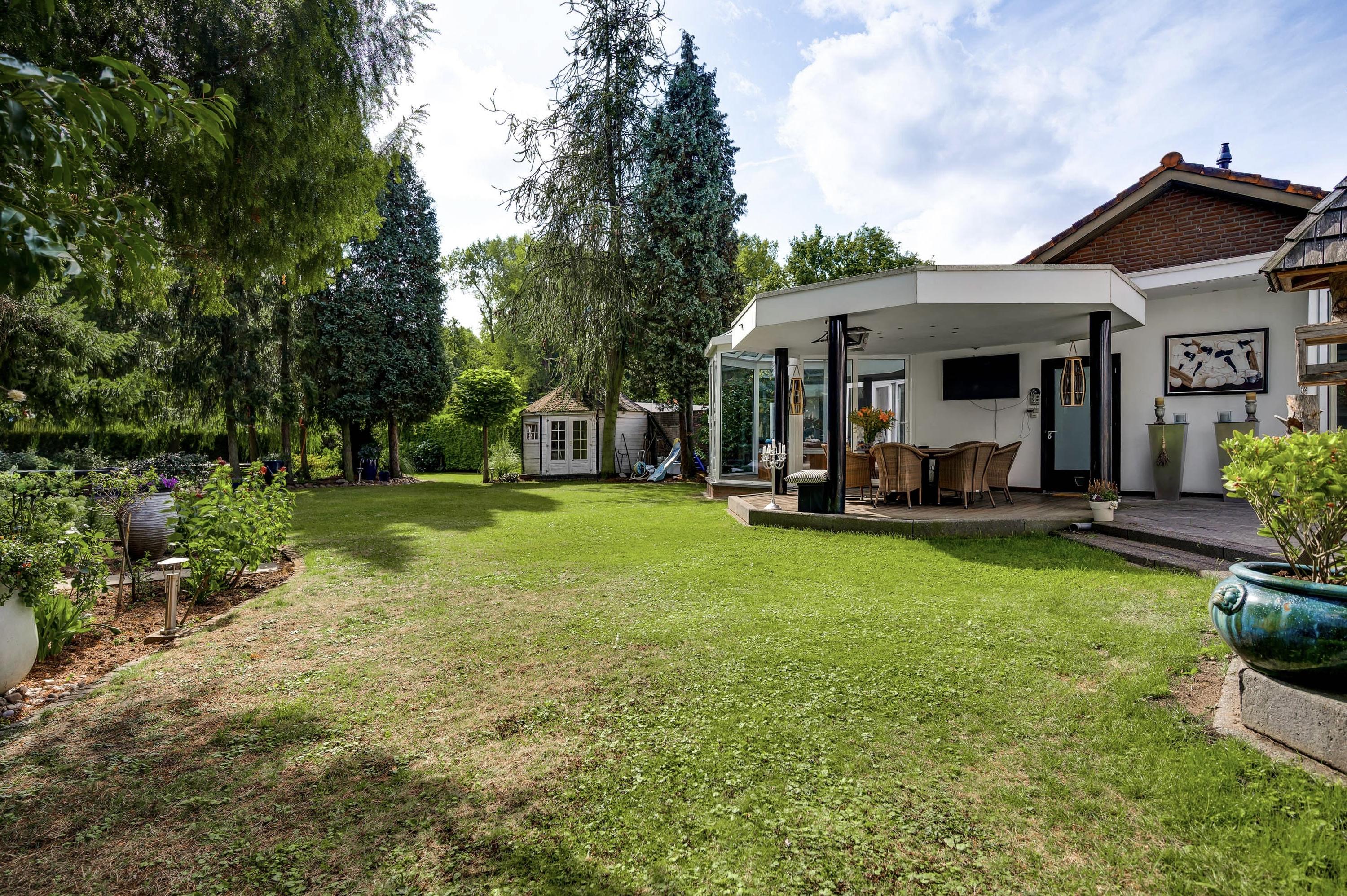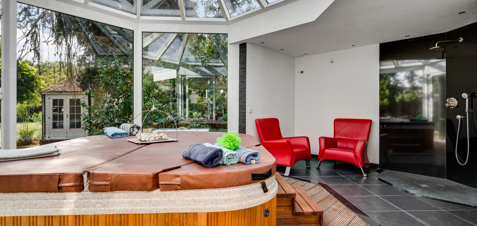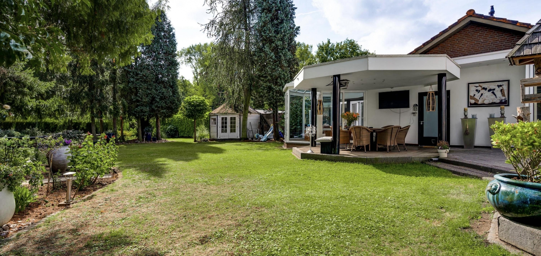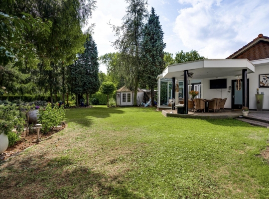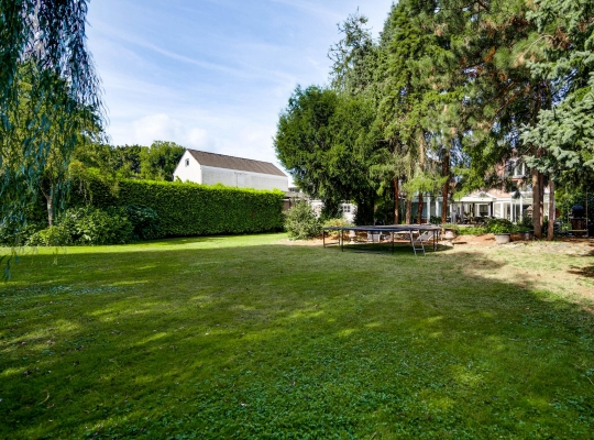 Vanuit de aanbouw en tweede keuken is de tuin te bereiken, met een 8-hoekig terras en een tweede wellnessruimte met jacuzzi en douche. Met de deuren open of dicht is dit een heerlijke plek om te genieten, met veel privacy en mooi uitzicht naar de tuin. Ontdek ook het tweede deel van de tuin, achter de bomen, waar nu een trampoline op het gazon staat. Dit is niet zomaar een tuin, maar een zeer ruime tuin die voor kinderen en mensen met groene vingers heel geschikt is!