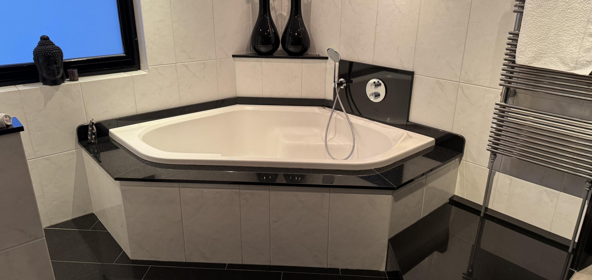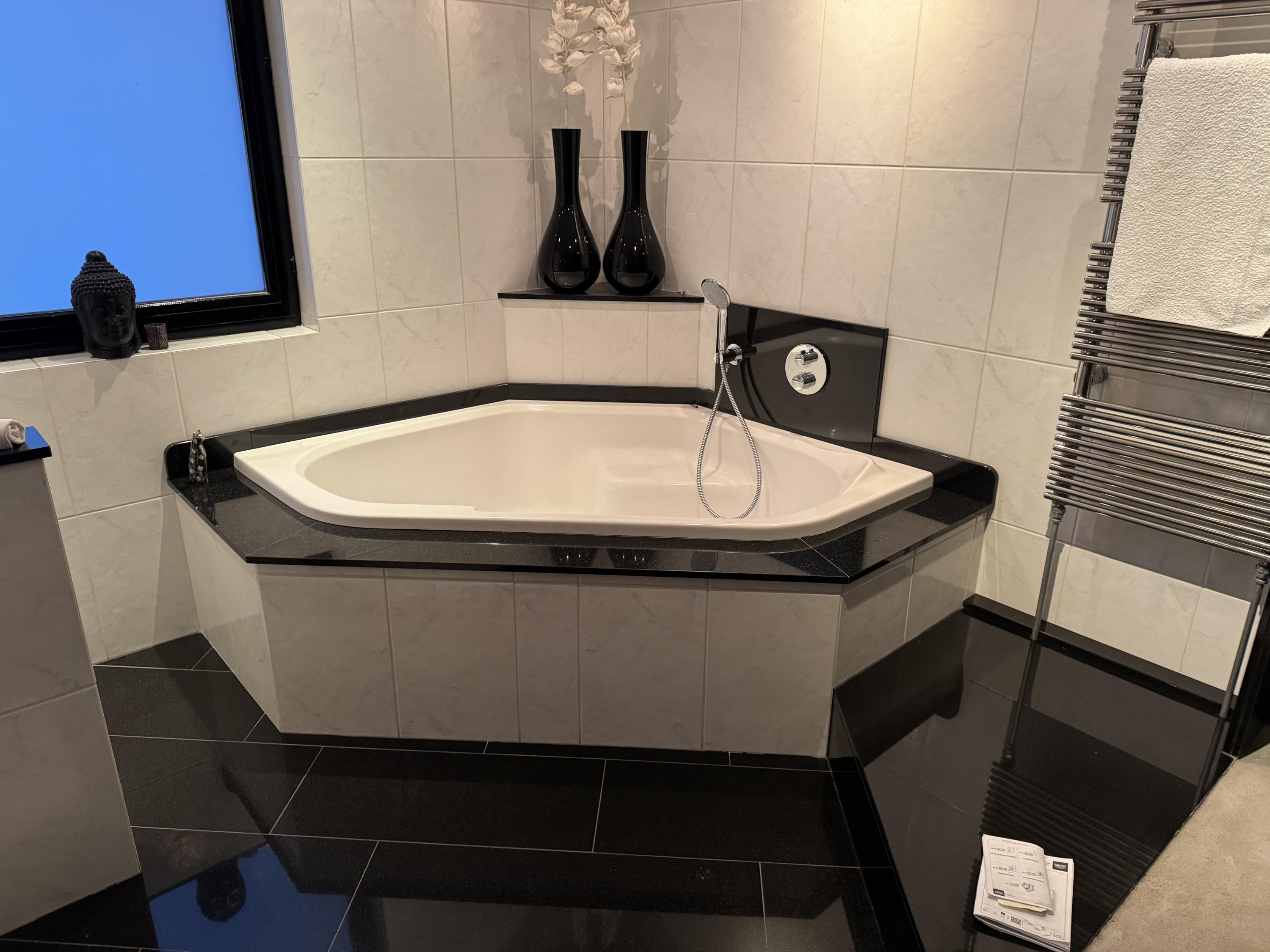 In het hart van deze verdieping is de badkamer (circa 3,52 x 2,77). Deze ruimte, met een groot zijraam, is ingedeeld met een hoekbad, inloopdouche, een toilet en twee wastafels van Villeroy & Boch.