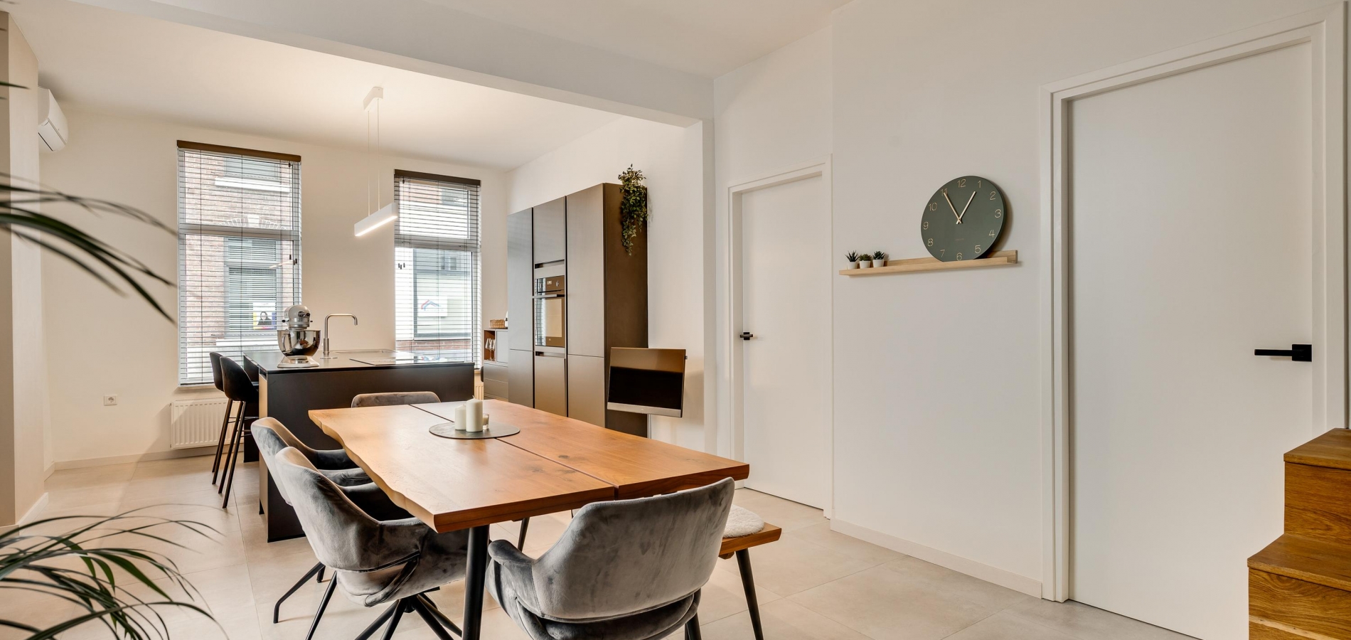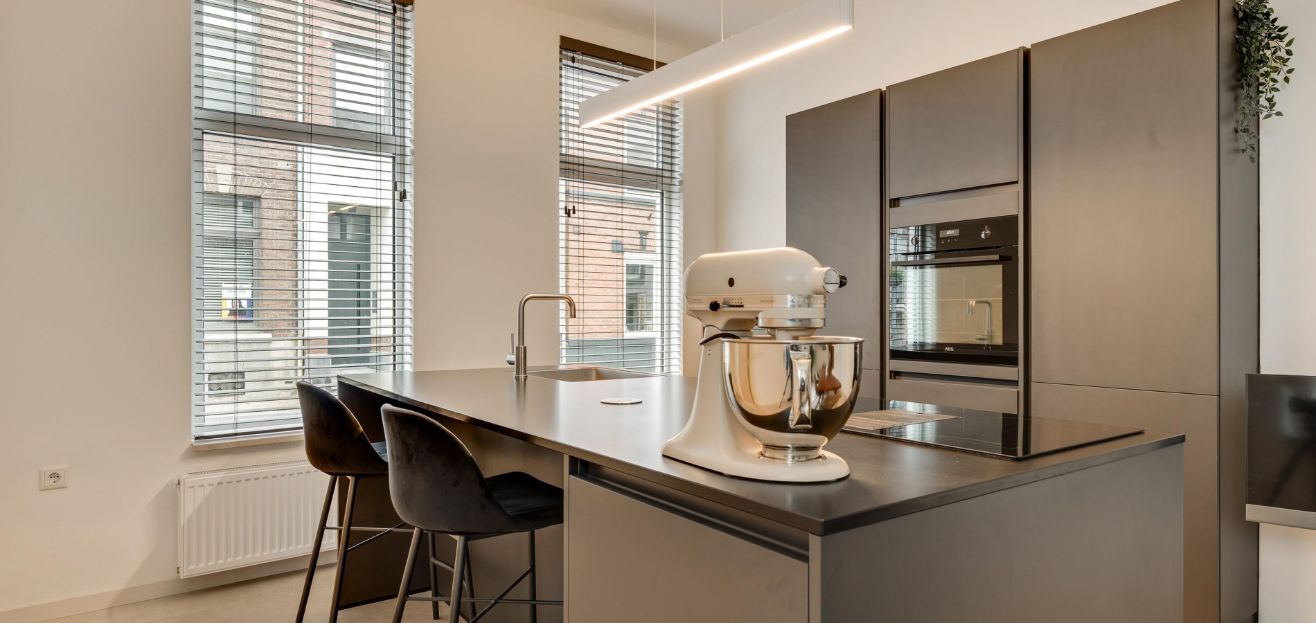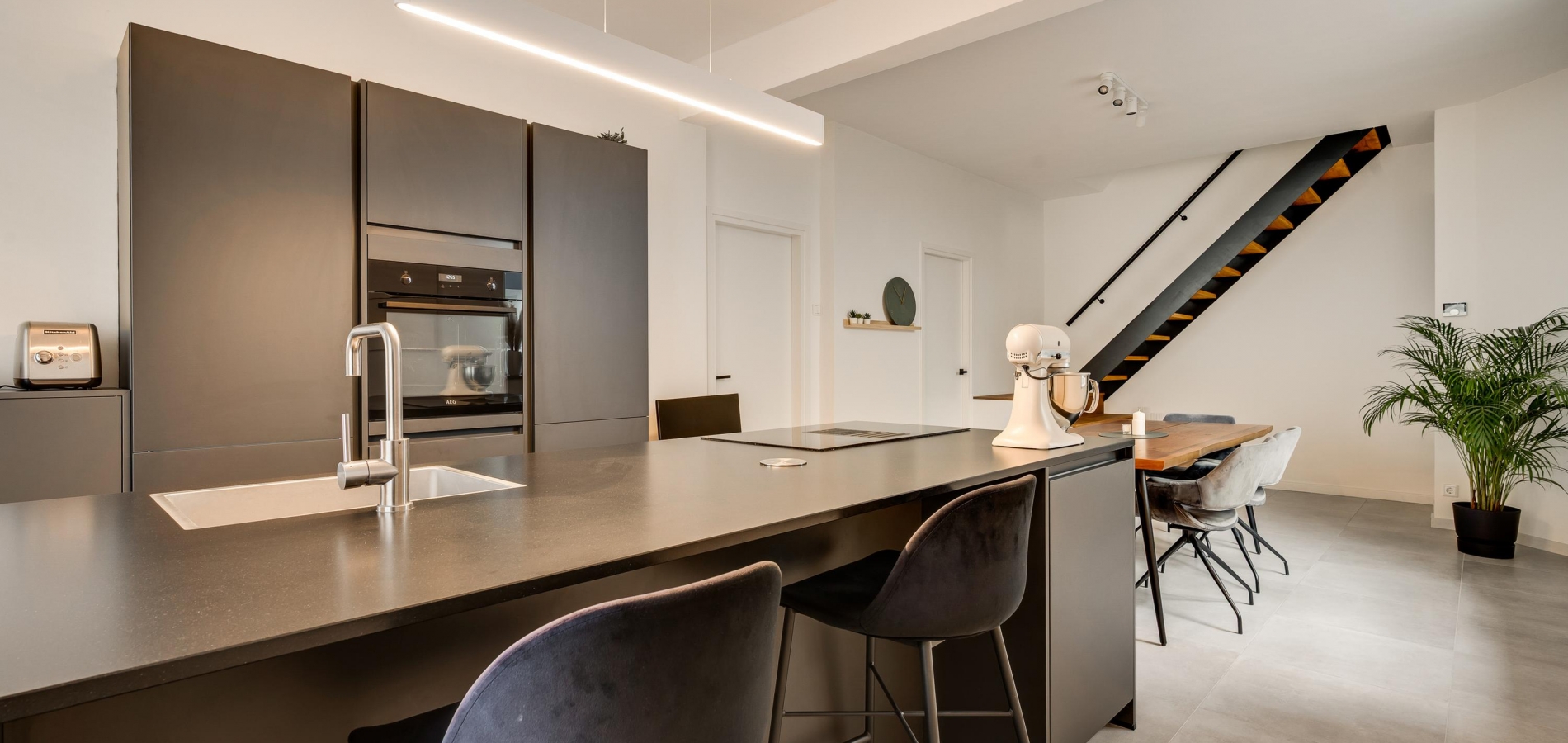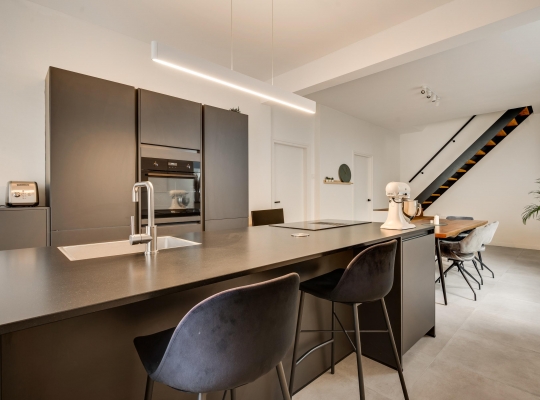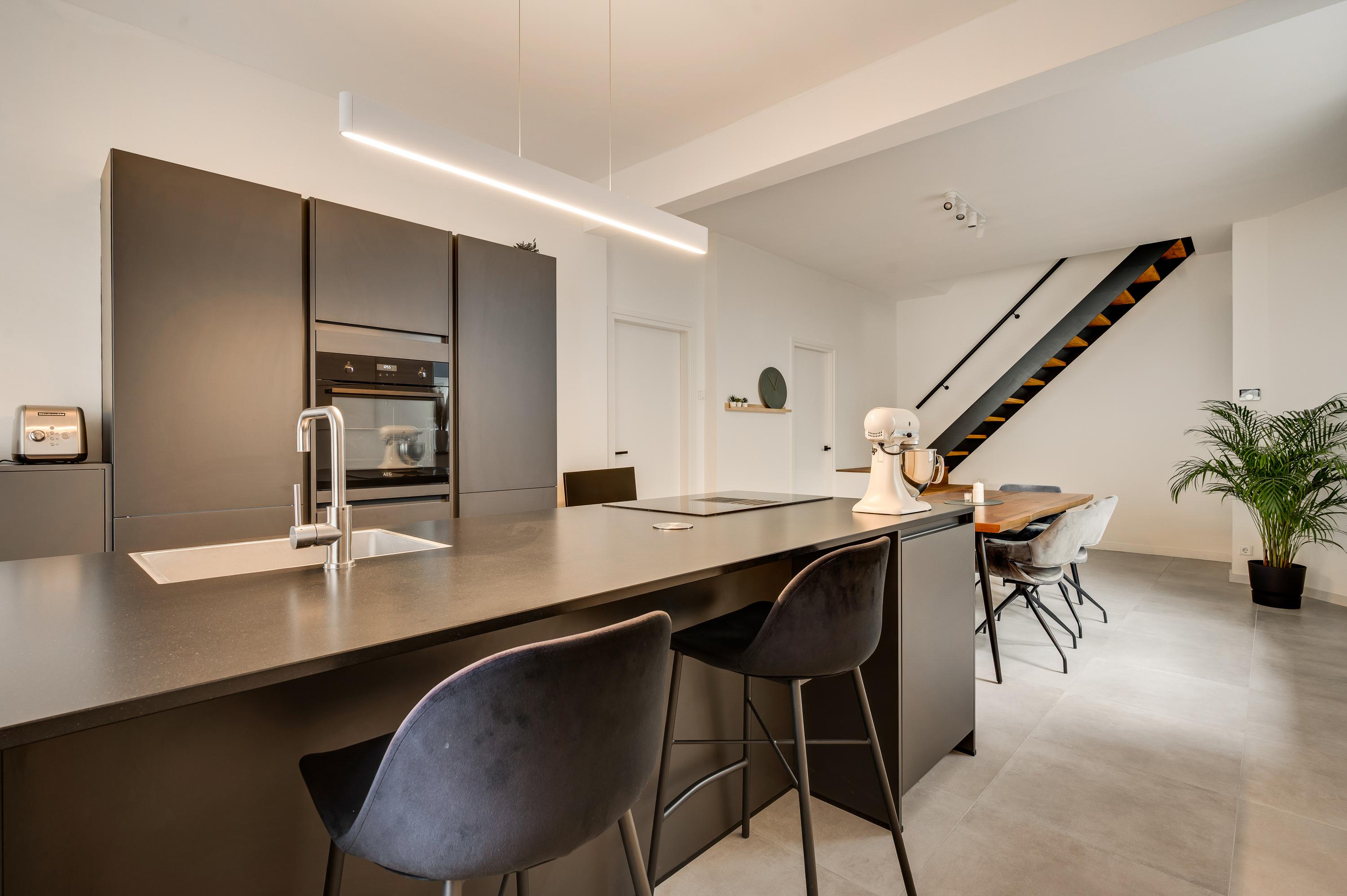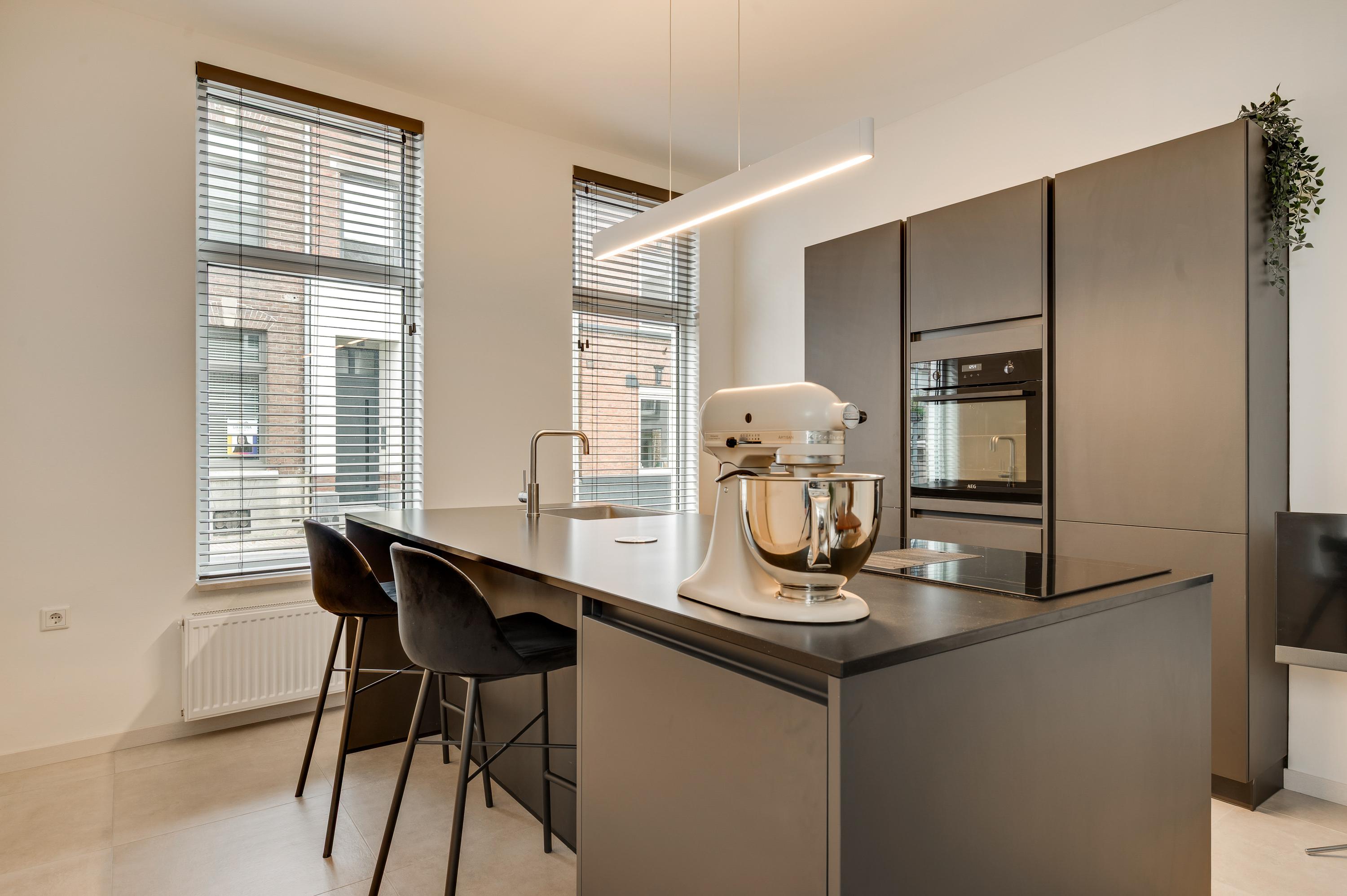Niet alleen in de hal, maar ook in de woonkeuken (circa 8,36 x 3,78) ziet u dat dit een huis van topkwaliteit is. De lichte tegelvloer is fraai, net als het stucwerk en de moderne bordestrap. Het eiland in de keuken biedt zitgelegenheid en extra bergruimte is er in de hoge kastenwand. Alle benodigde apparatuur is ingebouwd: een inductie kookplaat met afzuiging, een grote oven, vaatwasser en een koelkast. Vlak naast de keuken is de bijkeuken (circa 3,44 x 1,92) met kasten, een spoelbak en de aansluitingen voor de wasapparatuur.