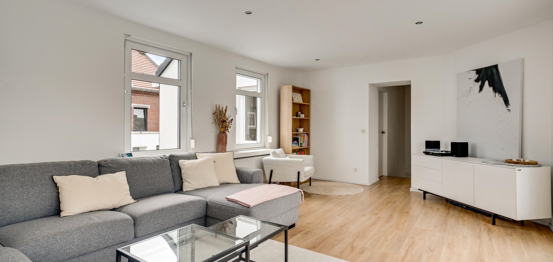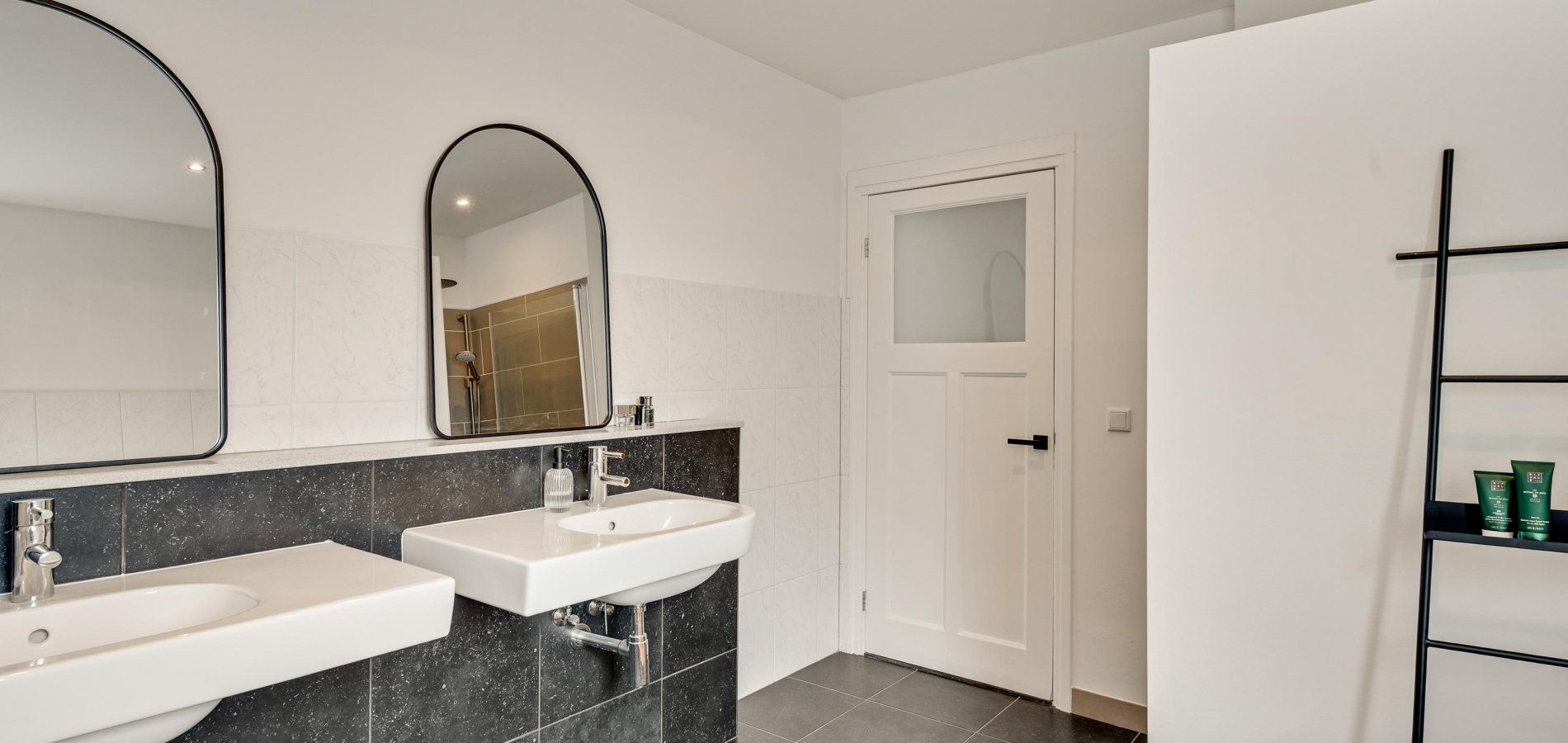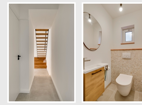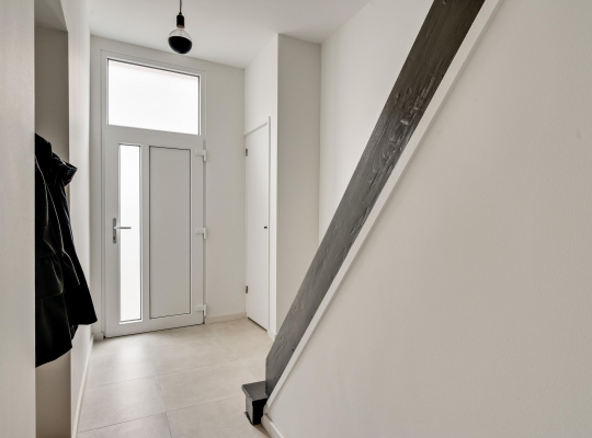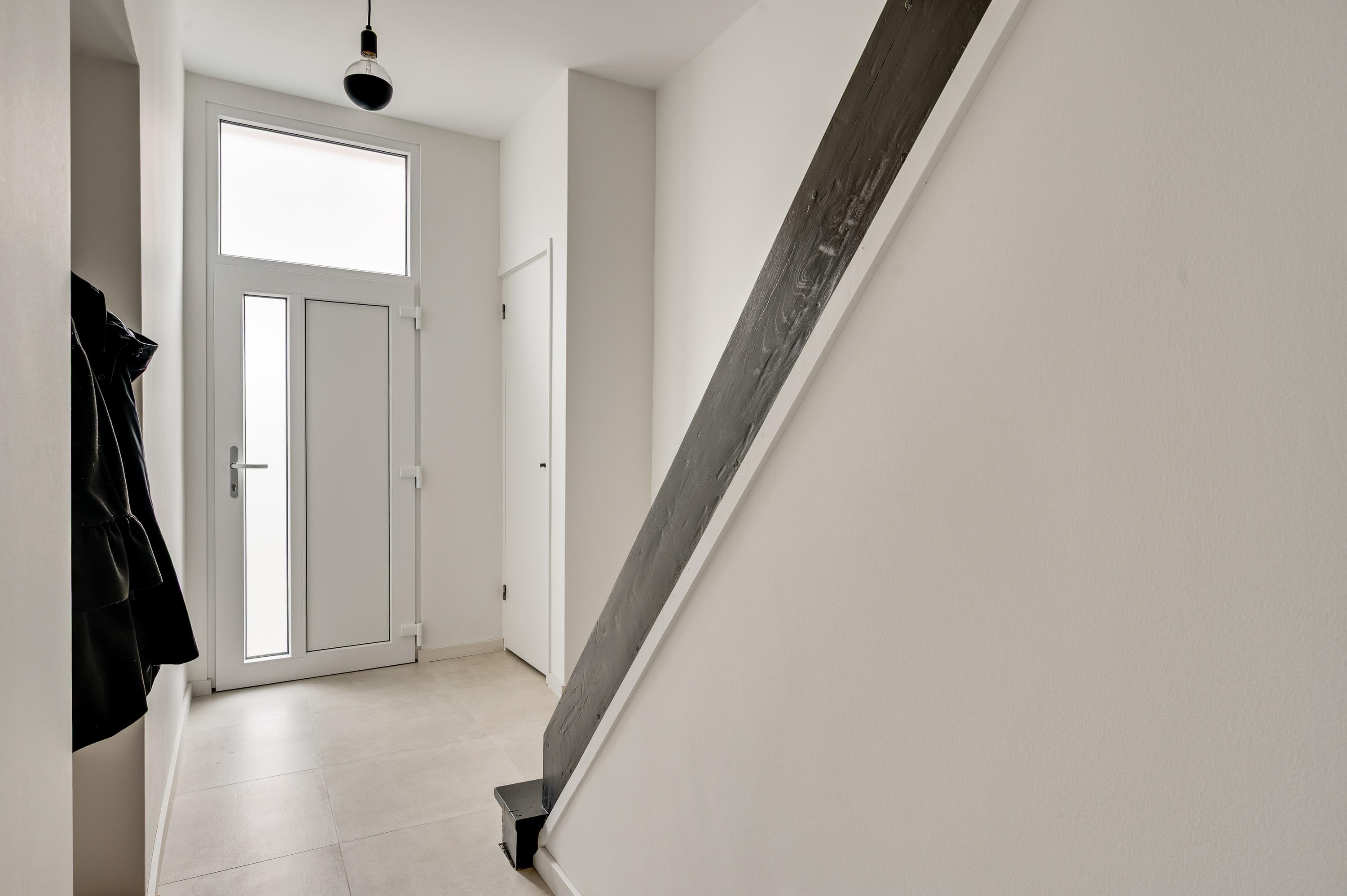 De vernieuwde voordeur geeft toegang tot de ruime hal (circa 4,92 x 1,86), waar lichte en donkere kleuren de sfeer bepalen. Het plafond is ruim 2,80 meter hoog en aan de rechterzijde, in een nis, is plek voor een kapstok.