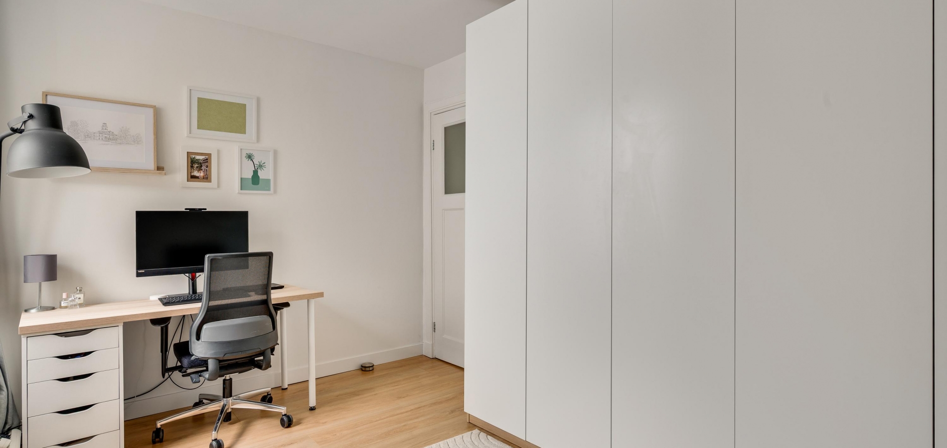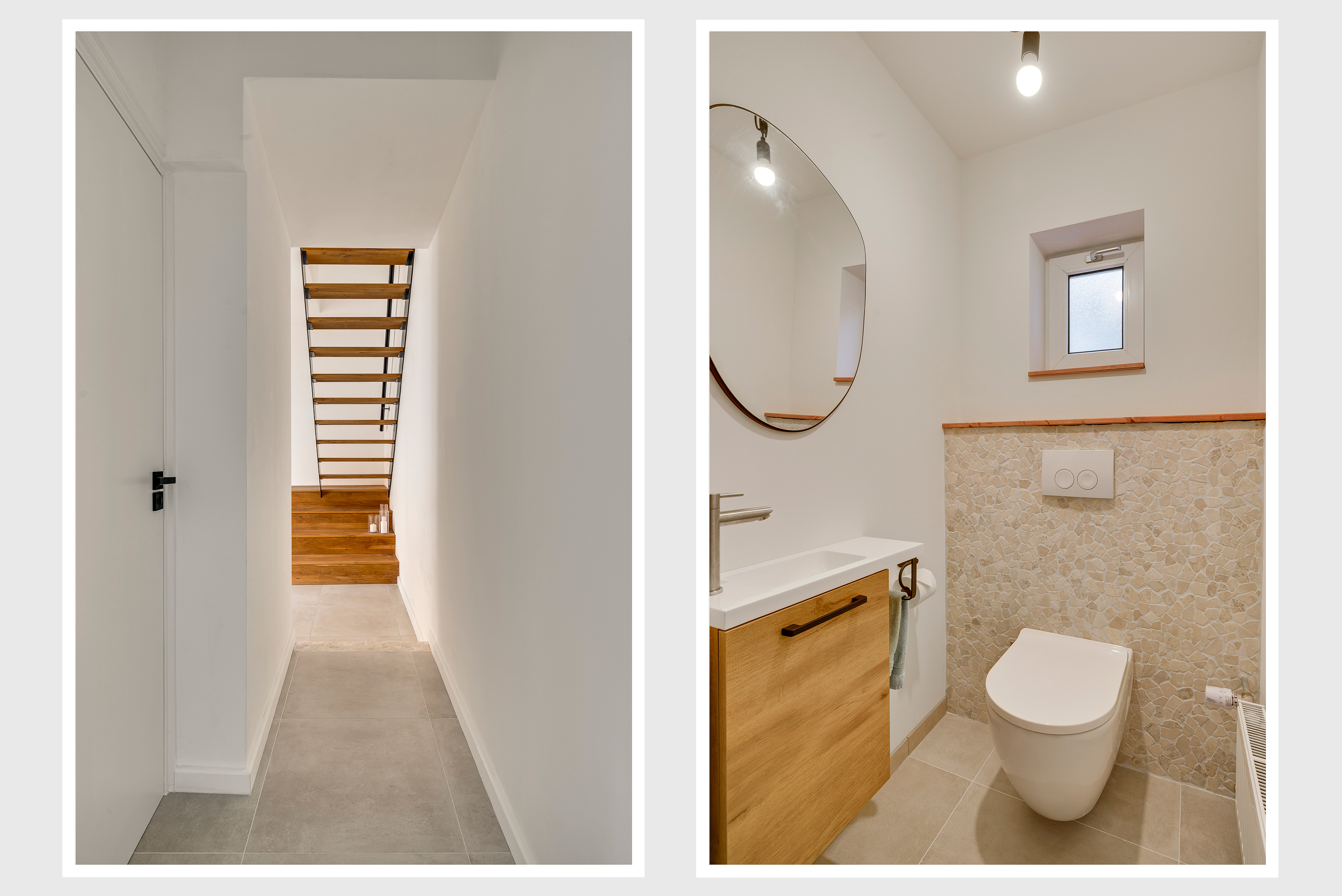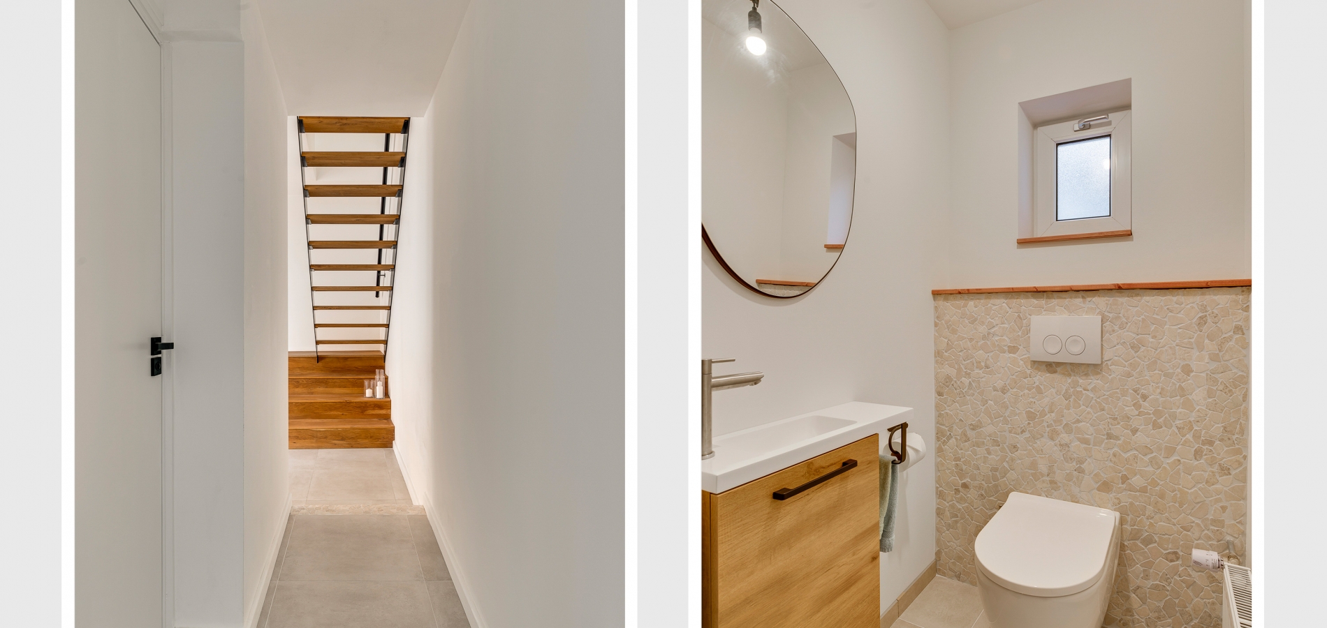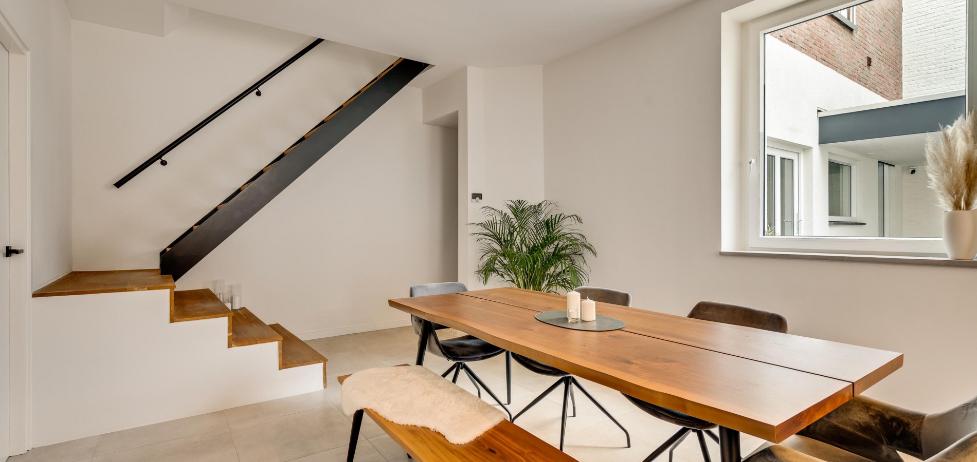 De vernieuwde voordeur geeft toegang tot de ruime hal (circa 4,92 x 1,86), waar lichte en donkere kleuren de sfeer bepalen. Het plafond is ruim 2,80 meter hoog en aan de rechterzijde, in een nis, is plek voor een kapstok.