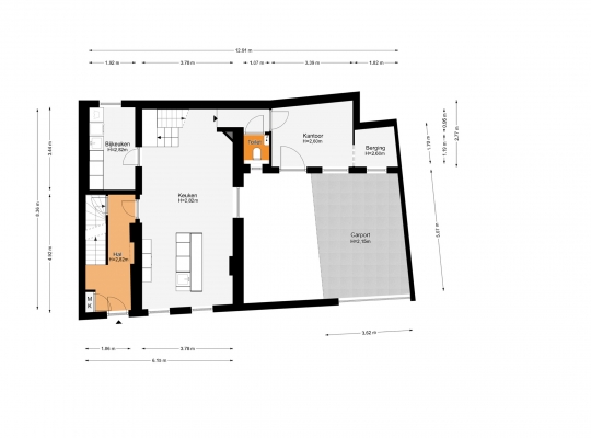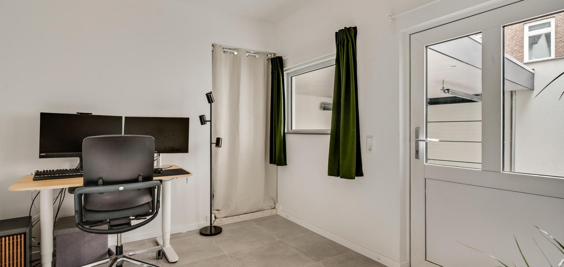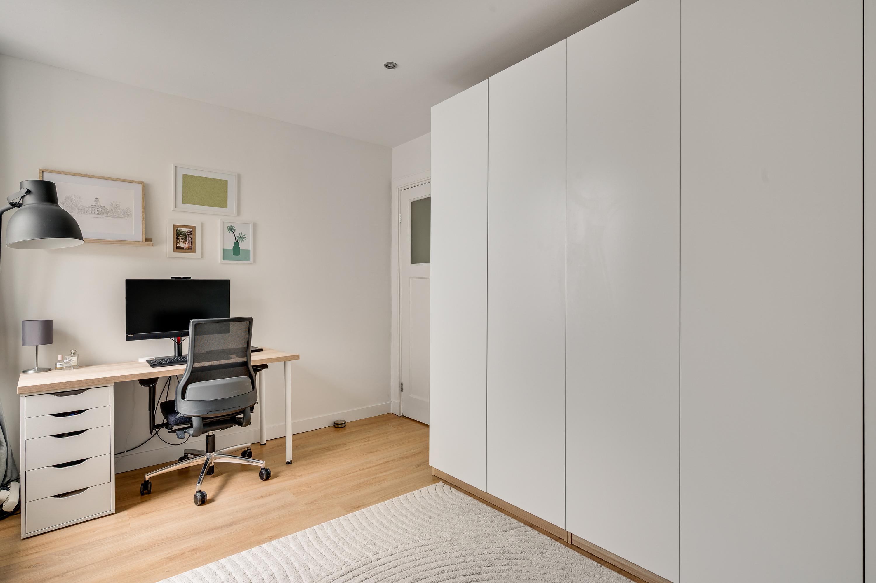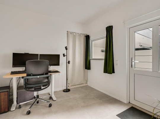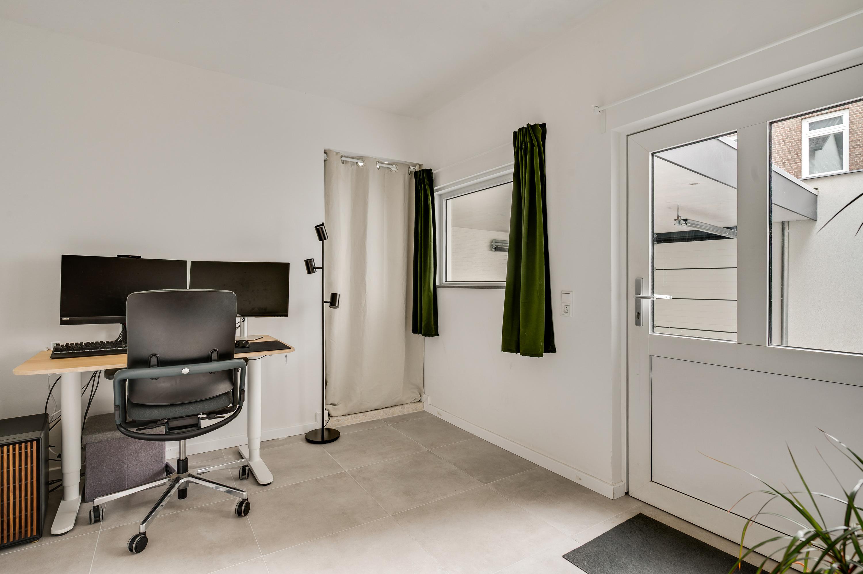 In het achterste deel van de woonkeuken is een gang, richting de fraaie toiletruimte en een werkkamer/kantoorruimte (circa 3,39 x 2,77). Naast deze ruimte is een berging en, heel handig, er is een deur naar de binnenplaats en carport.