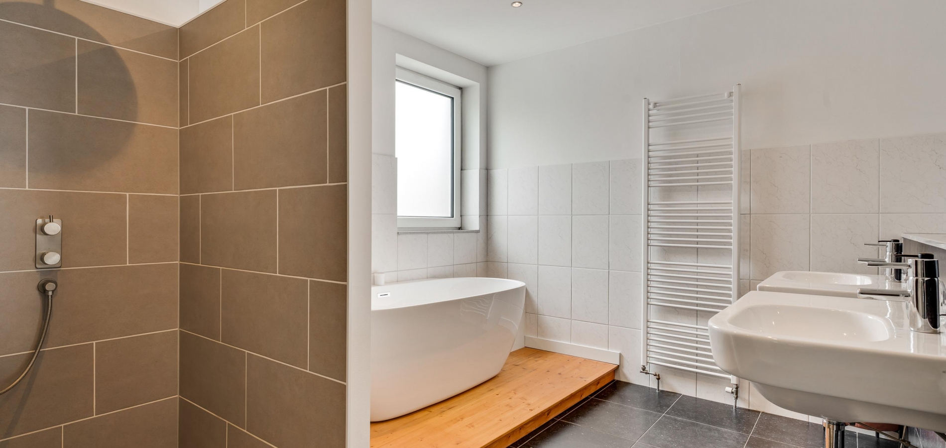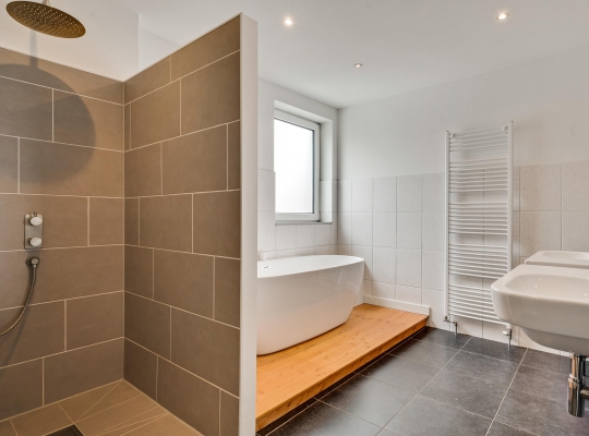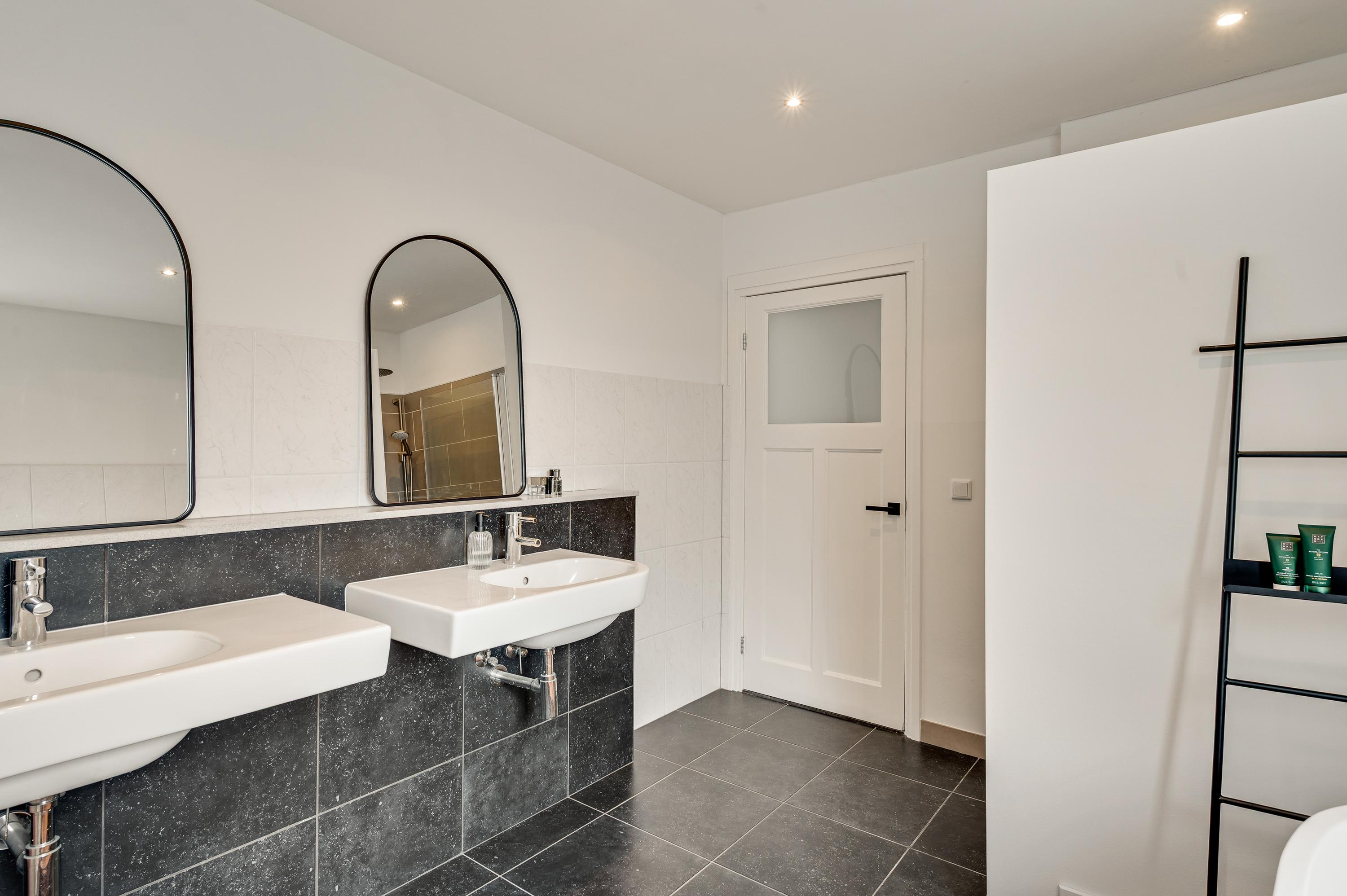 Gaat u via de trap in de hal naar boven, dan bereikt u een L-vormige overloop. Vanaf hier is er toegang tot twee slaapkamers, de badkamer en een separate toiletruimte. De moderne badkamer (circa 3,47 x 2,97) is ingedeeld met een fraai ligbad, een inloopdouche en twee wastafels.