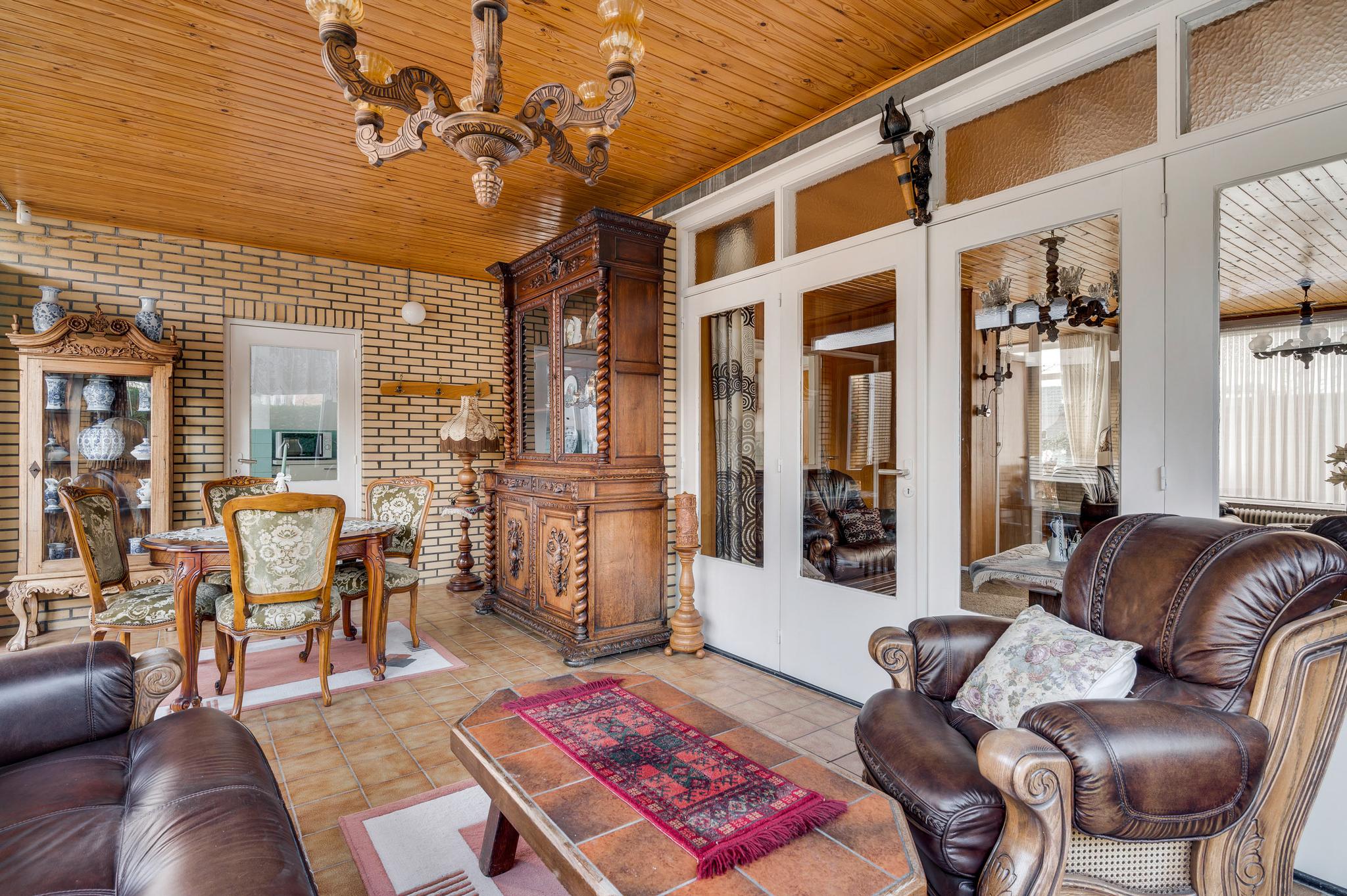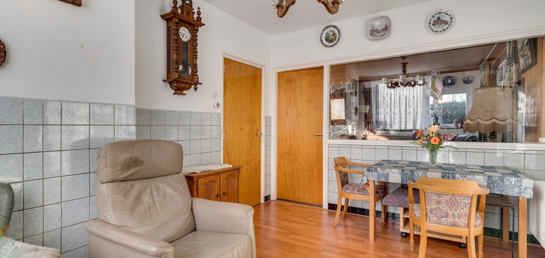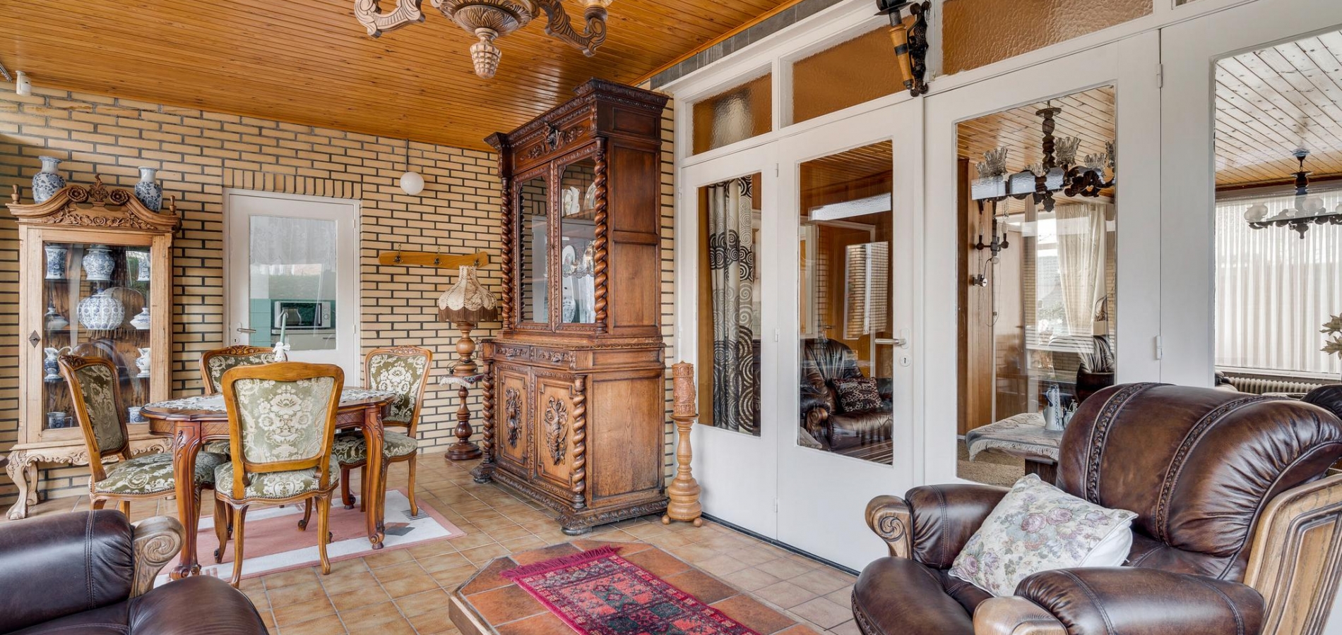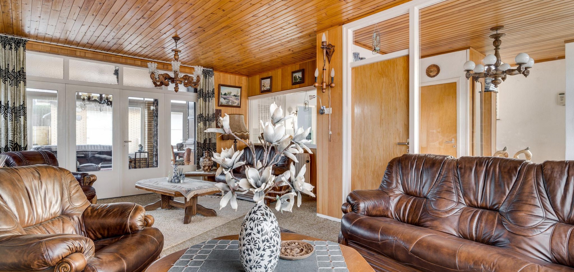 Aan de achterzijde is de woonkamer uitgebouwd met een serre, waardoor de gehele leefruimte een stuk groter is geworden. De L-vormige woonkamer met ramen aan vier zijden heeft een oppervlakte van circa 29,0 m2 en de serre met openslaande tuindeuren is circa 20,3 m2.
