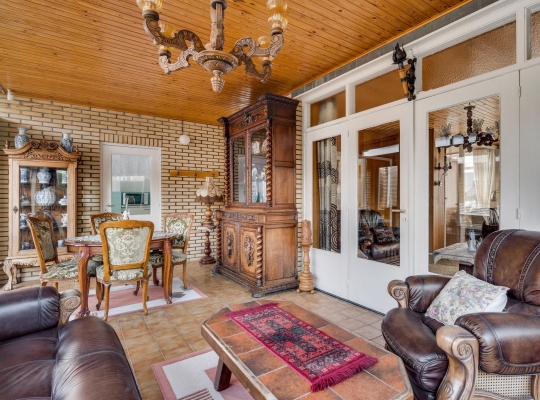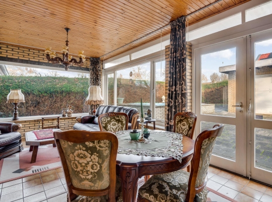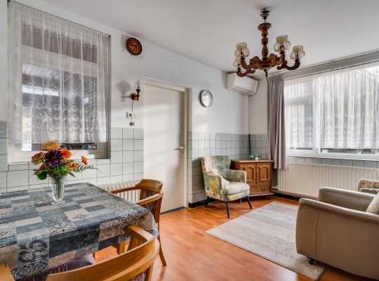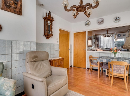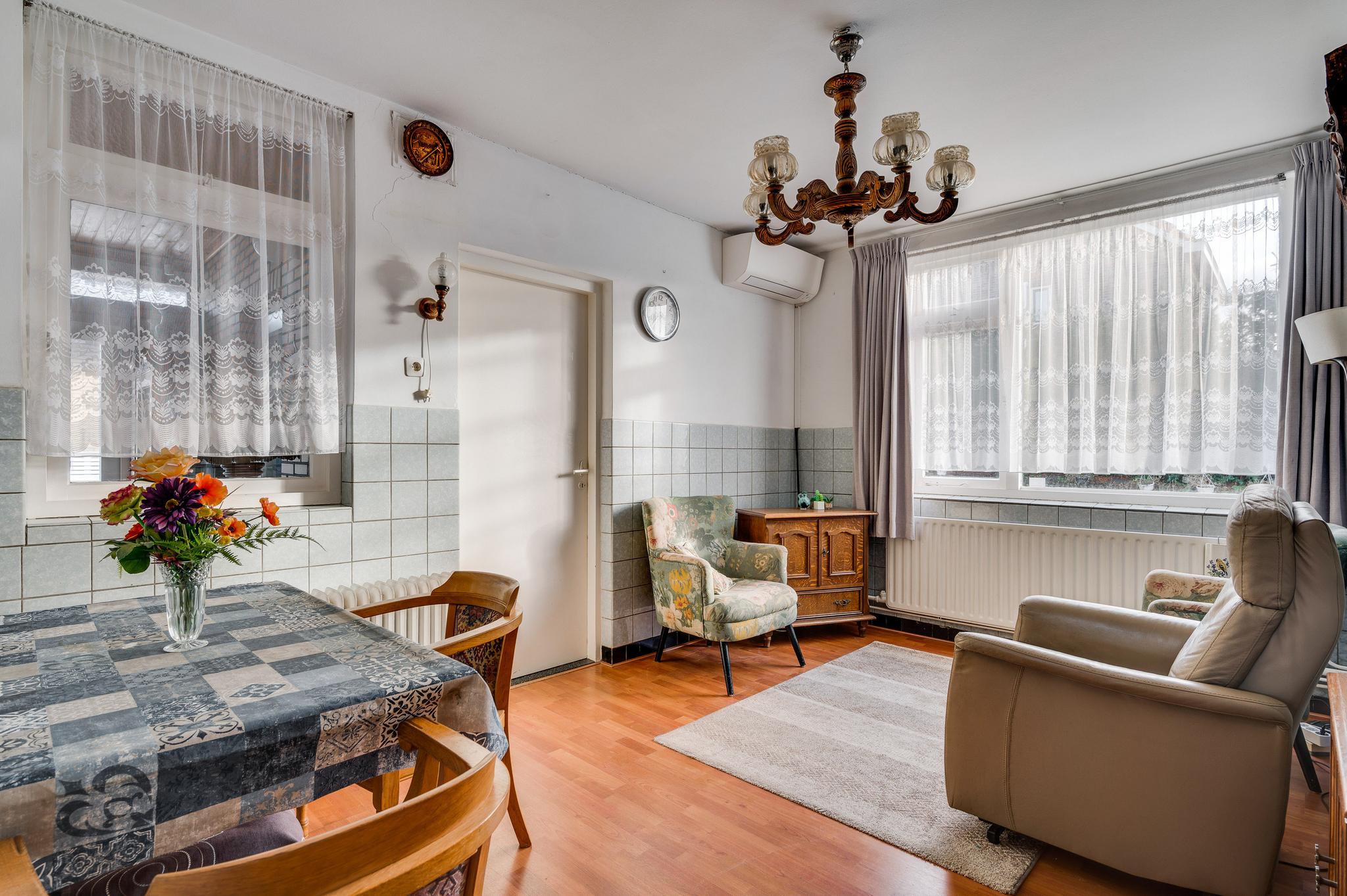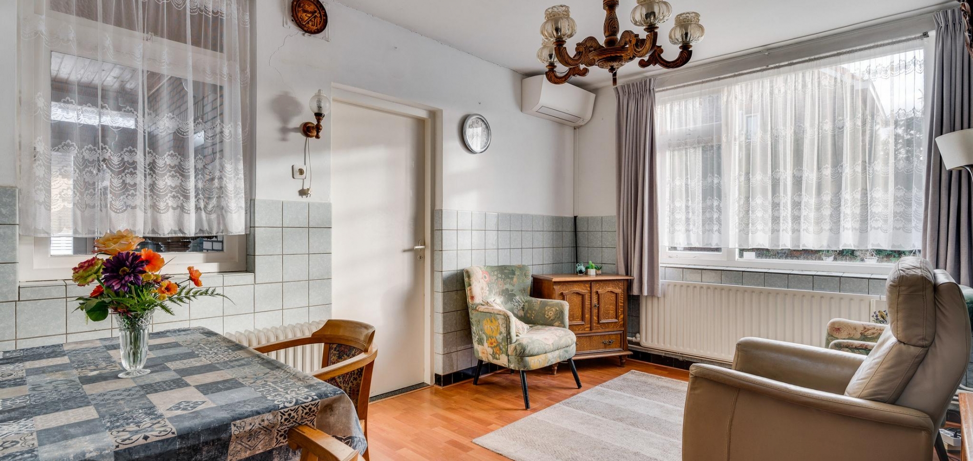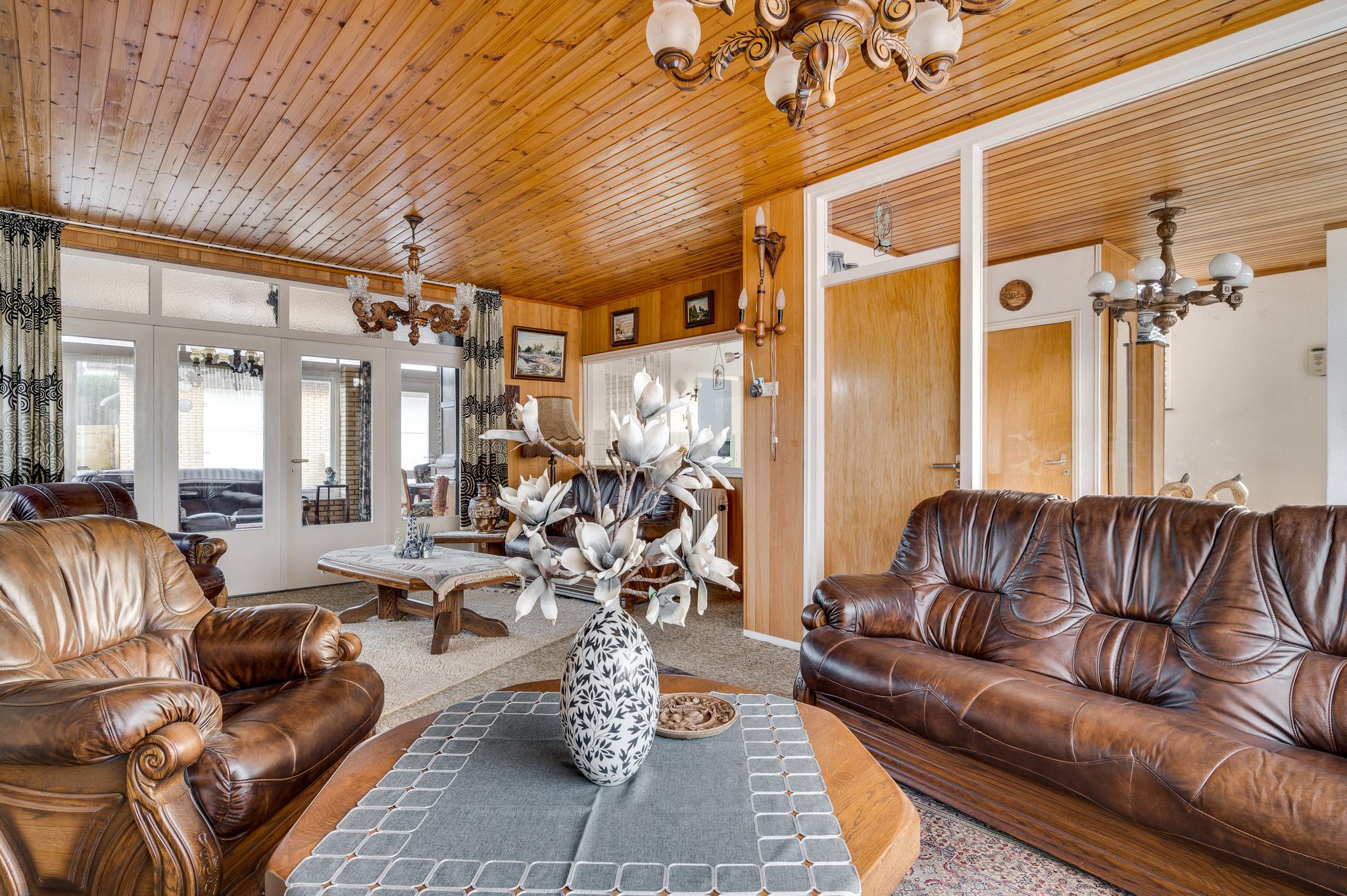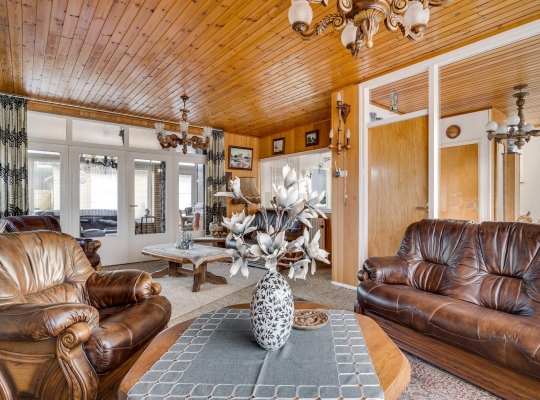 Aan de achterzijde is de woonkamer uitgebouwd met een serre, waardoor de gehele leefruimte een stuk groter is geworden. De L-vormige woonkamer met ramen aan vier zijden heeft een oppervlakte van circa 29,0 m2 en de serre met openslaande tuindeuren is circa 20,3 m2.