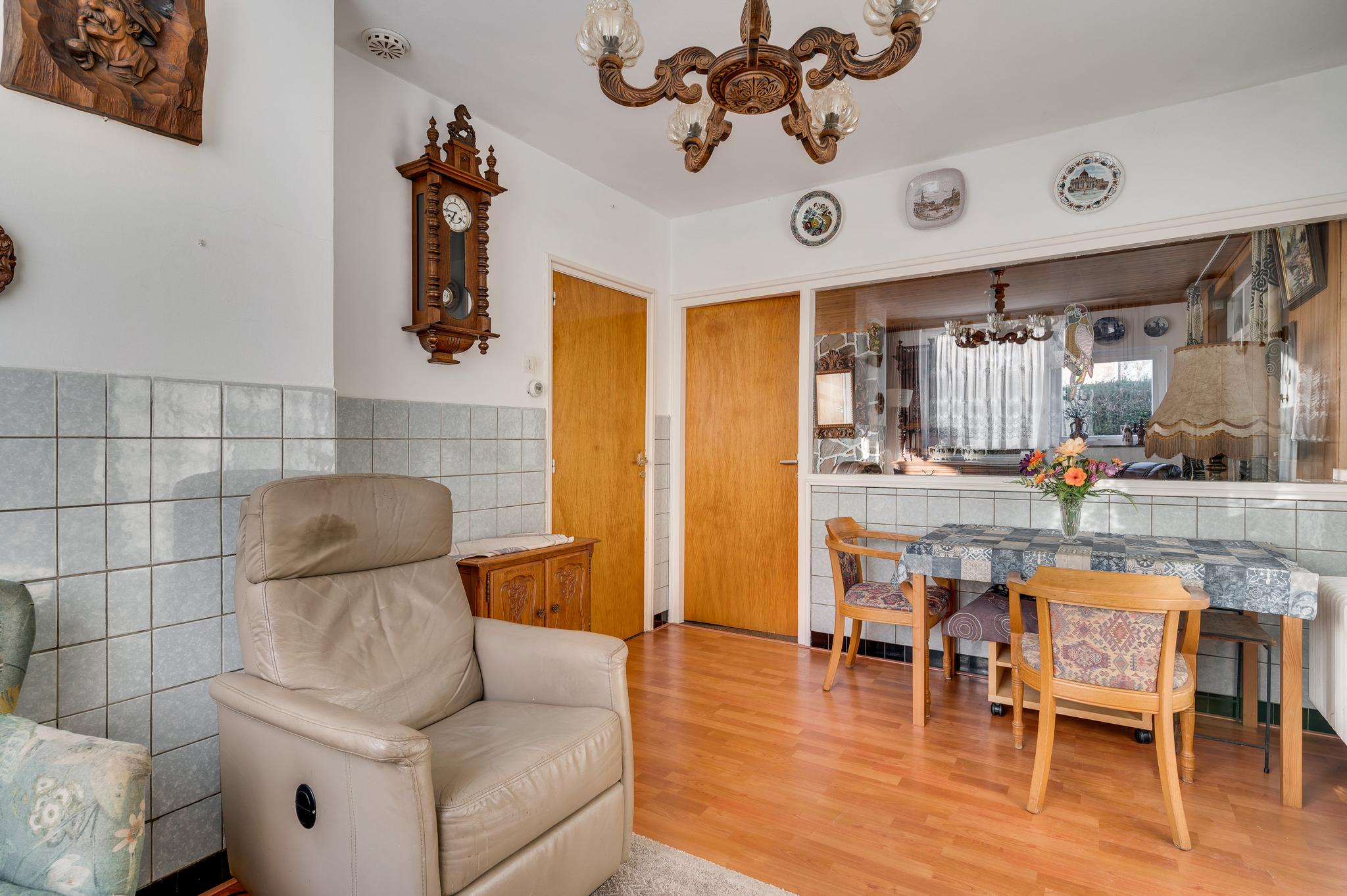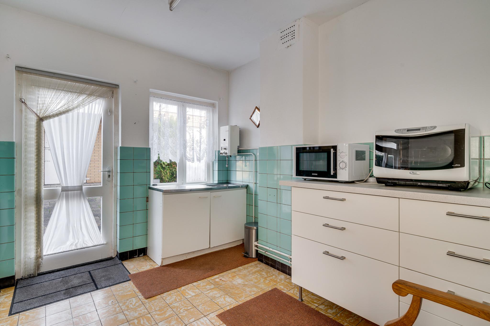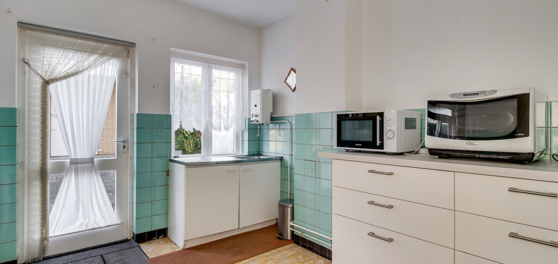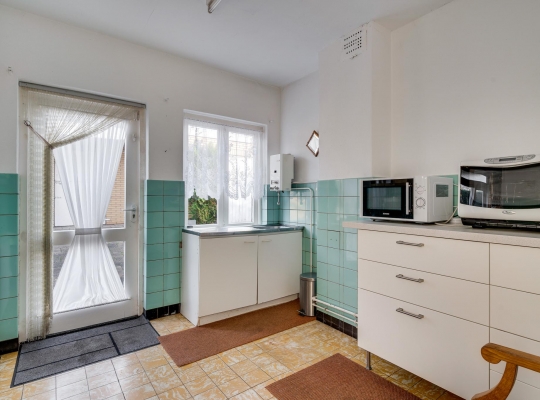 Vanuit de hal en woonkamer is de oorspronkelijke keuken (4.19 x 3,21) te bereiken, ingedeeld met een zit- en een eethoek. In de bijkeuken (3,22 x 2,67) staat een eenvoudige keukenopstelling met een spoelbak en geiser (eigendom).
