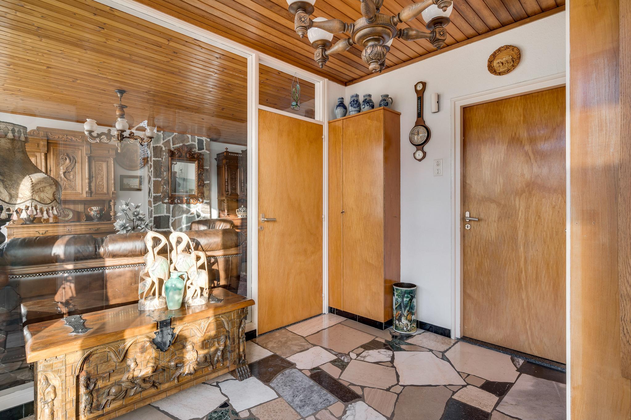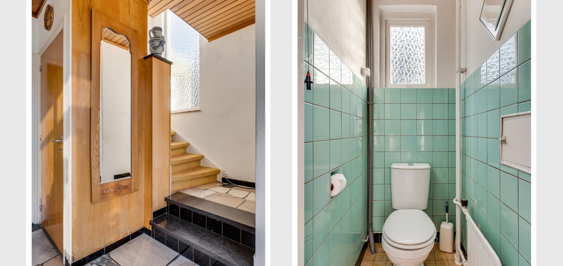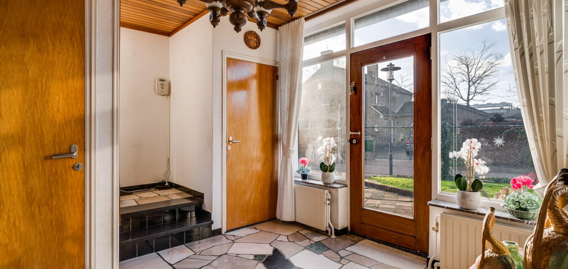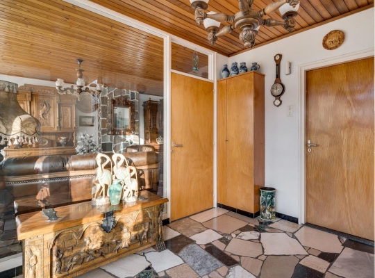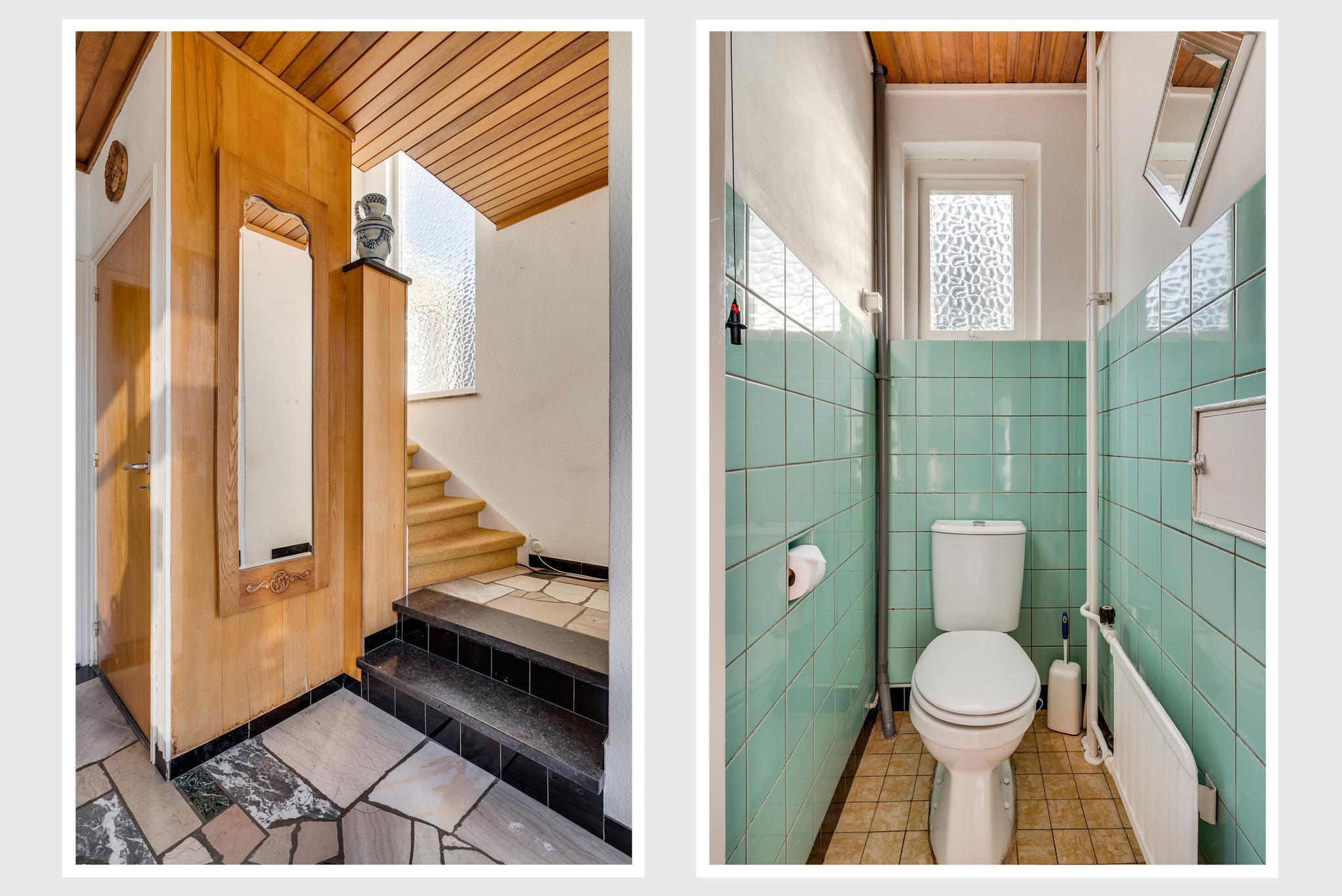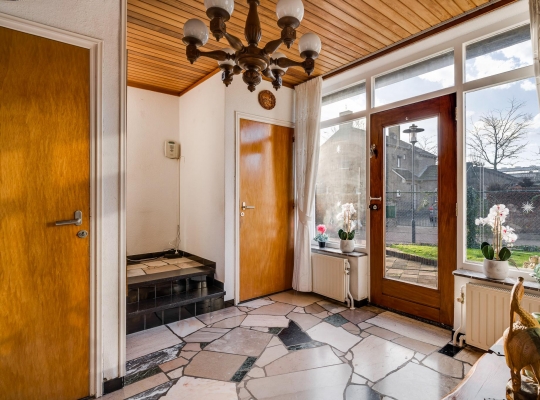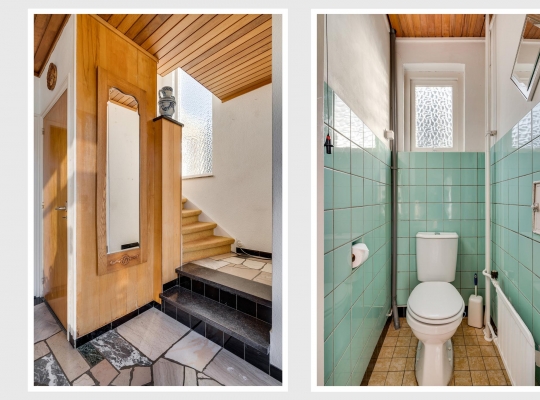 De lichte hal met bordestrap is een grote ruimte, waar een flagstone vloer met natuursteen ligt. Rechts in de hal is de toiletruimte en aan de linkerzijde, naast de woonkamerdeur, bevindt zich de meterkast.