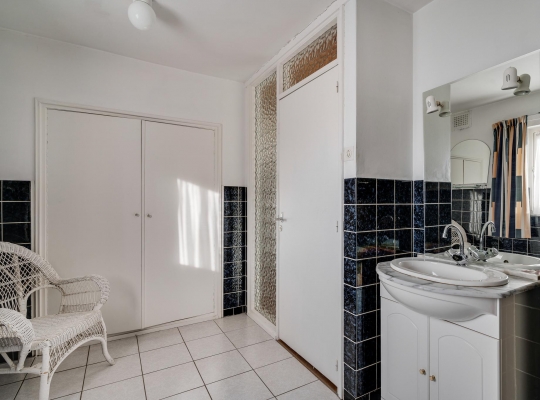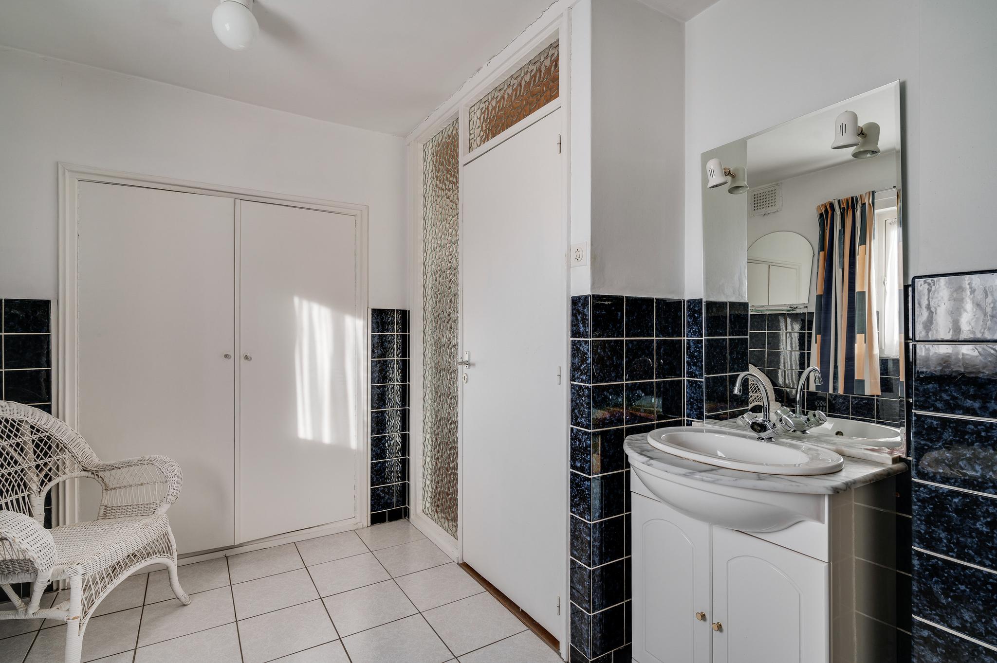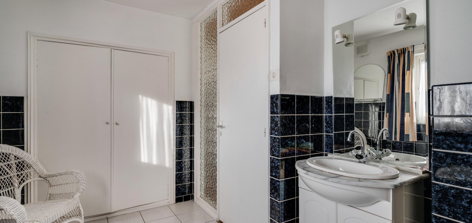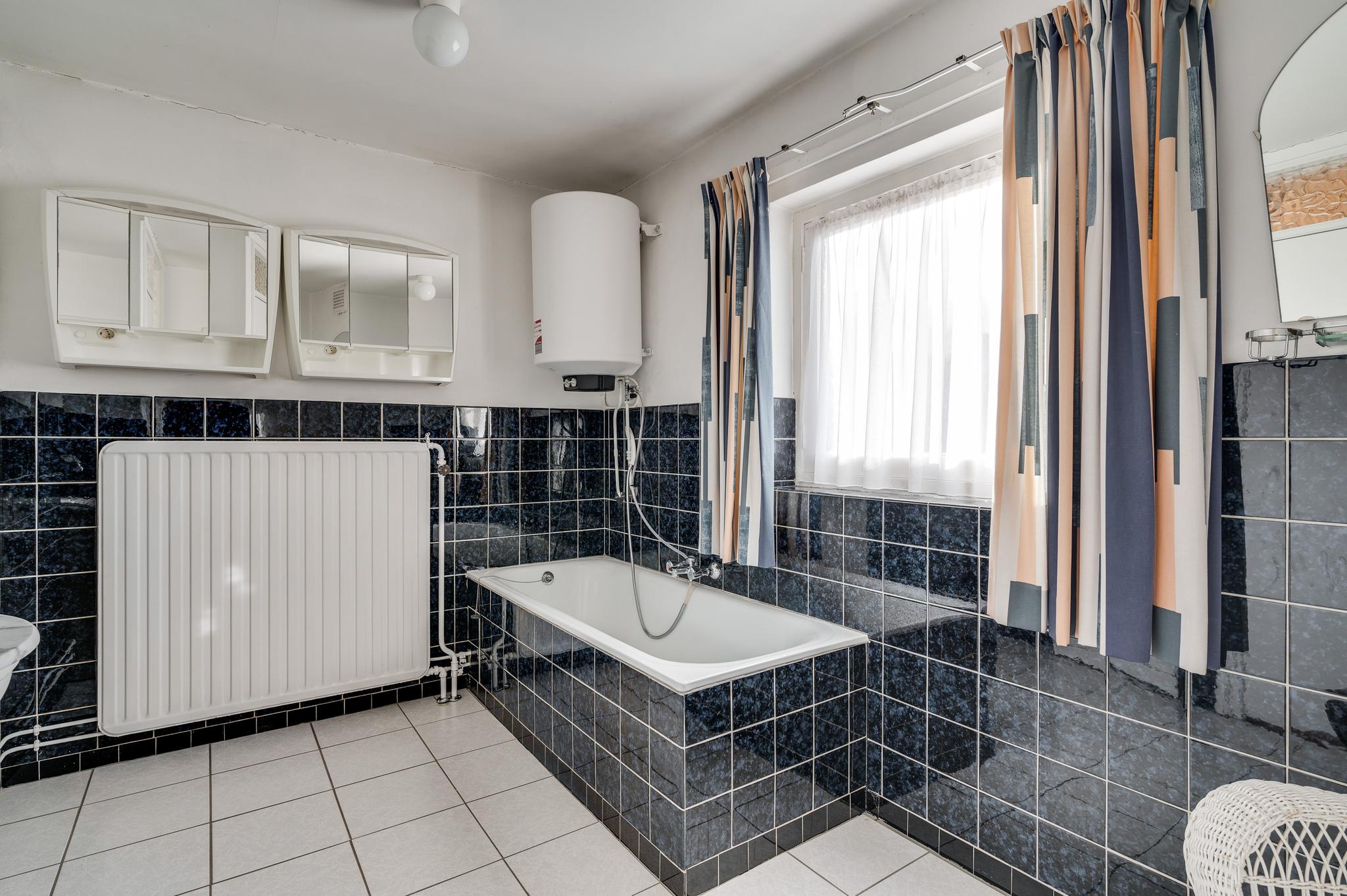 De ruime, lichte badkamer (circa 7,5 m2) is ingedeeld met een ligbad, wastafelmeubel en twee inbouwkasten. Boven het ligbad hangt een boiler (huur, Volta).