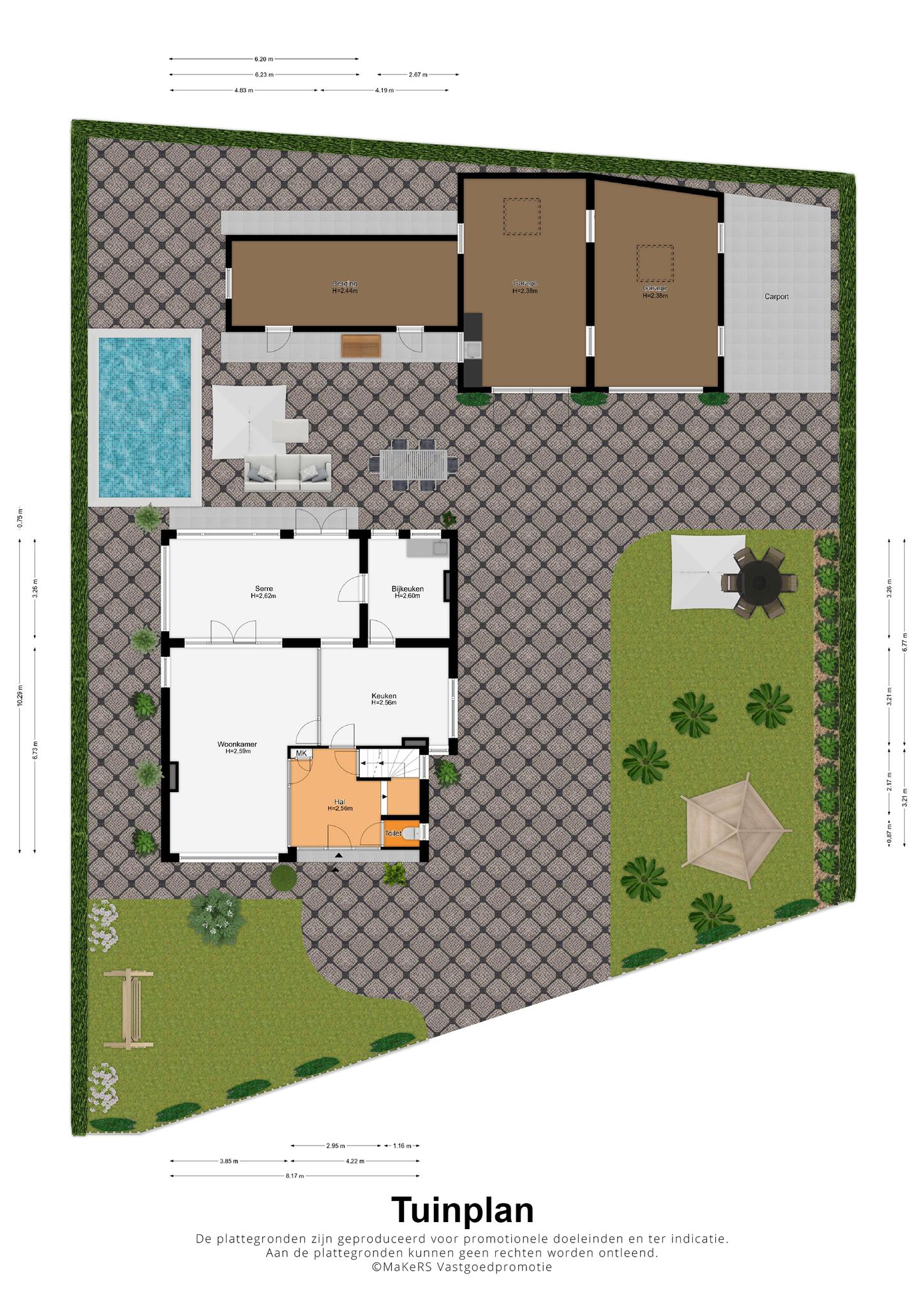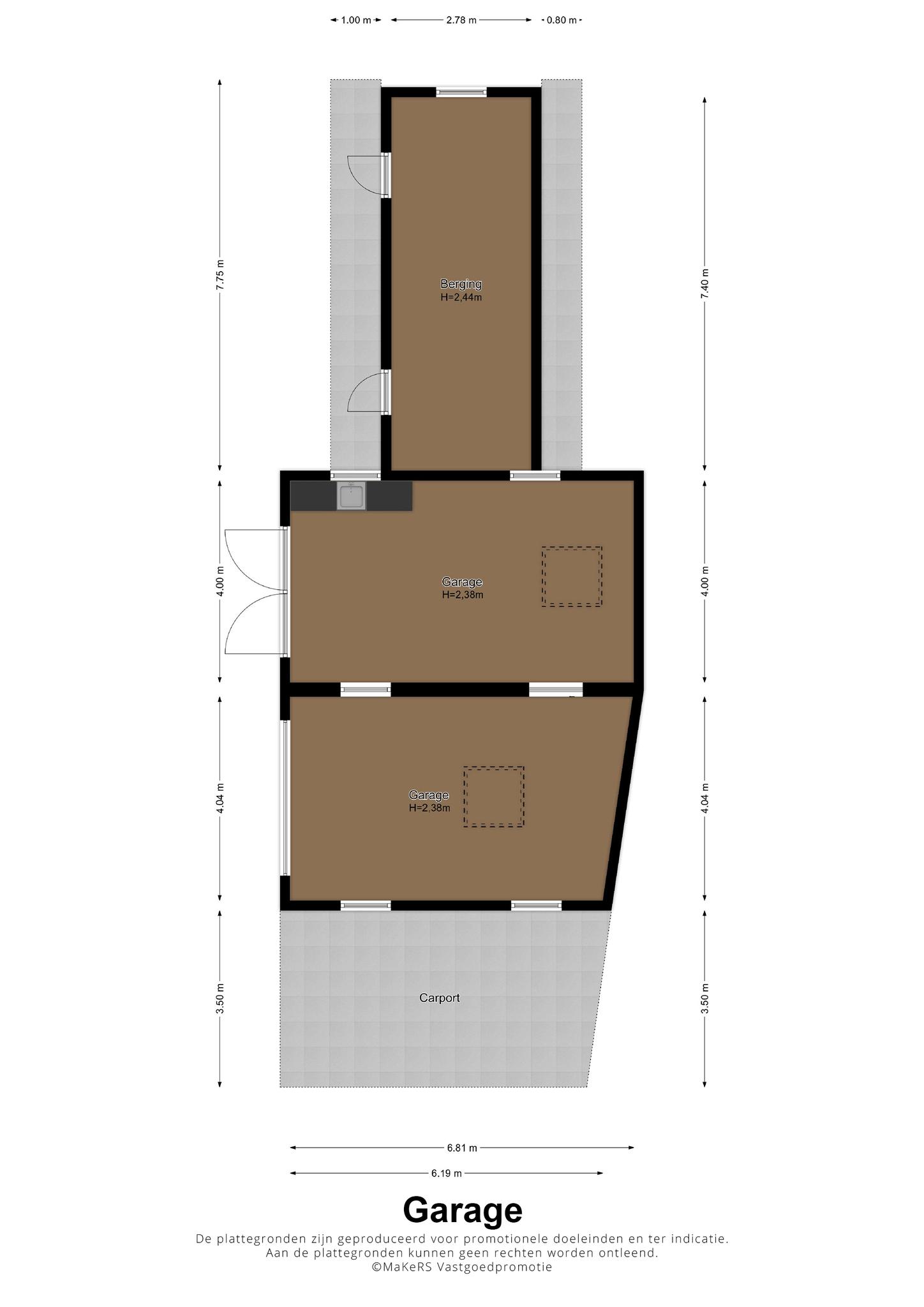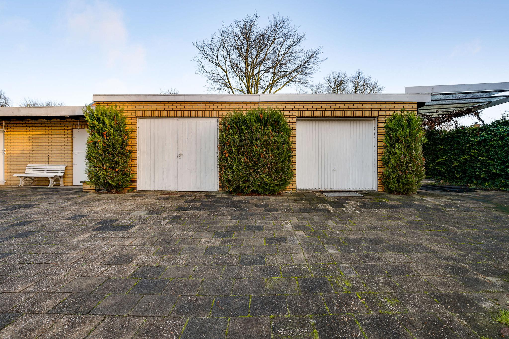 Op het perceel staan maar liefst vier bijgebouwen; een berging/hobbyruimte, twee garages en een carport. De carport (6,19 x 3,50) is, net als de garages (resp. 6,81 x 4,00 en 6,19 x 4,04), goed bereikbaar vanaf de oprit. De rechter garage heeft een kantelpoort en de linker garage openslaande deuren. De berging/hobbyruimte (7,40 x 2,78) met staldeuren aan de voorzijde is voor diverse doeleinden geschikt.