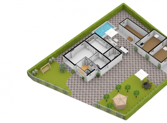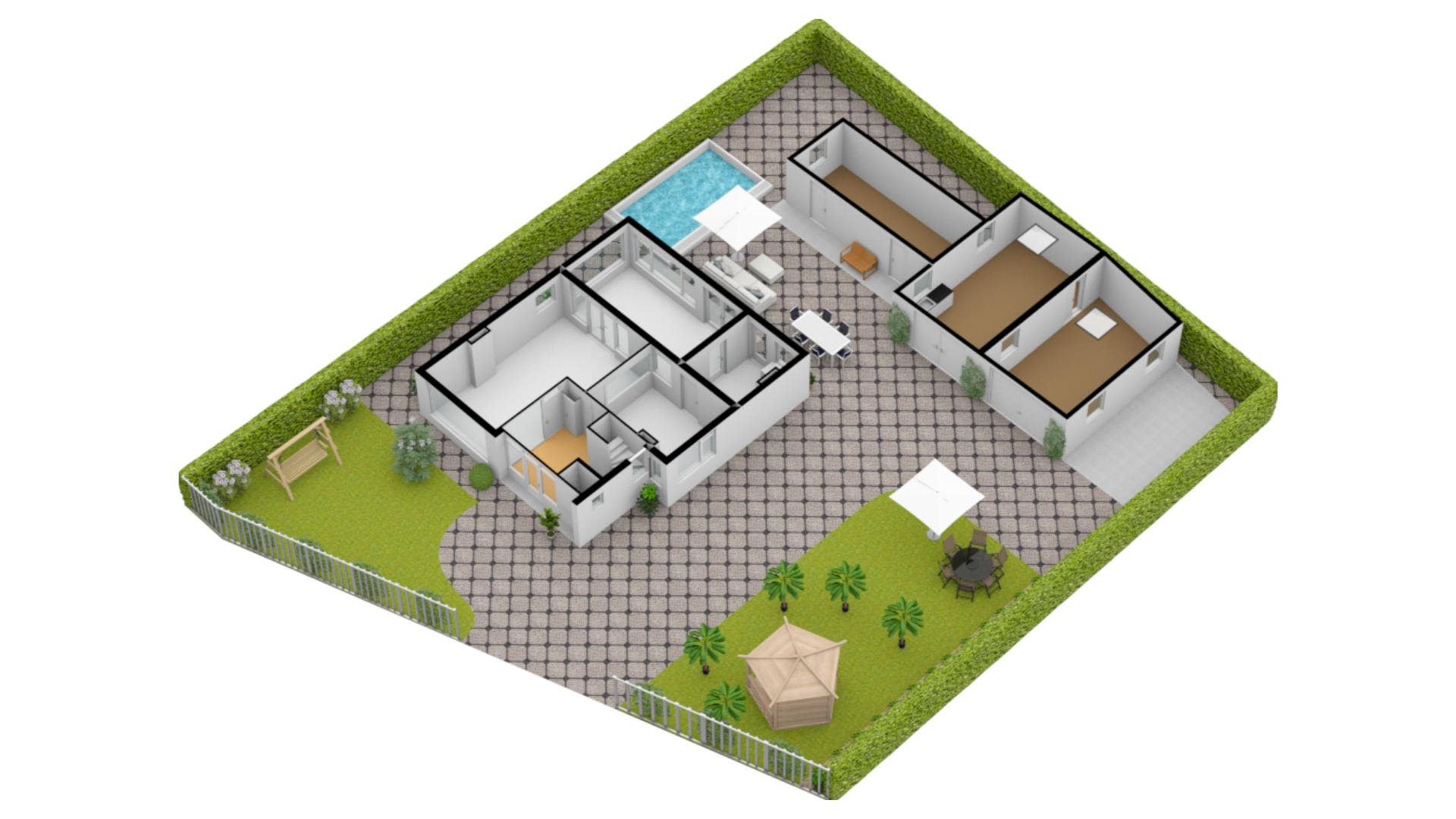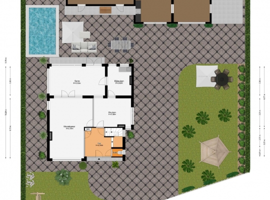 De tuin met hoog hekwerk en schuifpoort is ingedeeld met gras, bestrating en beplanting. Aan de achterzijde bevindt zich een groot, eenvoudig zwembad en er is genoeg ruimte om in de zon te zitten.
