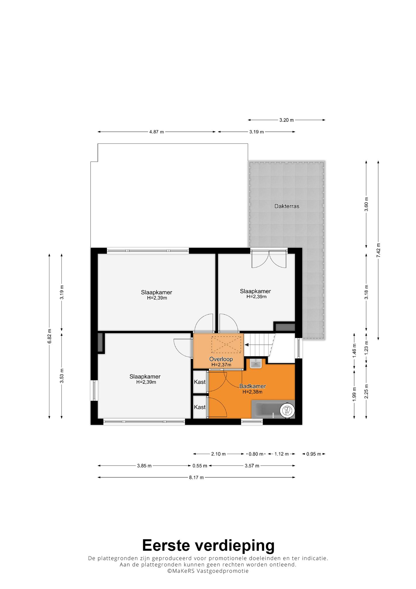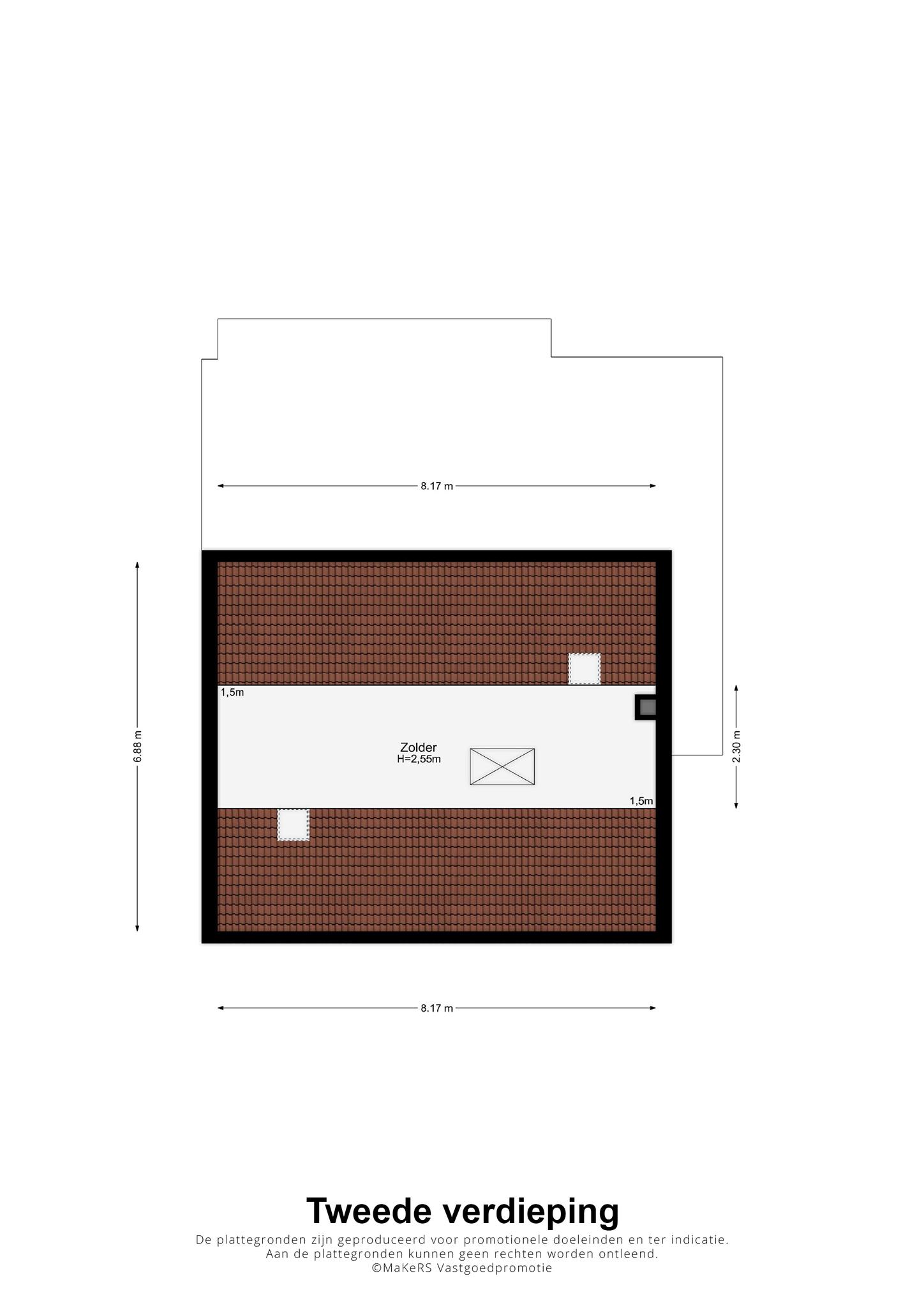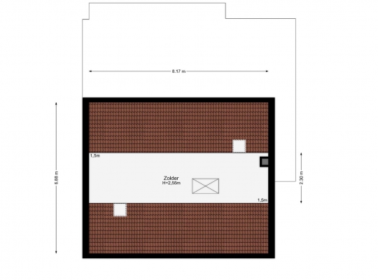 Een luik met vlizotrap geeft toegang tot de bergzolder met een vloeroppervlakte van circa 8,17 x 6,88 meter. De nokhoogte van 2,25 meter maakt het mogelijk om extra (slaap)kamers te realiseren.