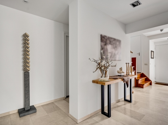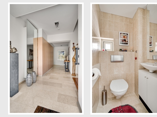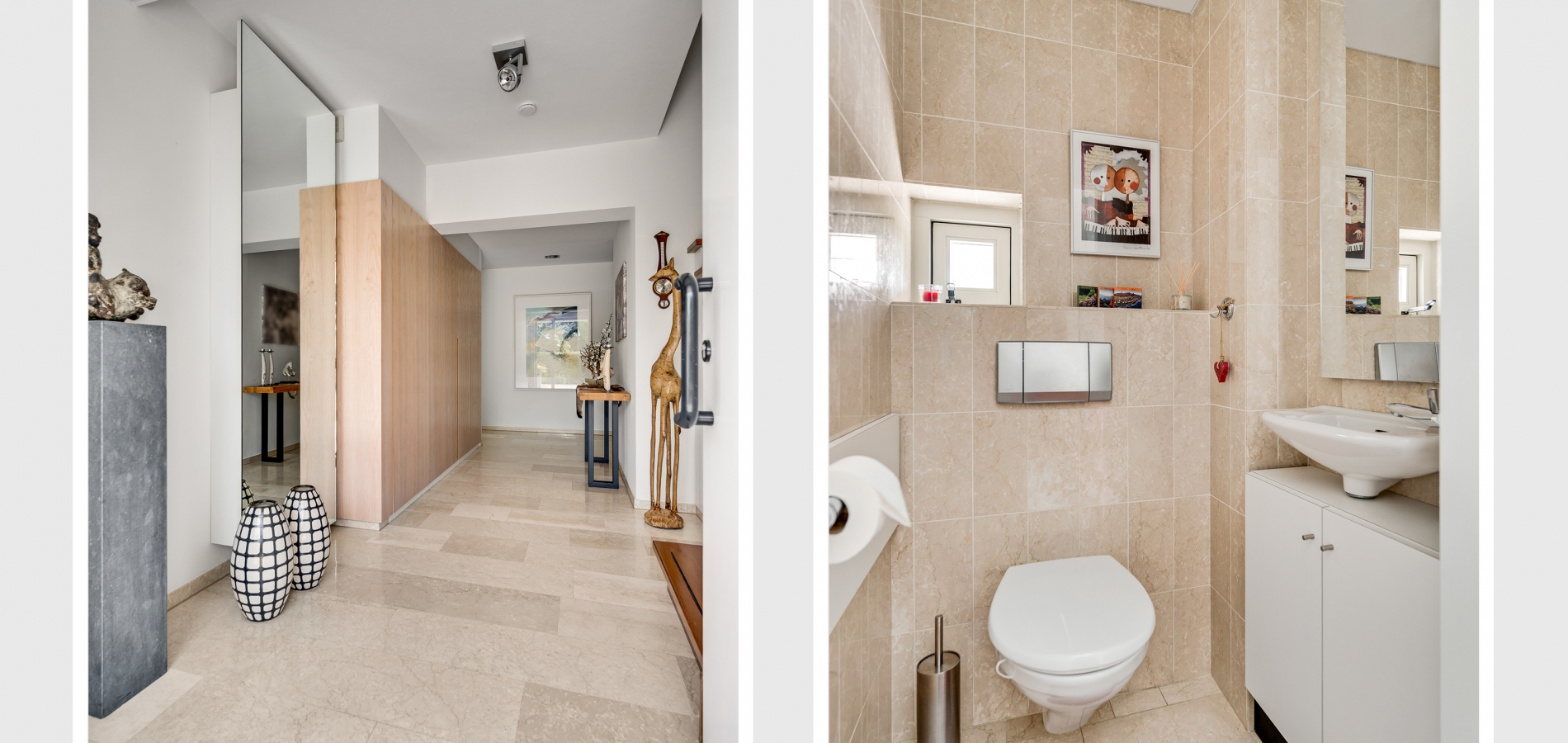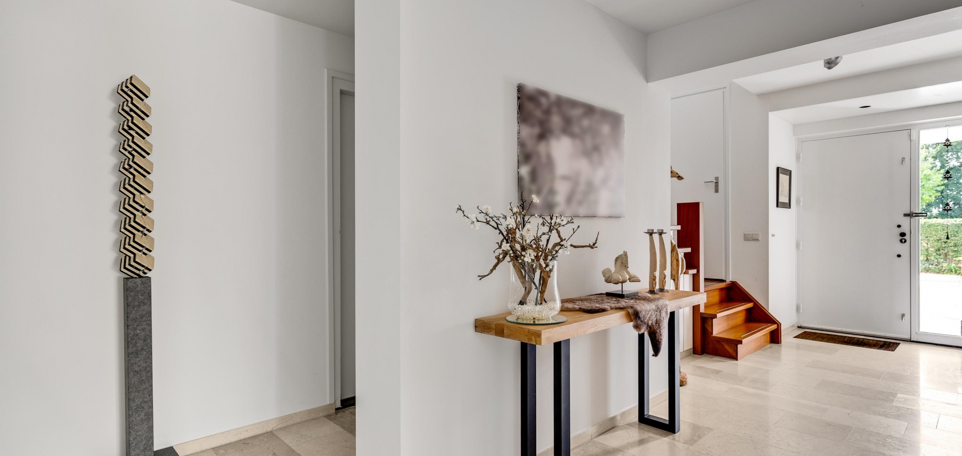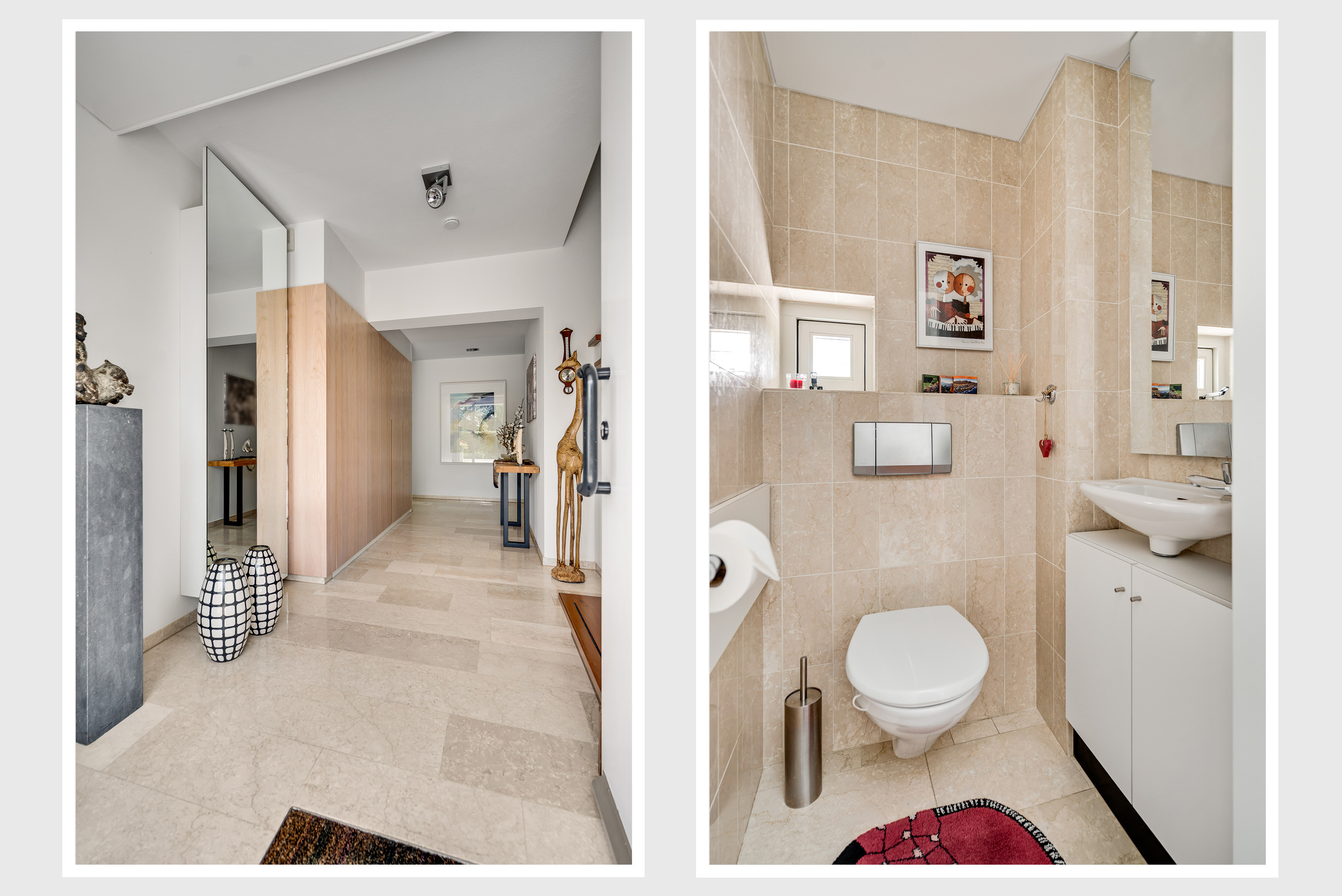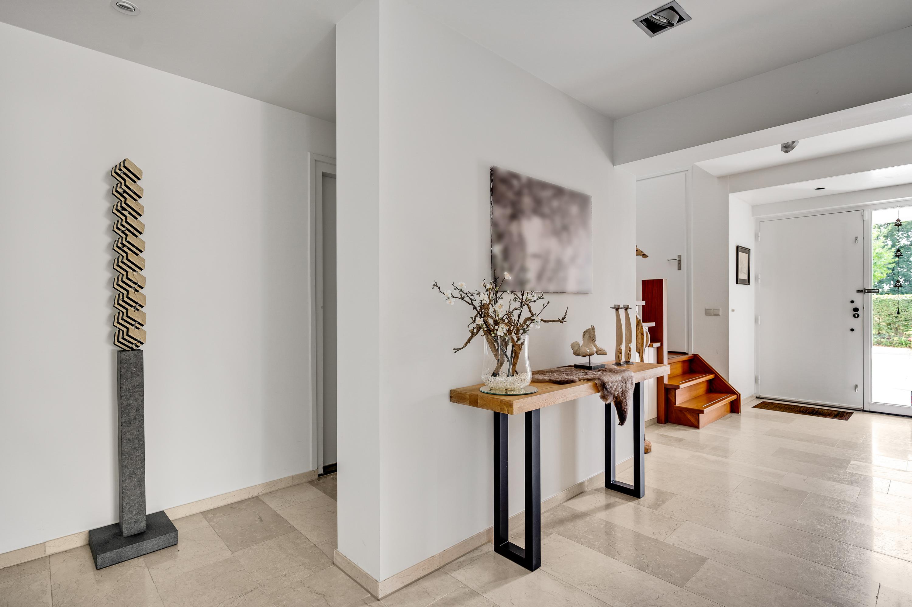 Bewonder de prachtige architectuur van deze exclusieve villa, en vervolgens de fraaie voortuin met lage bomen. Vanaf de oprit loopt u naar de overdekte entree, die toegang geeft tot de royale ontvangsthal. Hier ziet u, aan de rechterzijde, de hardhouten bordestrap en het gastentoilet. De meterkast vormt een geheel met de maatwerk tweedeurs garderobekast, waardoor de hal heel ruimtelijk oogt. De fraaie, lichte tegelvloer met vloerverwarming ligt op bijna de hele begane grond.