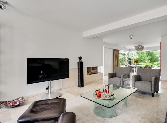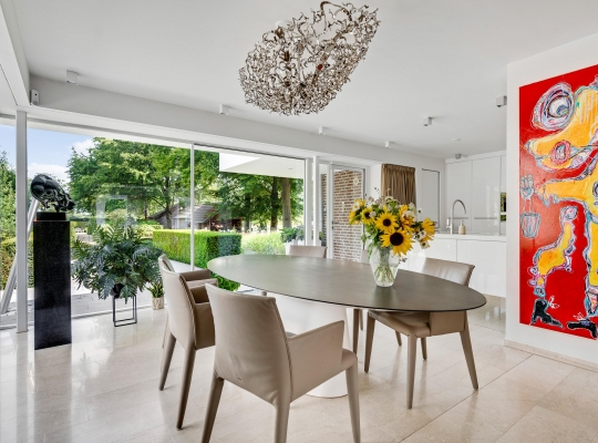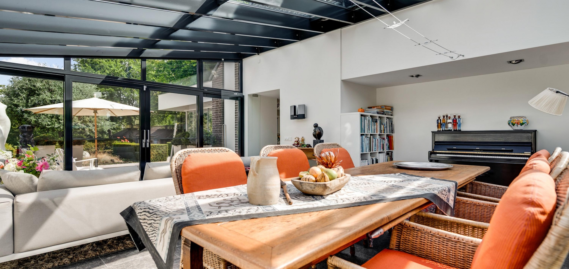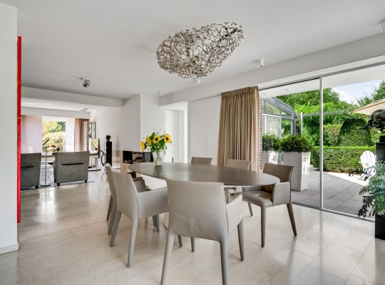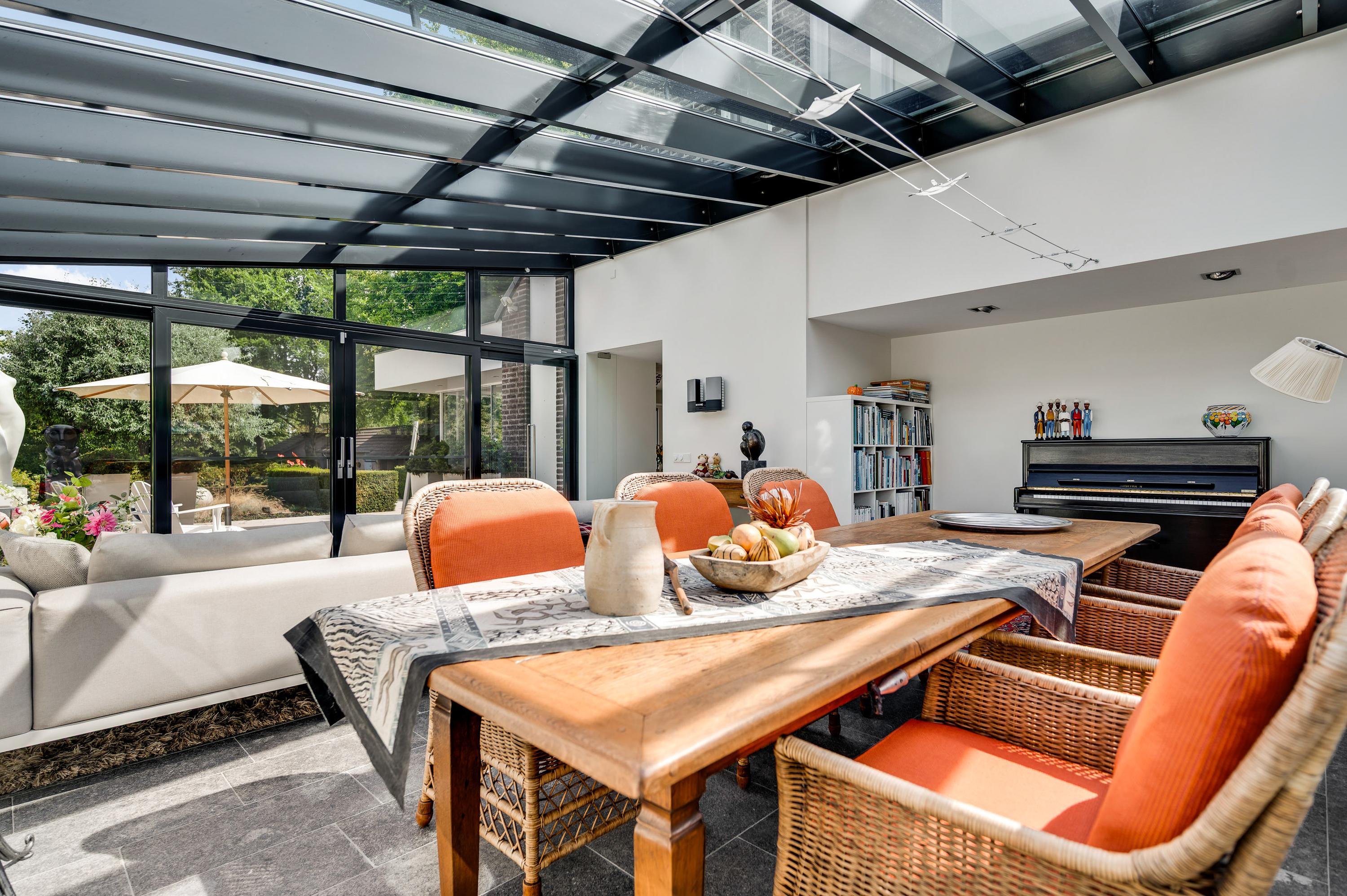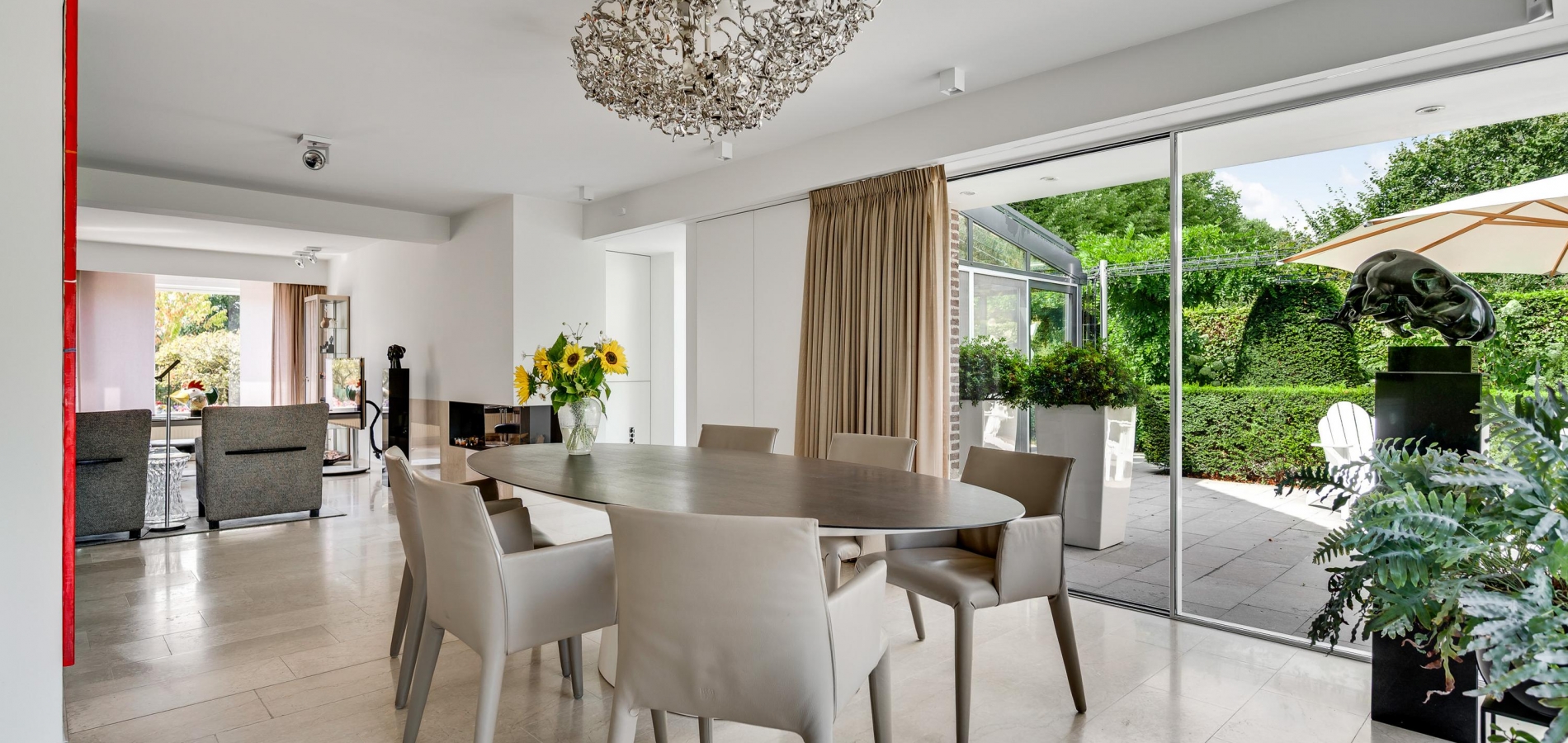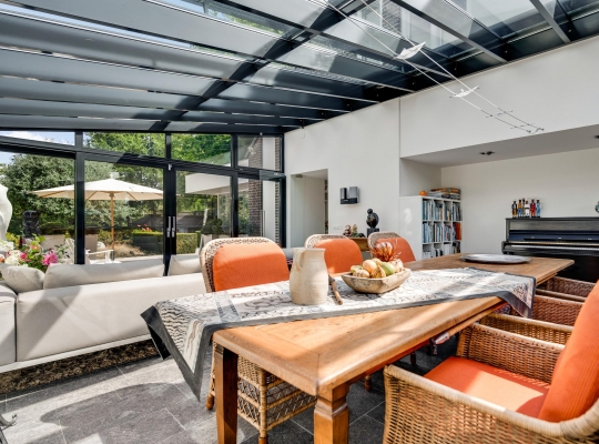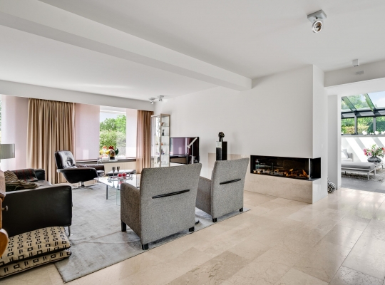 Aan het einde van de hal loopt u linksaf de woon-/eetkamer in, met een oppervlakte van bijna 60 m2. Het zitgedeelte is aan de voorzijde, bij de brede designhaard, en het eetgedeelte aan de achterzijde is de perfecte plek om stijlvol te dineren met vrienden of familie. Vlak naast de woonkamer is de serre van circa 35 m2, met schuifdeuren naar het terras en aan drie kanten uitzicht naar de tuin.