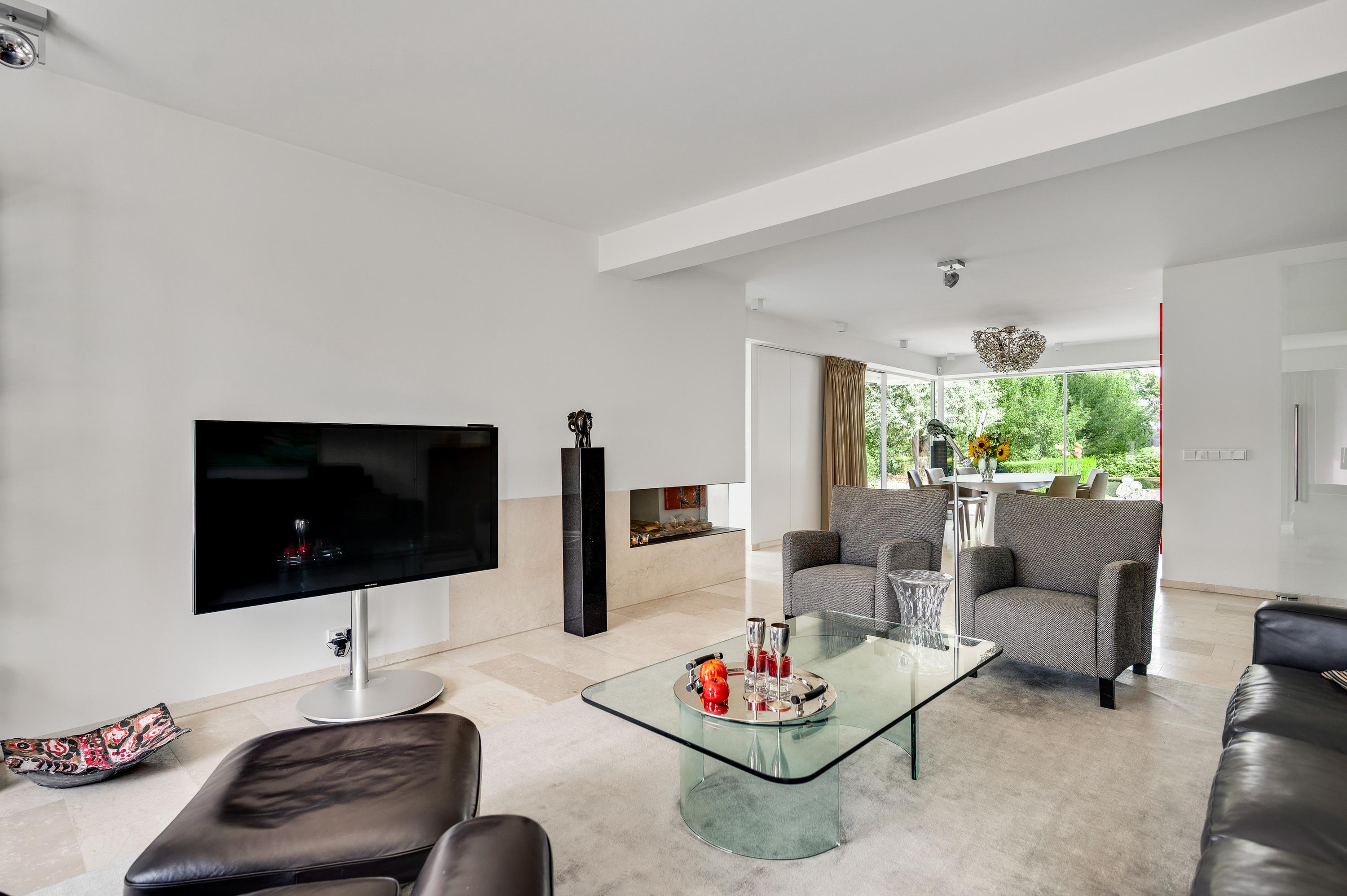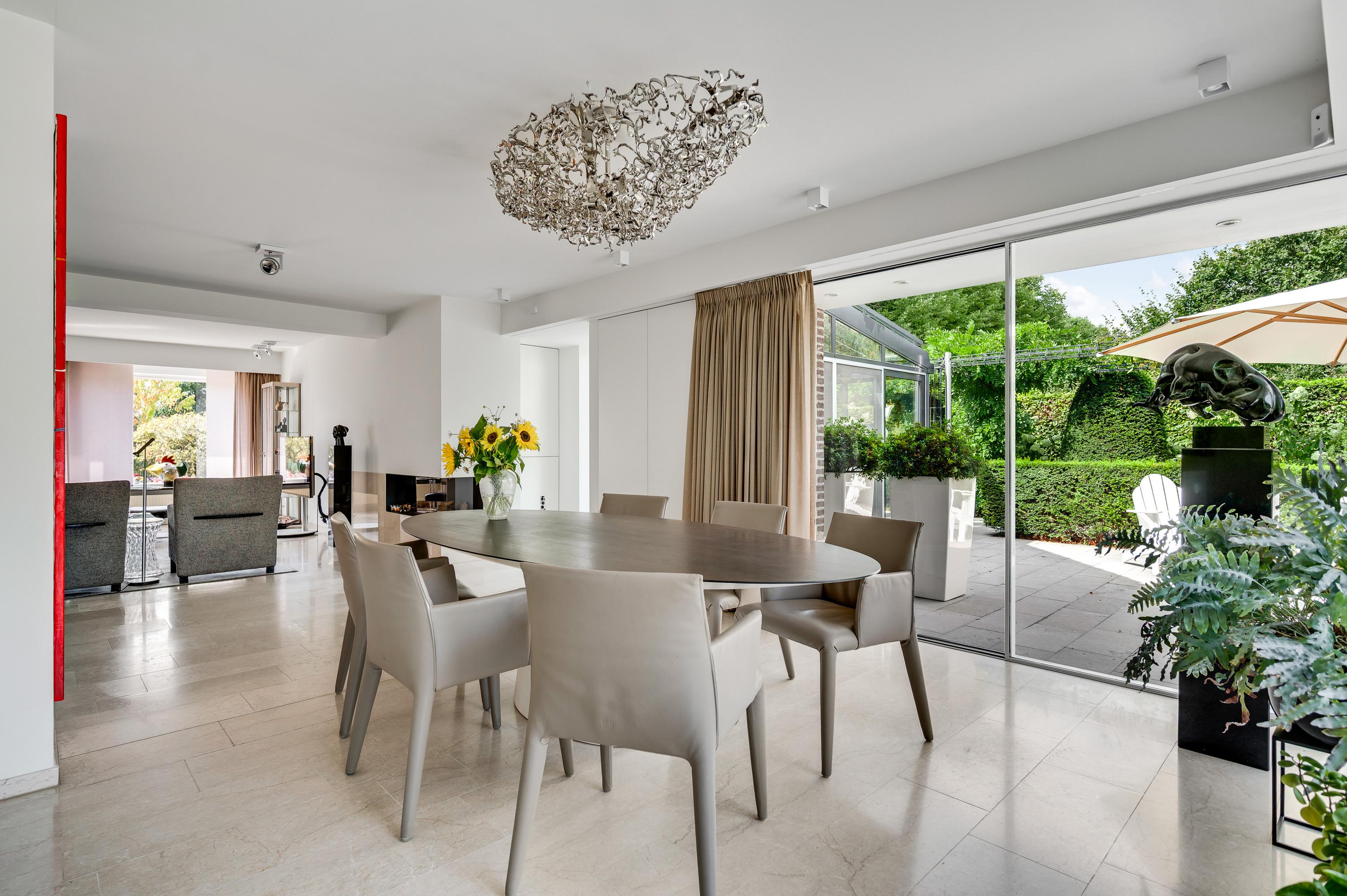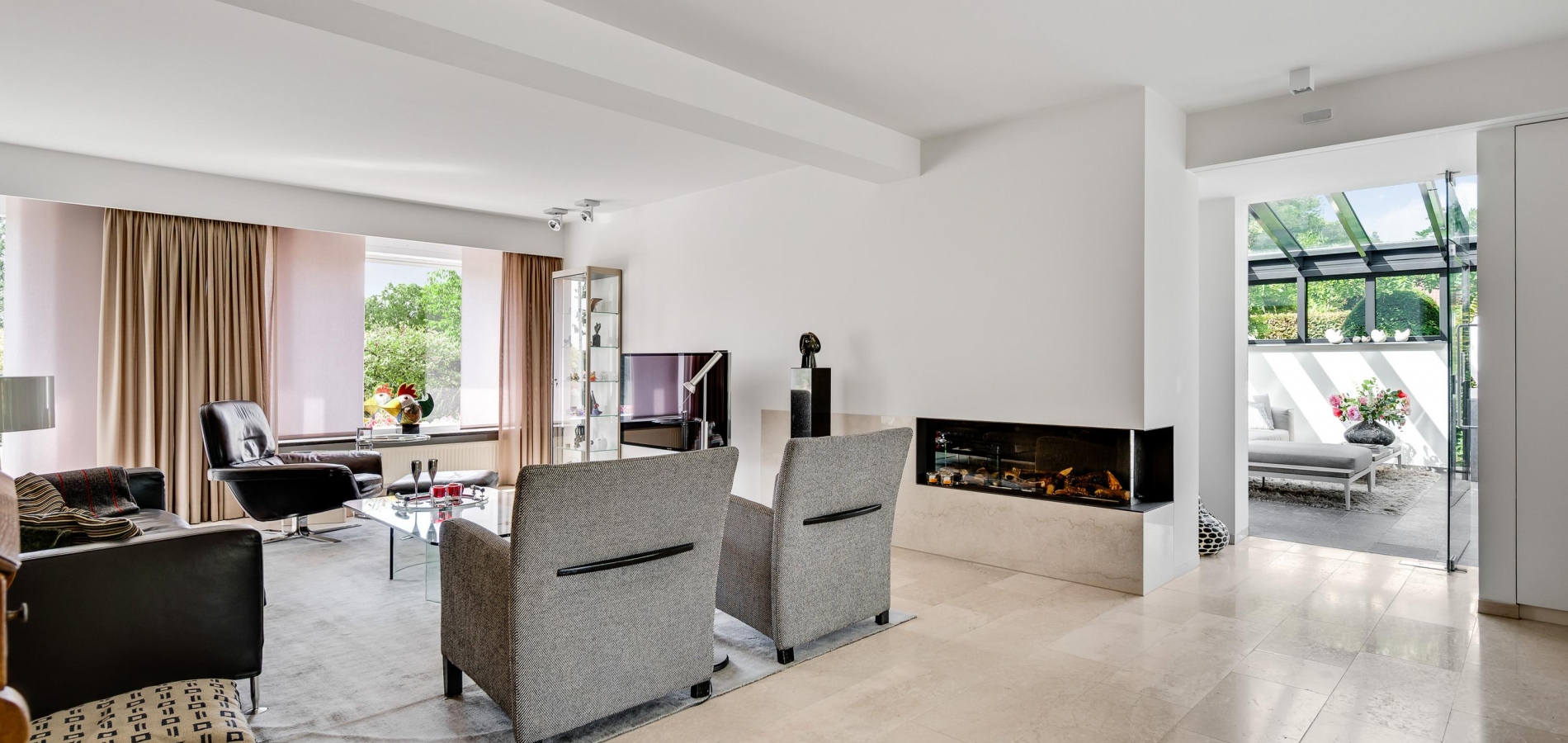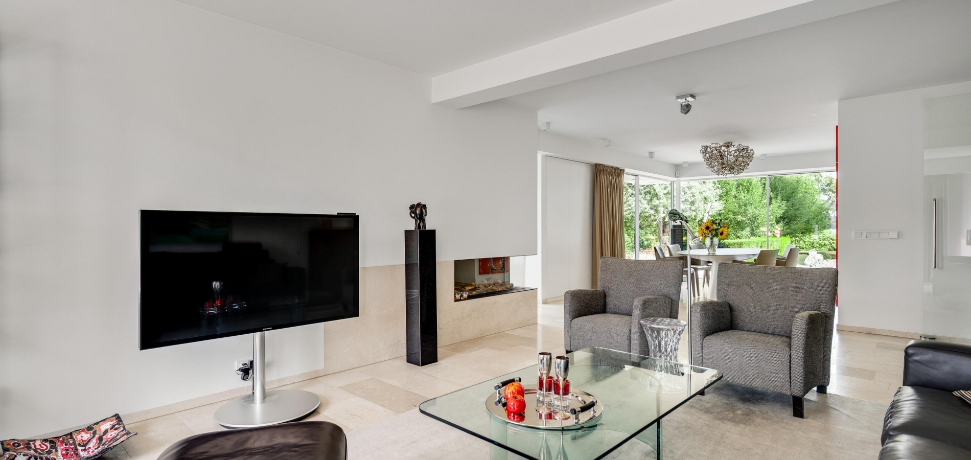 Aan het einde van de hal loopt u linksaf de woon-/eetkamer in, met een oppervlakte van bijna 60 m2. Het zitgedeelte is aan de voorzijde, bij de brede designhaard, en het eetgedeelte aan de achterzijde is de perfecte plek om stijlvol te dineren met vrienden of familie. Vlak naast de woonkamer is de serre van circa 35 m2, met schuifdeuren naar het terras en aan drie kanten uitzicht naar de tuin.