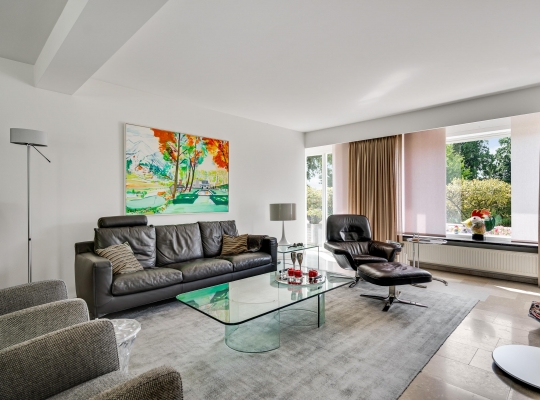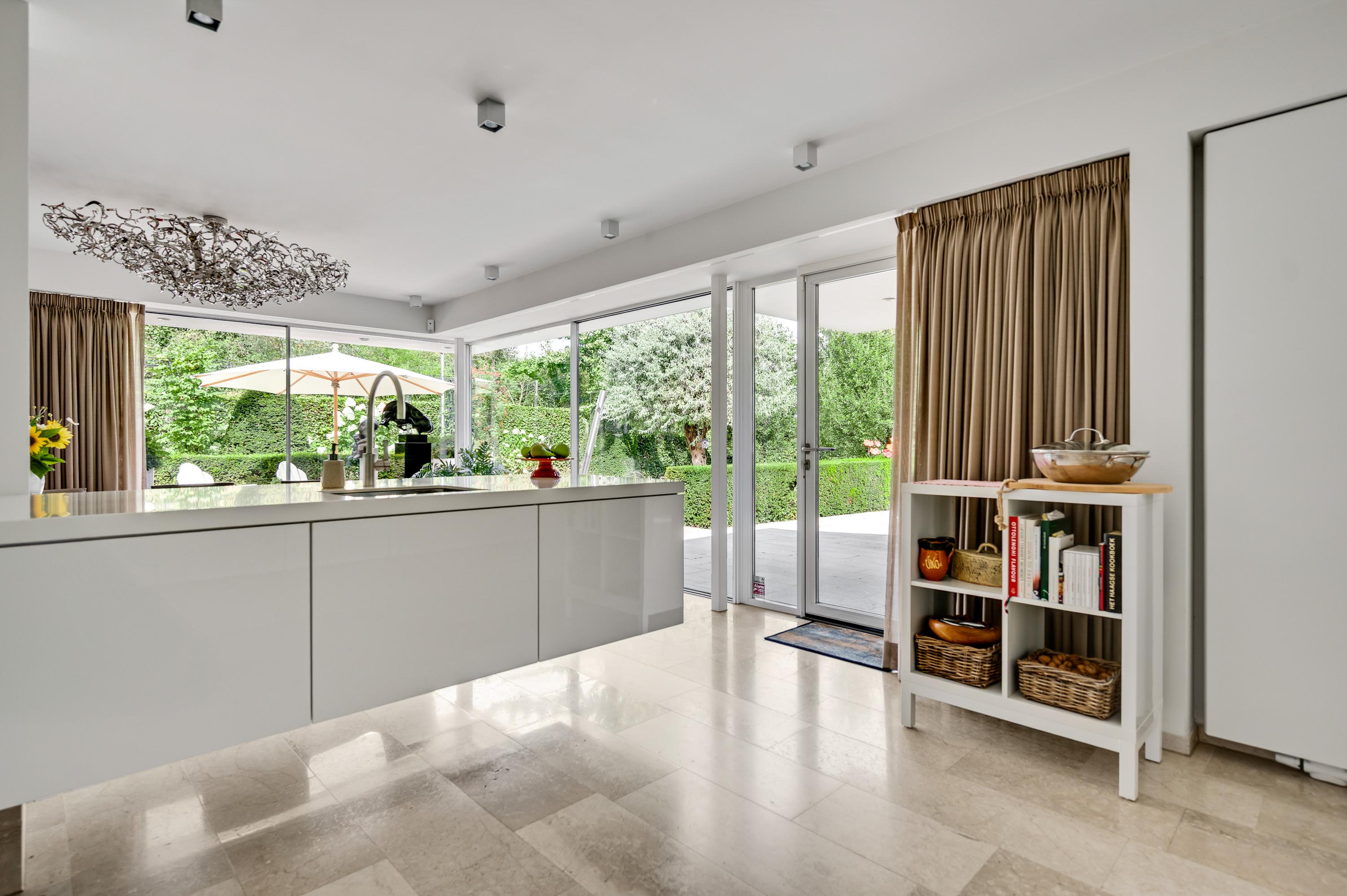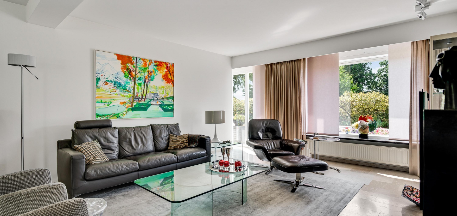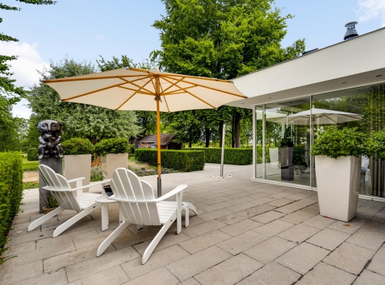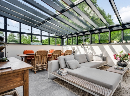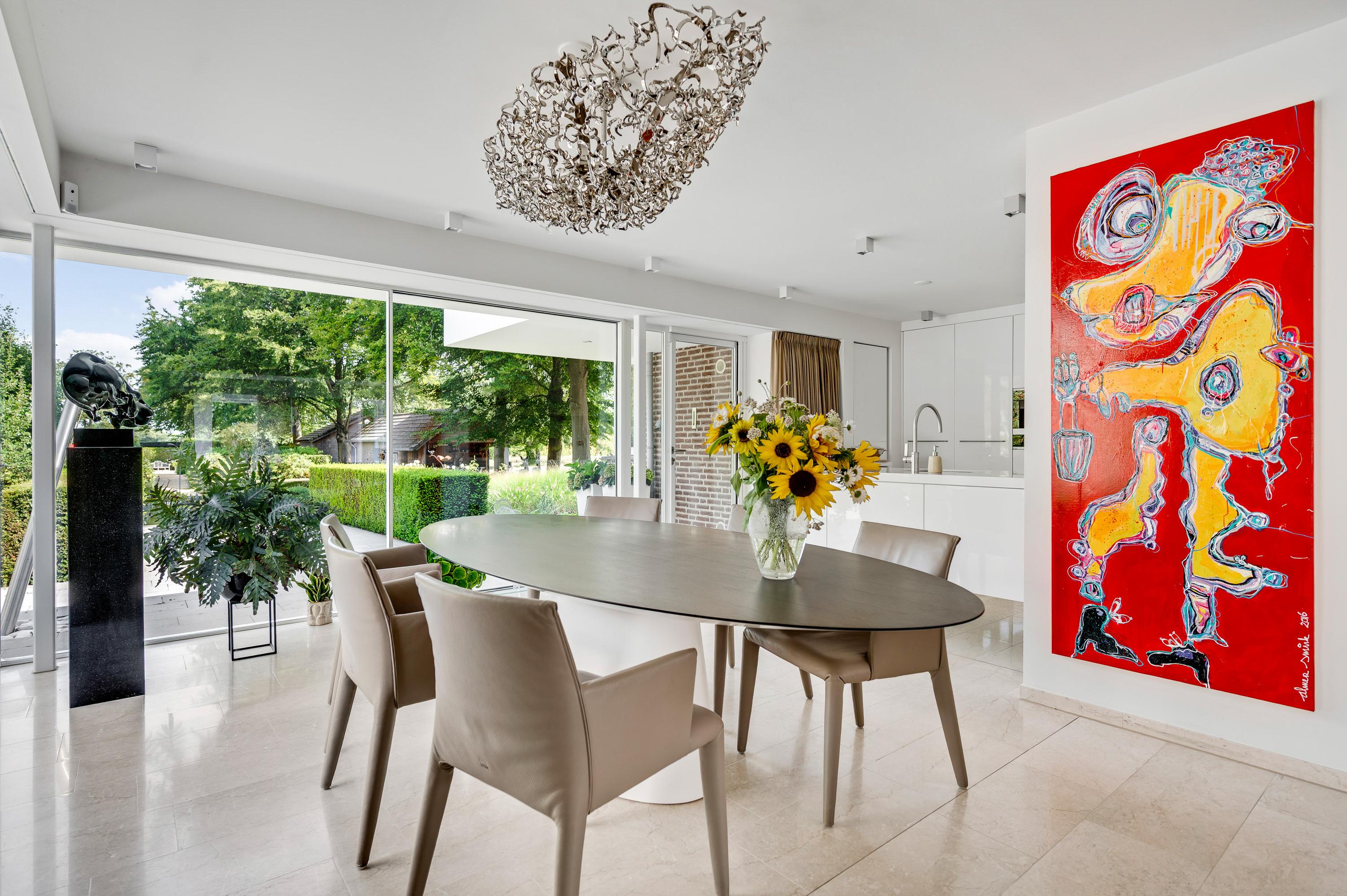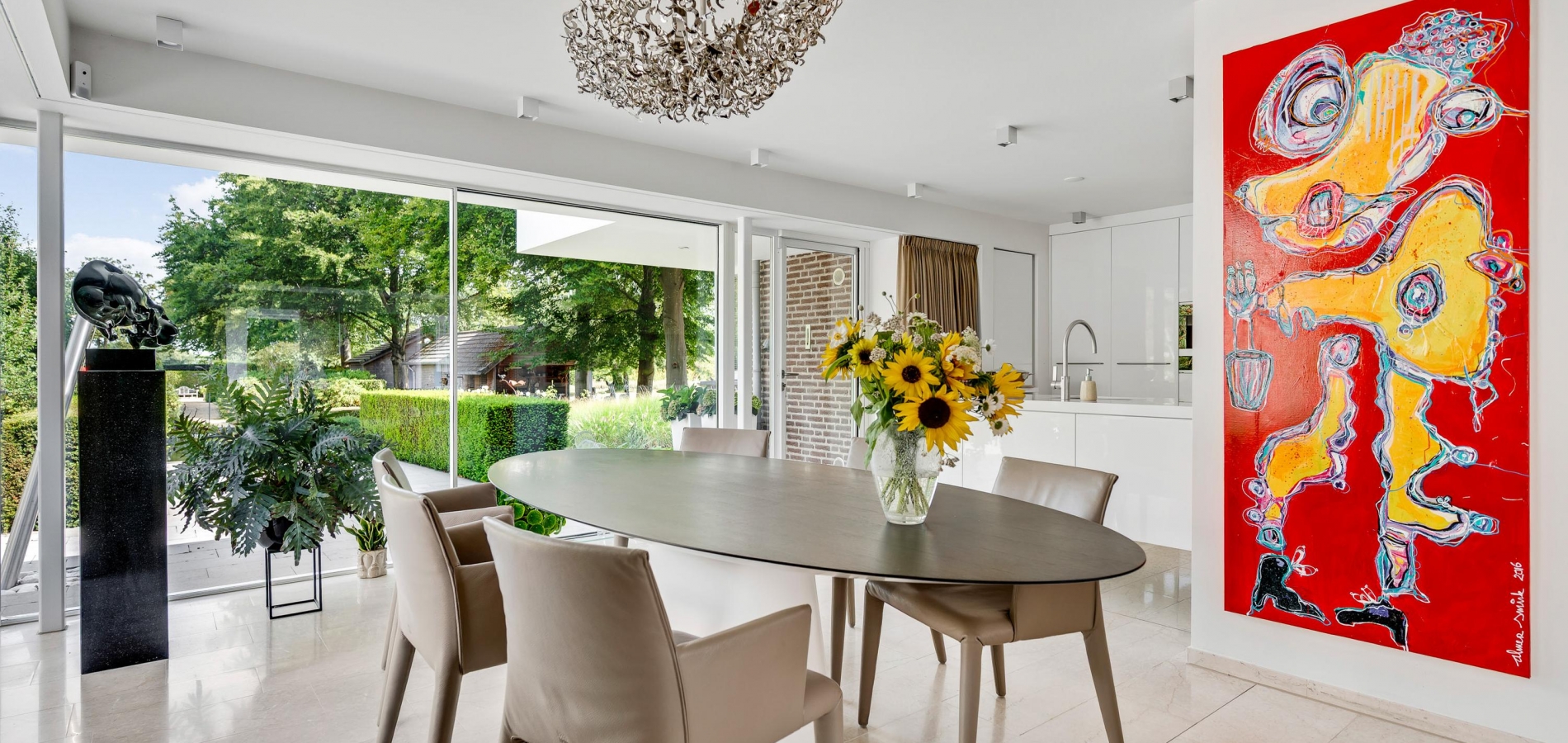 Aan het einde van de hal loopt u linksaf de woon-/eetkamer in, met een oppervlakte van bijna 60 m2. Het zitgedeelte is aan de voorzijde, bij de brede designhaard, en het eetgedeelte aan de achterzijde is de perfecte plek om stijlvol te dineren met vrienden of familie. Vlak naast de woonkamer is de serre van circa 35 m2, met schuifdeuren naar het terras en aan drie kanten uitzicht naar de tuin.
