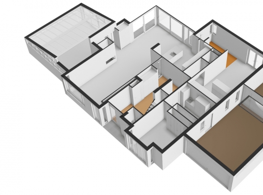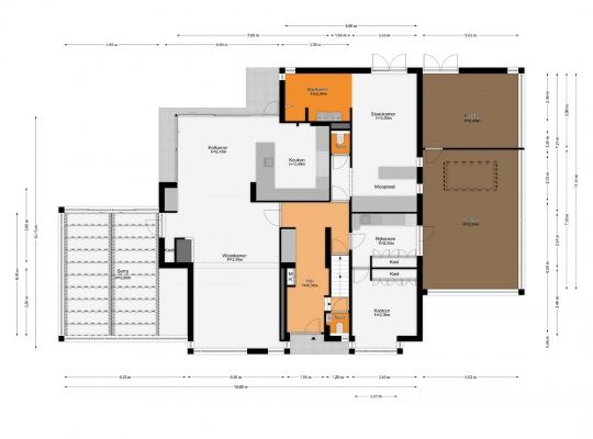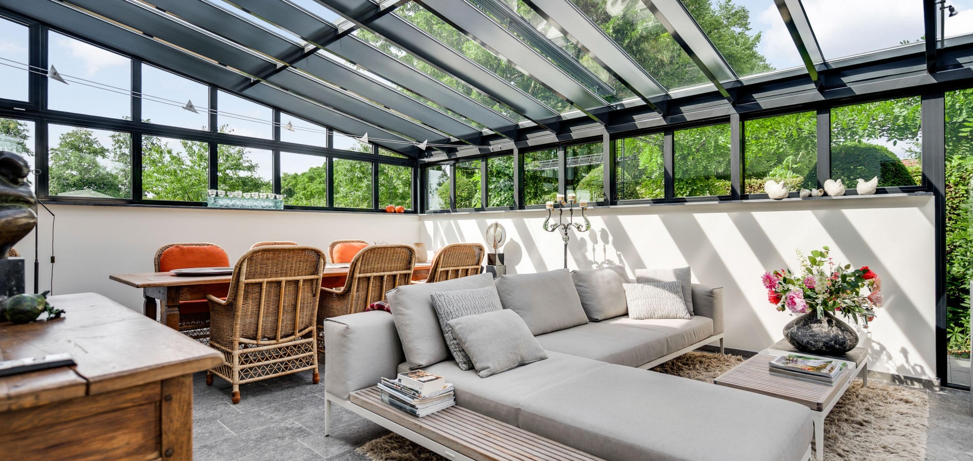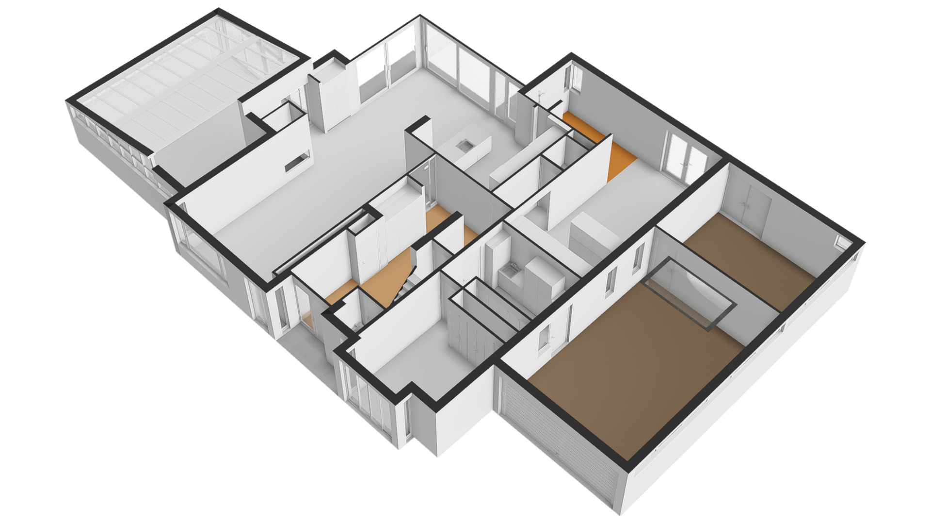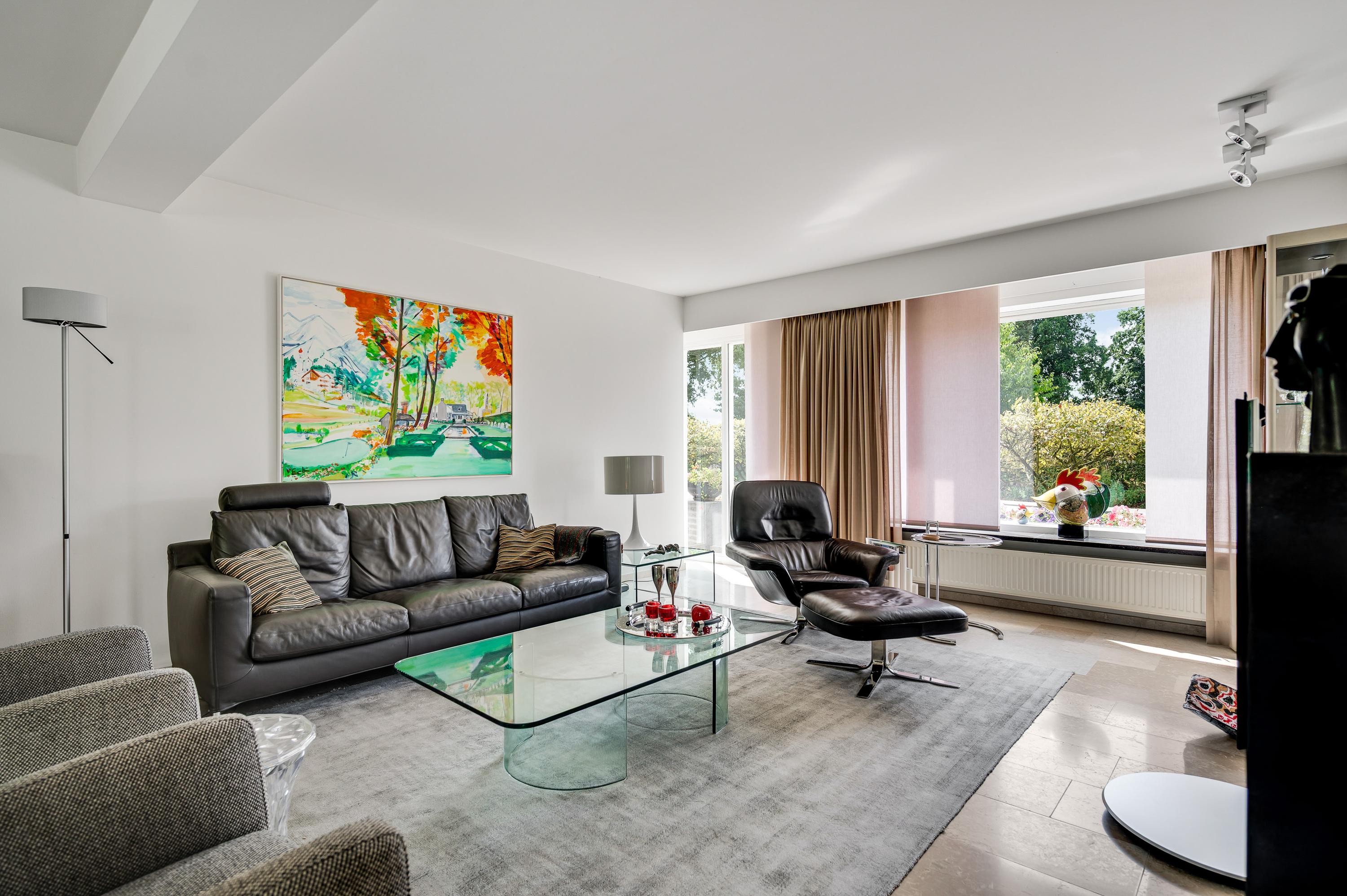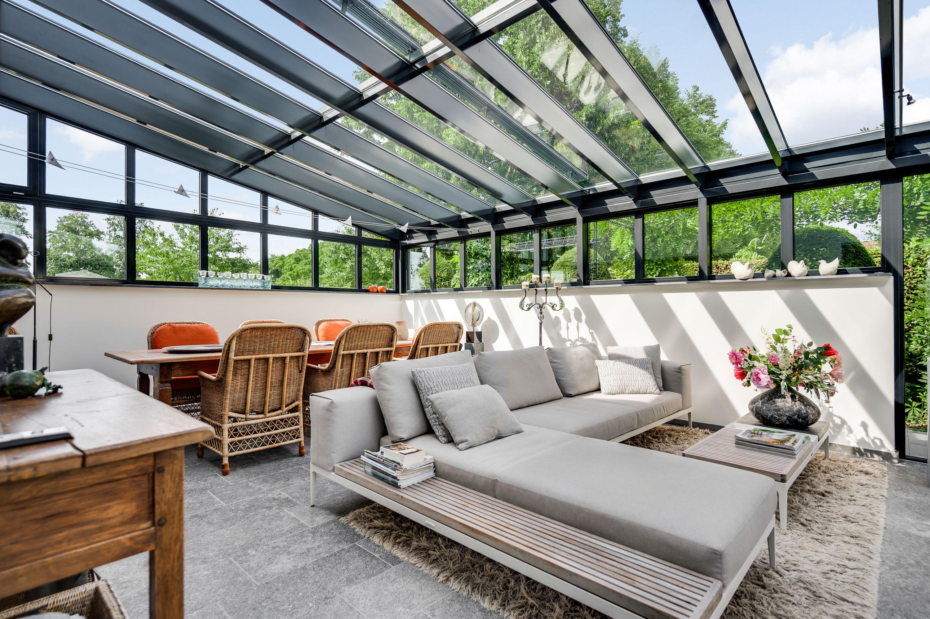 Aan het einde van de hal loopt u linksaf de woon-/eetkamer in, met een oppervlakte van bijna 60 m2. Het zitgedeelte is aan de voorzijde, bij de brede designhaard, en het eetgedeelte aan de achterzijde is de perfecte plek om stijlvol te dineren met vrienden of familie. Vlak naast de woonkamer is de serre van circa 35 m2, met schuifdeuren naar het terras en aan drie kanten uitzicht naar de tuin.